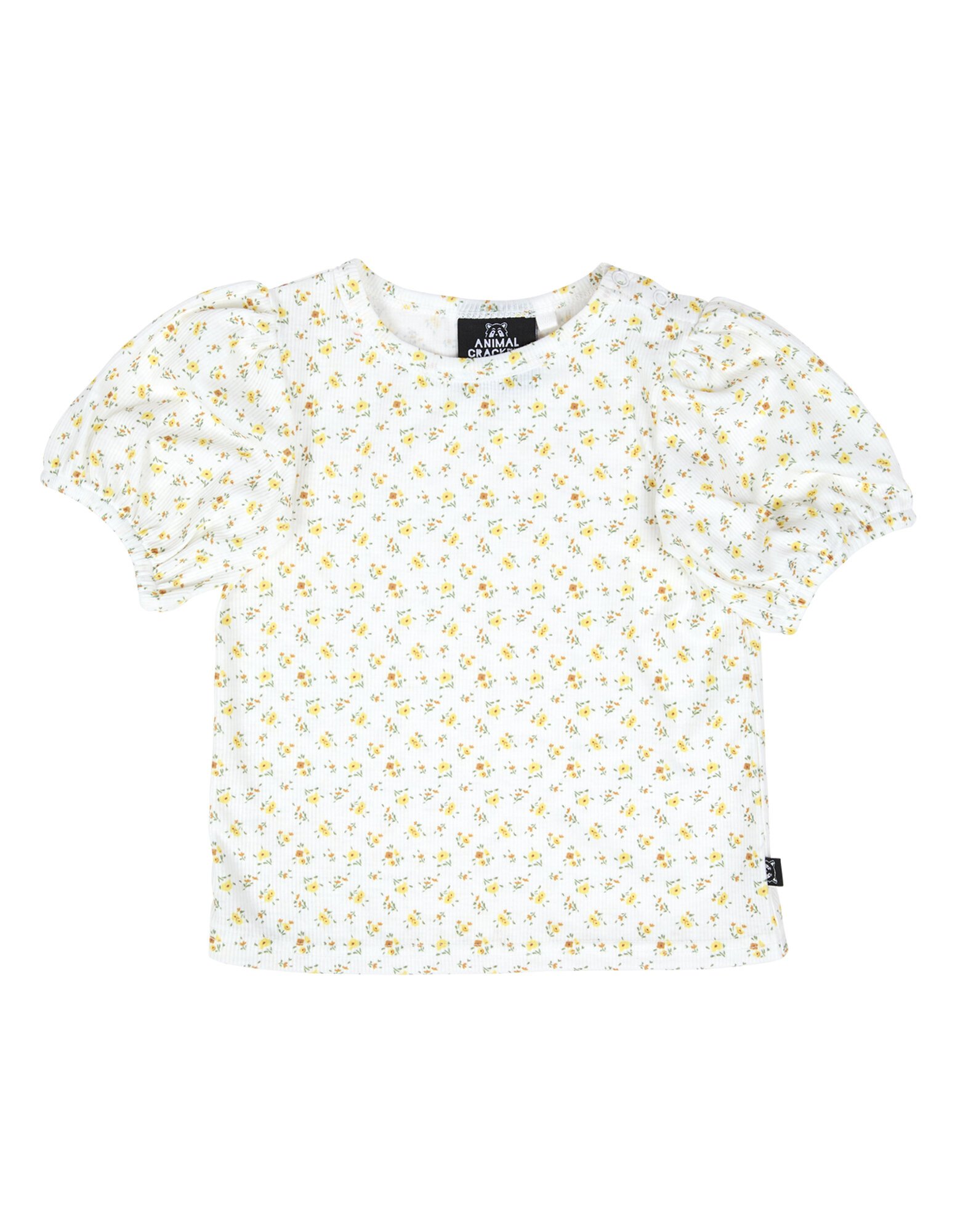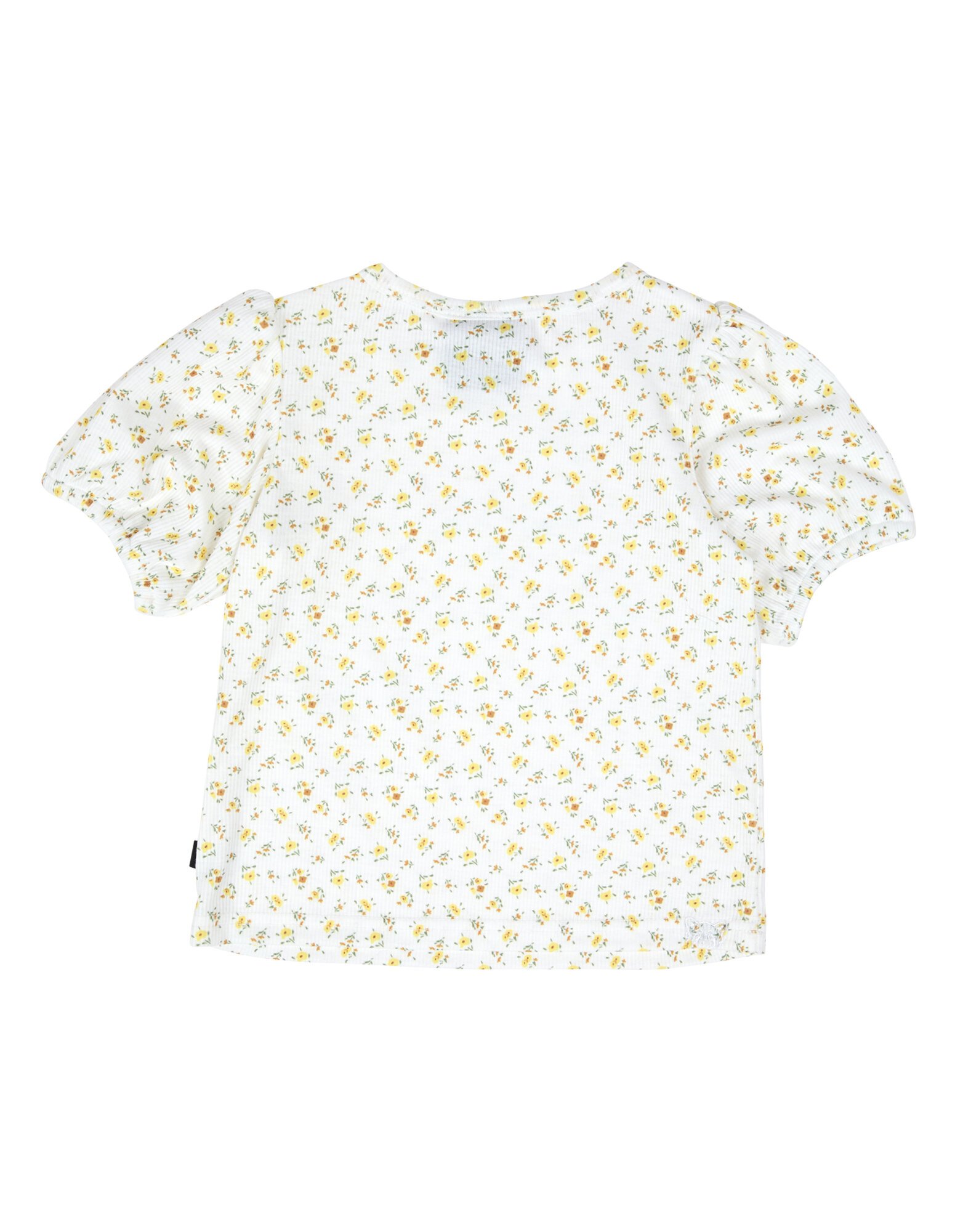 The Blooms Top by Animal Crackers is a super cute update on a rib tee. Made from a super stretchy rib, it features an all over floral yardage print, puff sleeves with elastic cuffs and a round neck finished with snap closure on side neck for easy wear. The perfect top to team back with any short or skirt this summer.