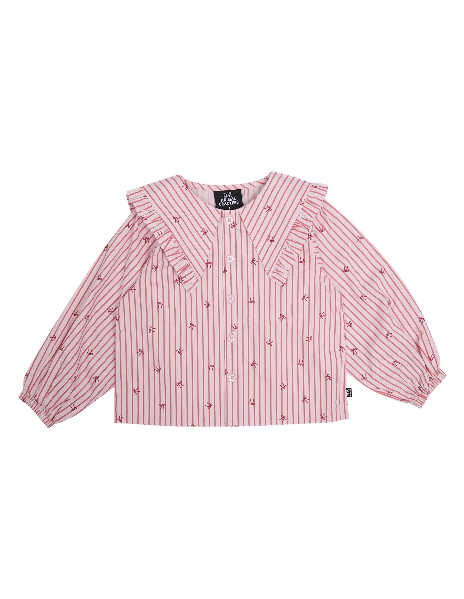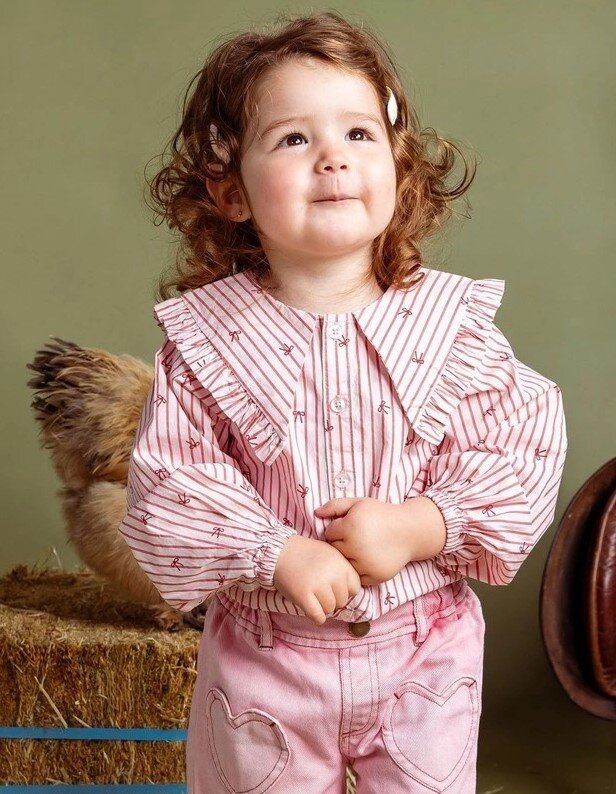 The Bow Shirt by Animal Crackers is made from yarn dyed 100% cotton fabric for a soft, breathable feel that's gentle on young skin. Designed for everyday comfort, the lightweight fabric allows easy movement while remaining durable enough for active play. It features an oversized collar with frill detail, centre front button closure and elastic cuff sleeves. Easy to style and wear, this classic shirt pairs effortlessly with the Heart Jean, making it a reliable staple for any toddler wardrobe.