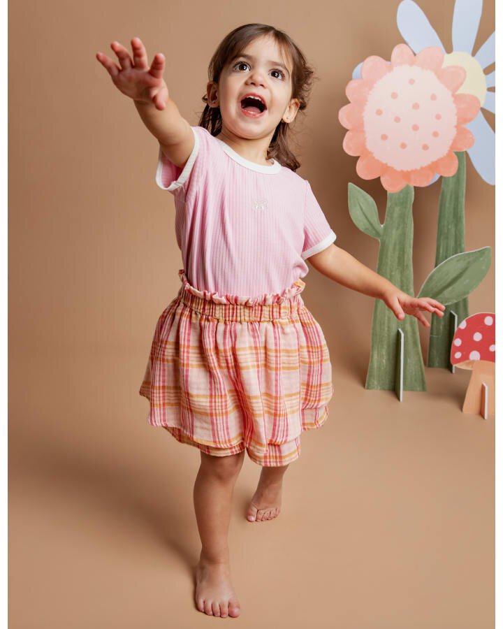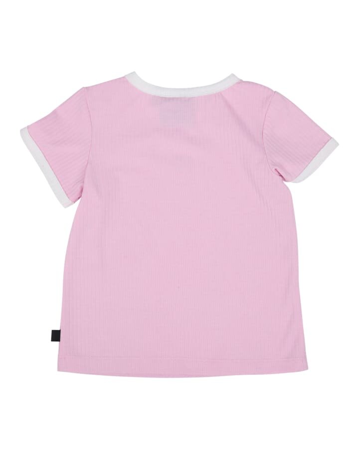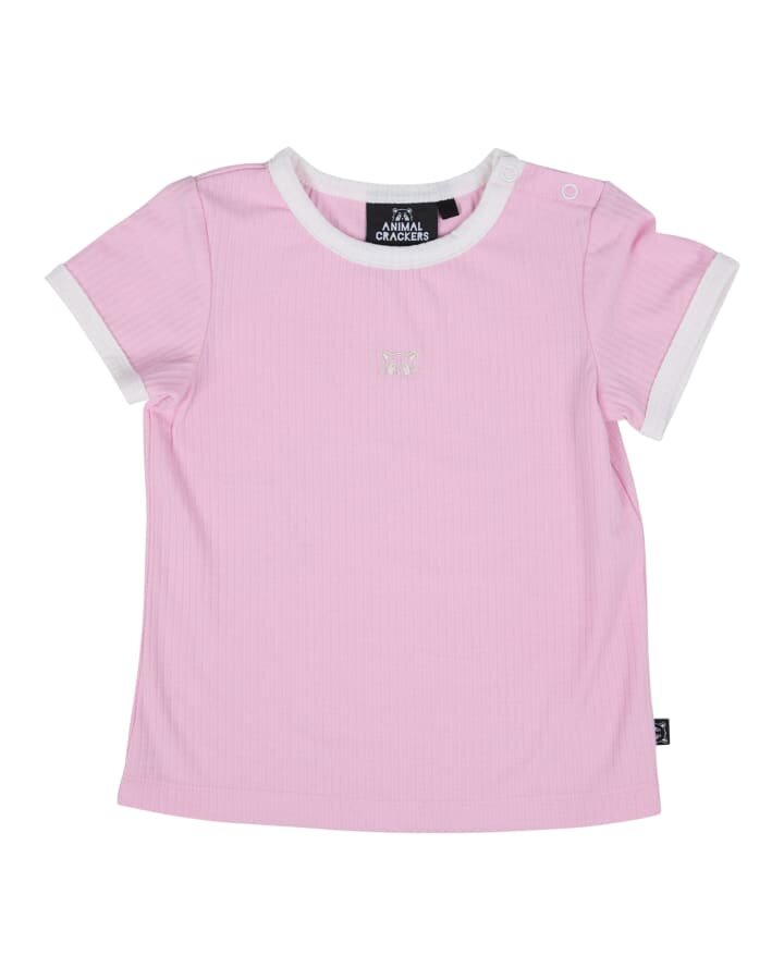 The Varied Tee by Animal Crackers features contrast binding, a small contrast logo embroidery at the centre front chest, snap button closure at side neck, and branded flag label on side seam. Made from a stretch rib material, it's an easy to wear tee that can be paired back with any skirt or short in the Animal Crackers range.