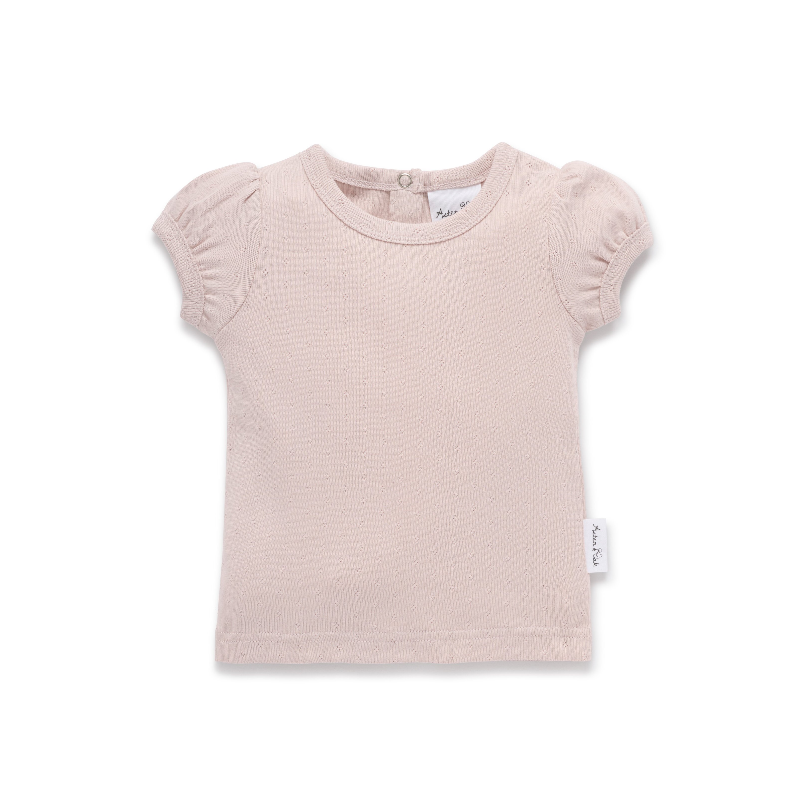 Made from GOTS, certified organic cotton, the Aster & Oak bloom pointelle ruffle top features a gathered puff sleeve, pointtelle stitching throughout and premium snap button closures to the back for easy changes. 100% Certified organic cotton #USB008294. Made in India. Wash according to care instructions.