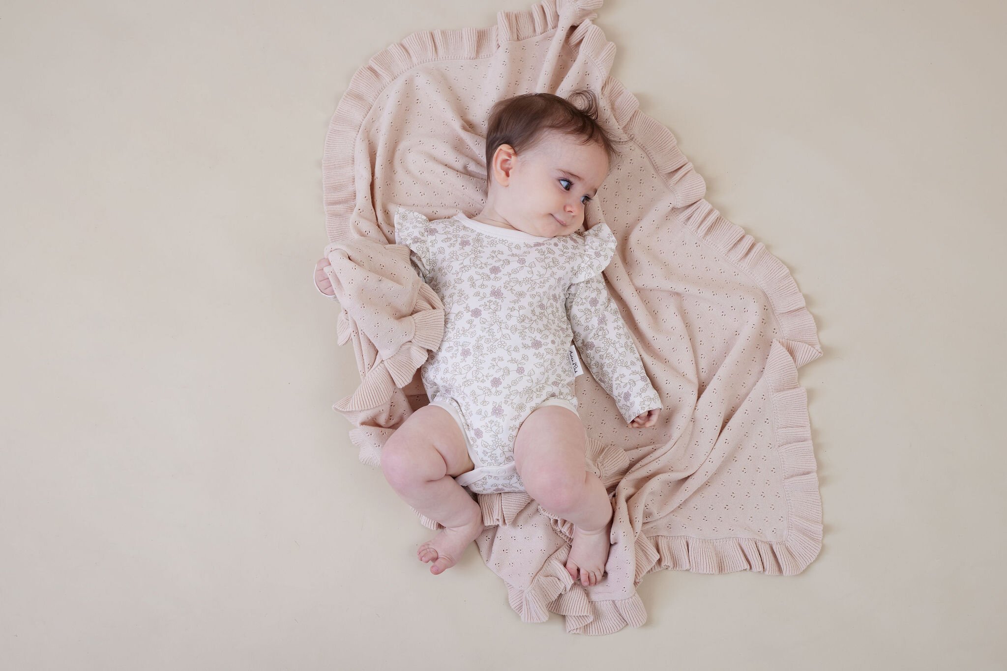 Made from GOTS certified organic cotton, the onesie features a delicate all over floral print, long sleeve with ruffle to shoulder and premium snap buttons to the shoulder and gusset for easy changes.