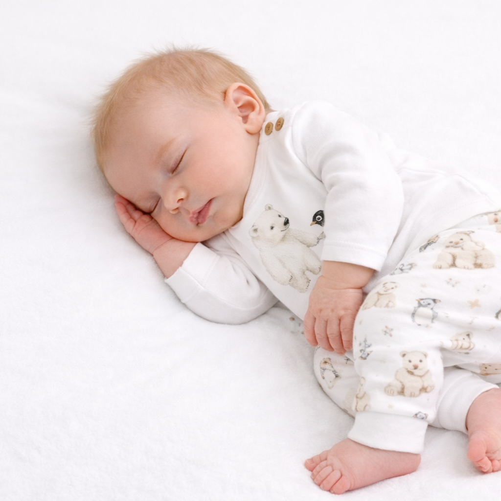 Made from GOTS certified organic cotton, this long sleeve tee comes with hand illustrated central print of a polar bear and penguin and has buttons to should for changing ease.