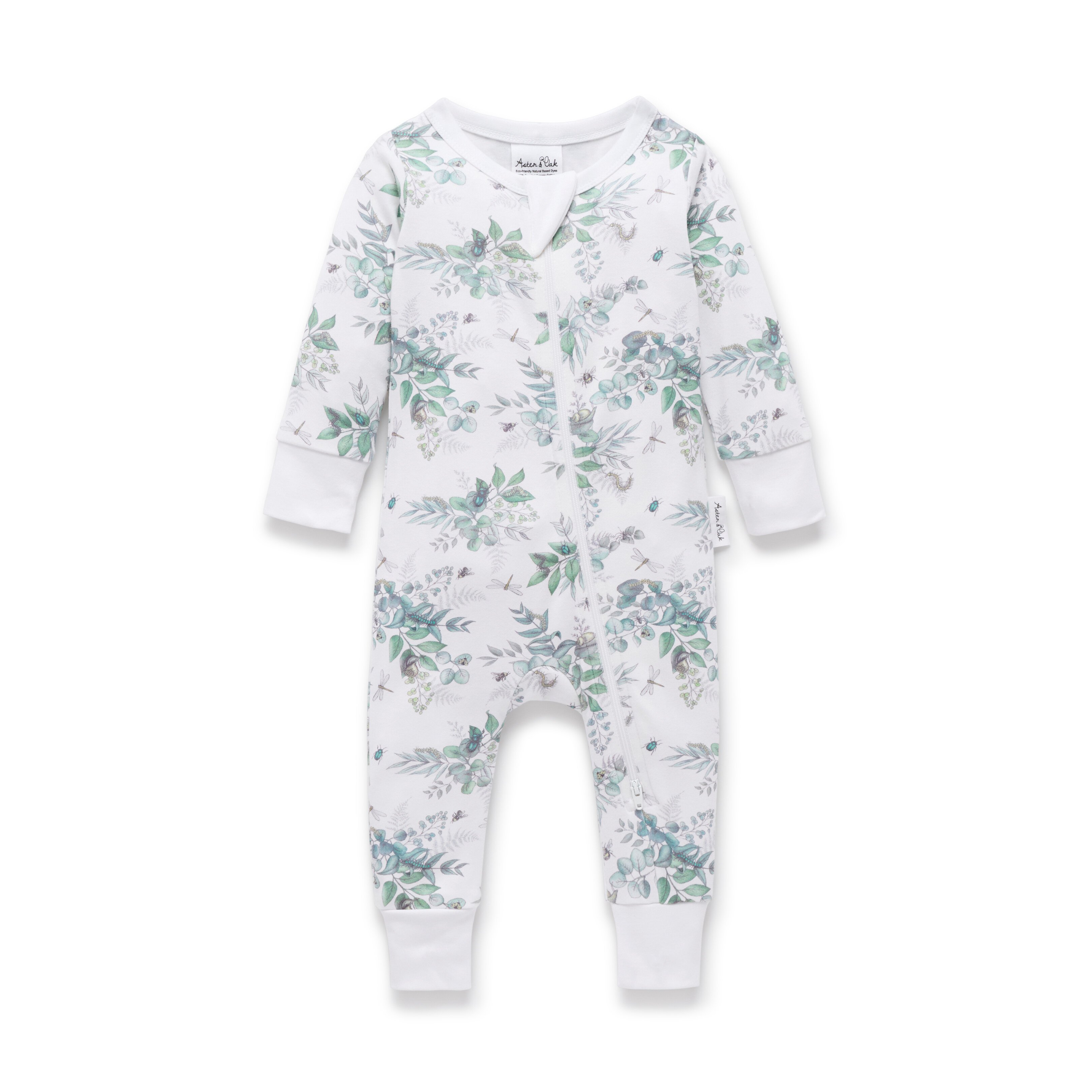 Made from GOTS, certified organic cotton, the Aster & Oak Snuggle Bug Zip Romper has long sleeves, features a neutral green hue print of foliage with bugs and premium YKK two way zippers with protective backing/zip cover. NOTE sizes NB and 0-3m come with fold over hand and feet cuffs. 100% Certified organic cotton #USB008294. Made in India. Wash according to care instructions.