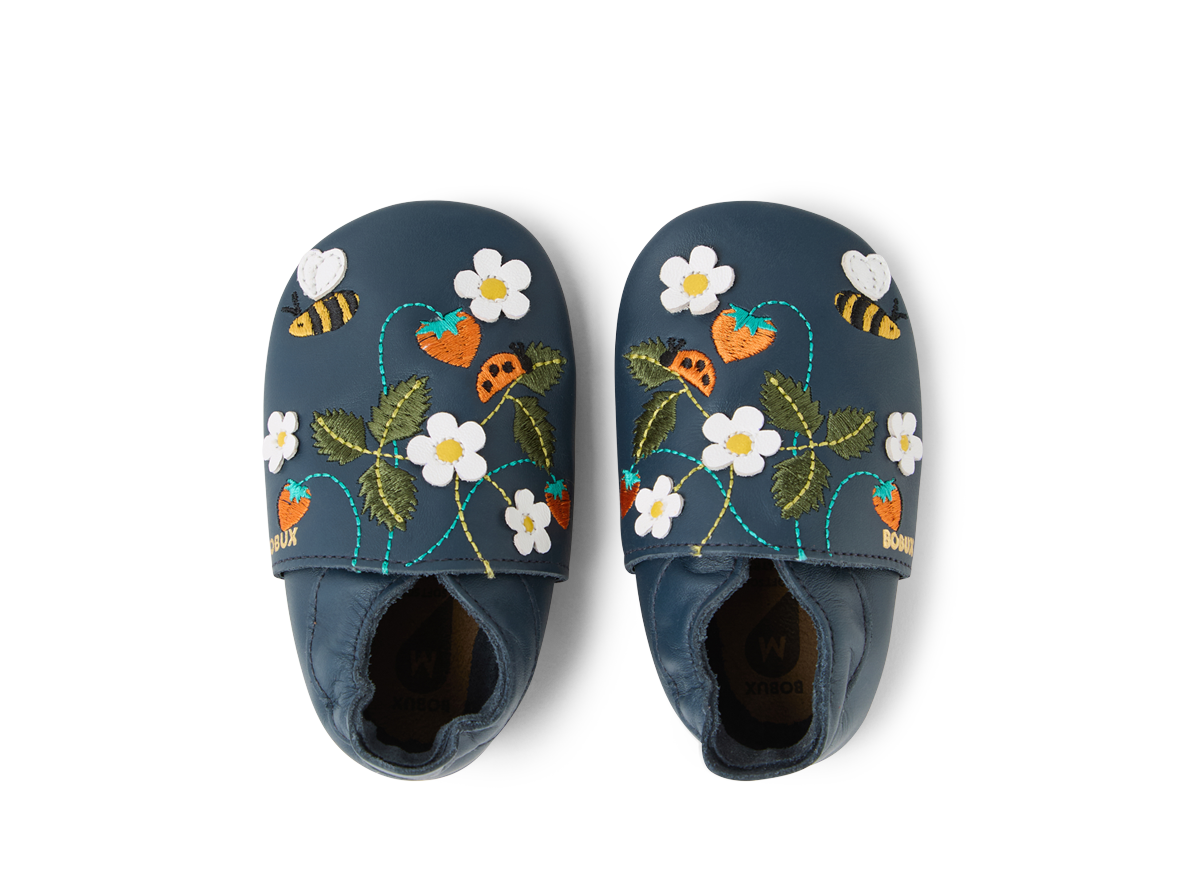 The Bobux Bug Garden Soft Sole baby shoes are a delight for little nature lovers. Crafted from soft, breathable leather, these Soft Soles are covered with sweet embroidered details that add tactile fun to their first pair of shoes. Elasticated for a snug fit, the Bug Garden design is easy to slip on and off, and is finished with a soft suede sole that lets little toes move and flex.