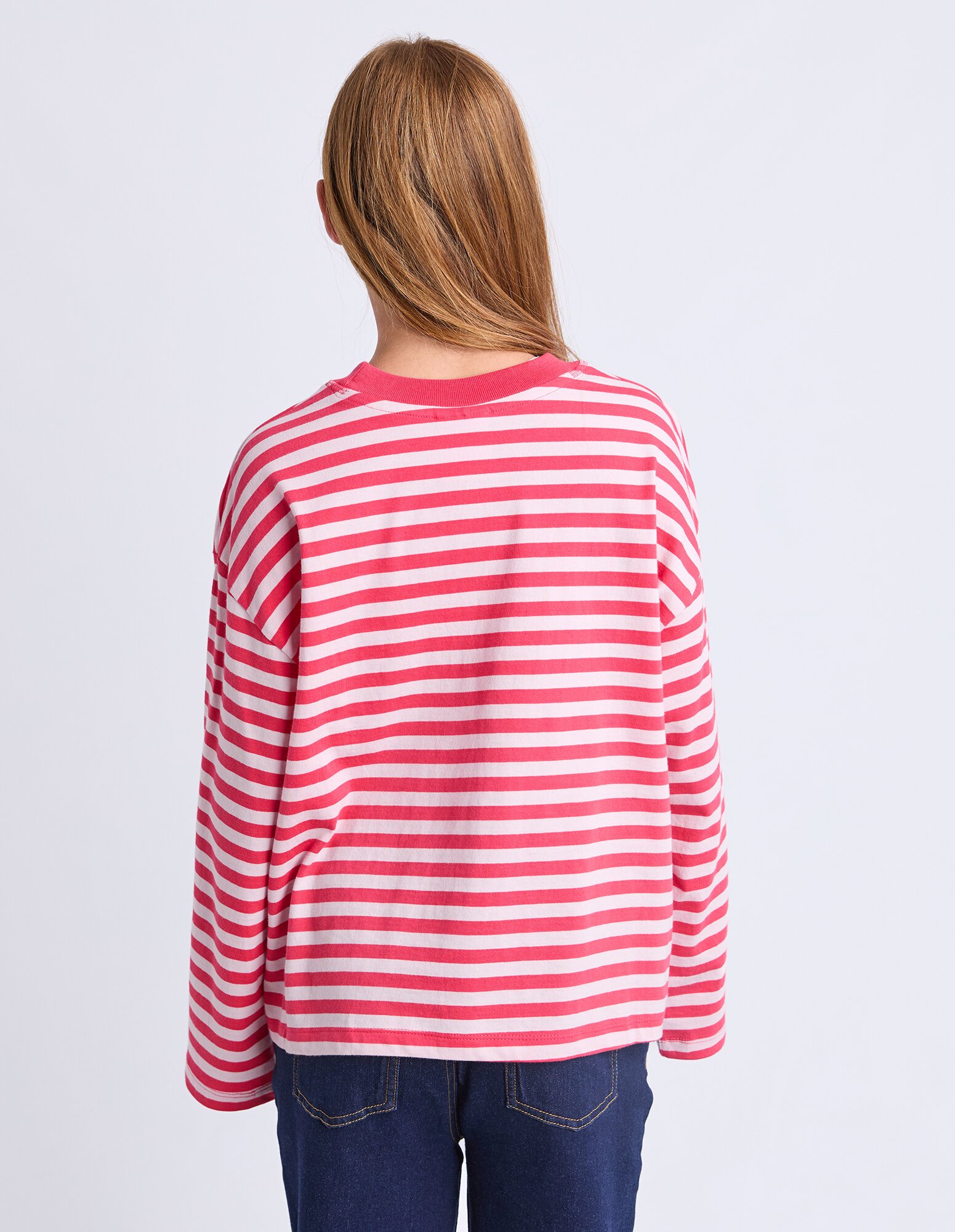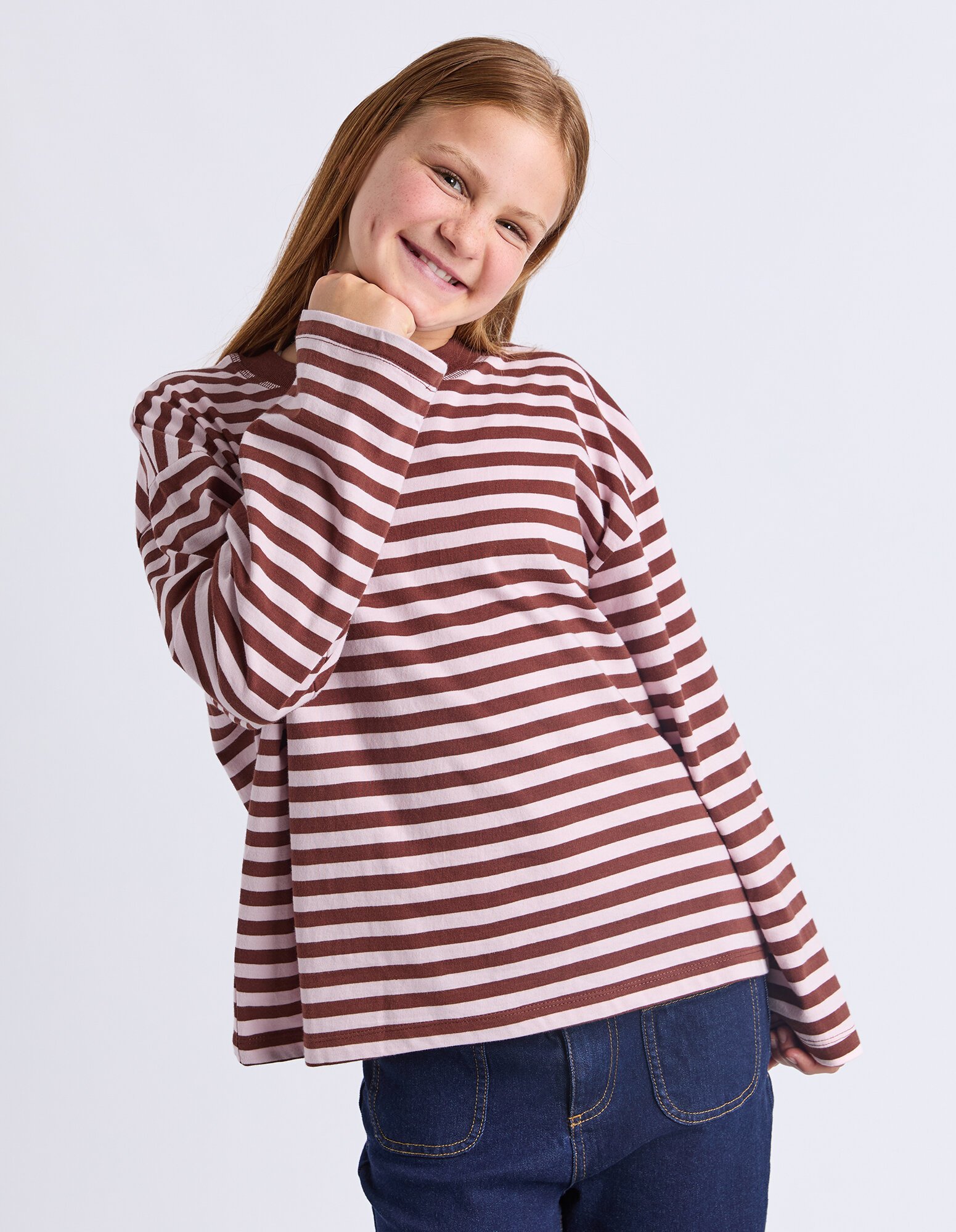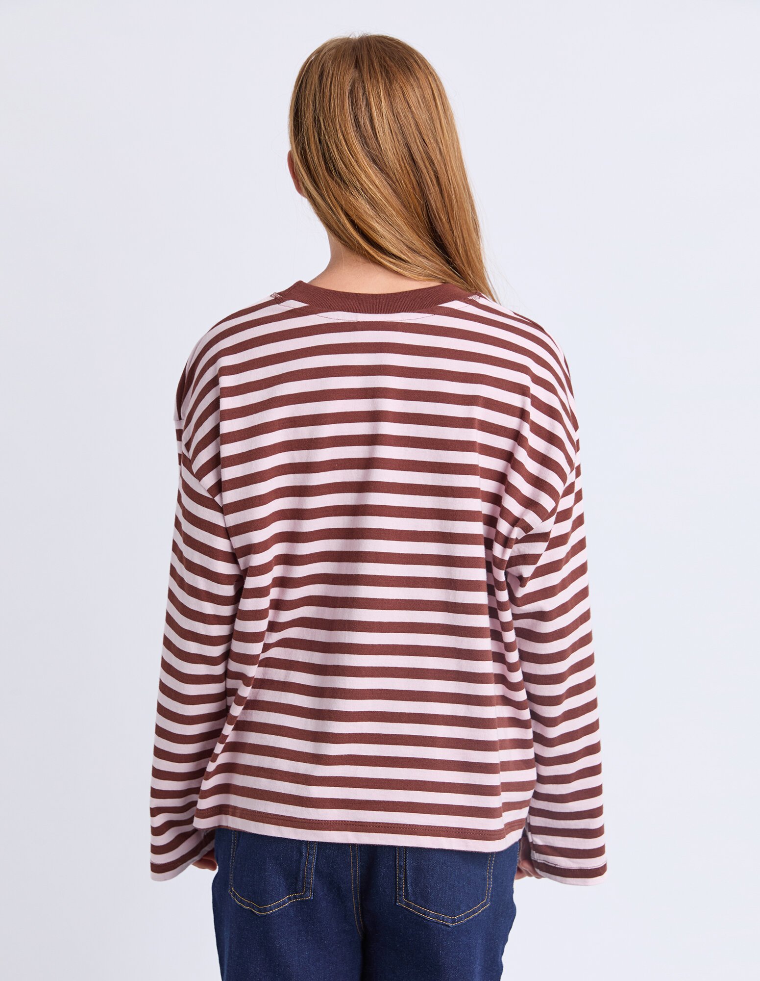 Embrace trendy and cute this season with the Brookyln Stripe Long Sleeve Tee by Eve Girl. This style has a long sleeve, boxy fit, and features an all over yarn dyed stripe design. Complete with flatlock top stitching and a branded badge, this tee is perfect for everyday wear.