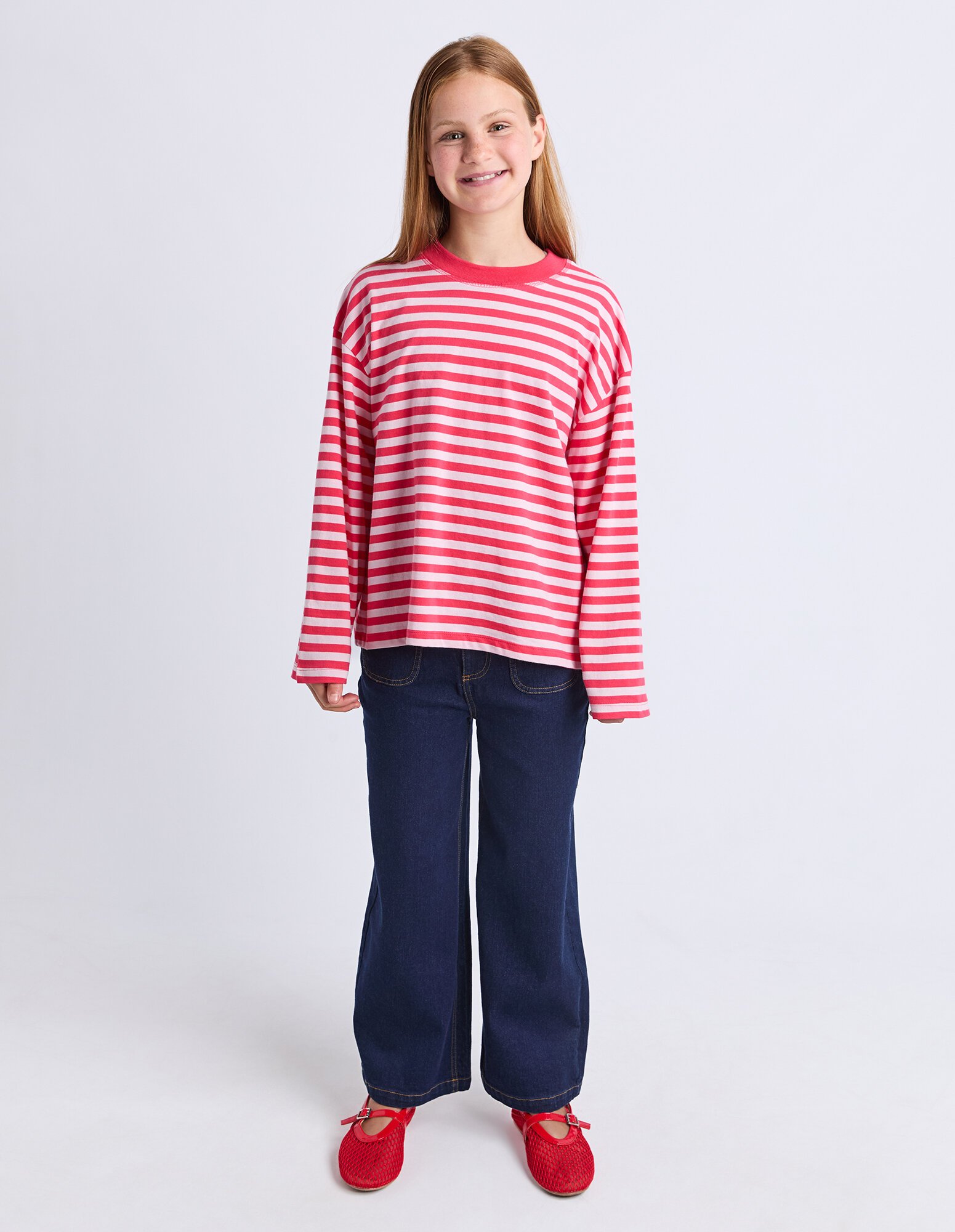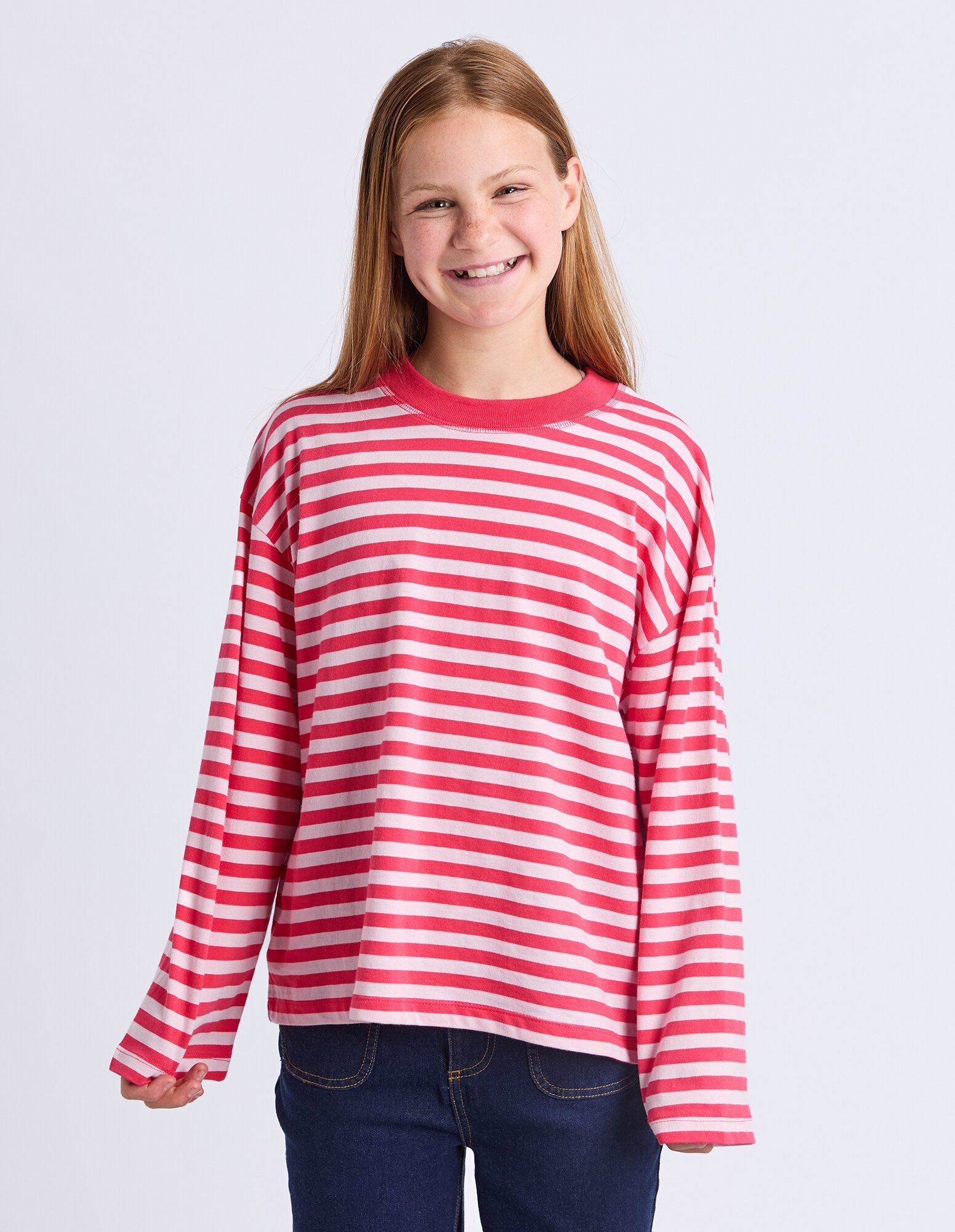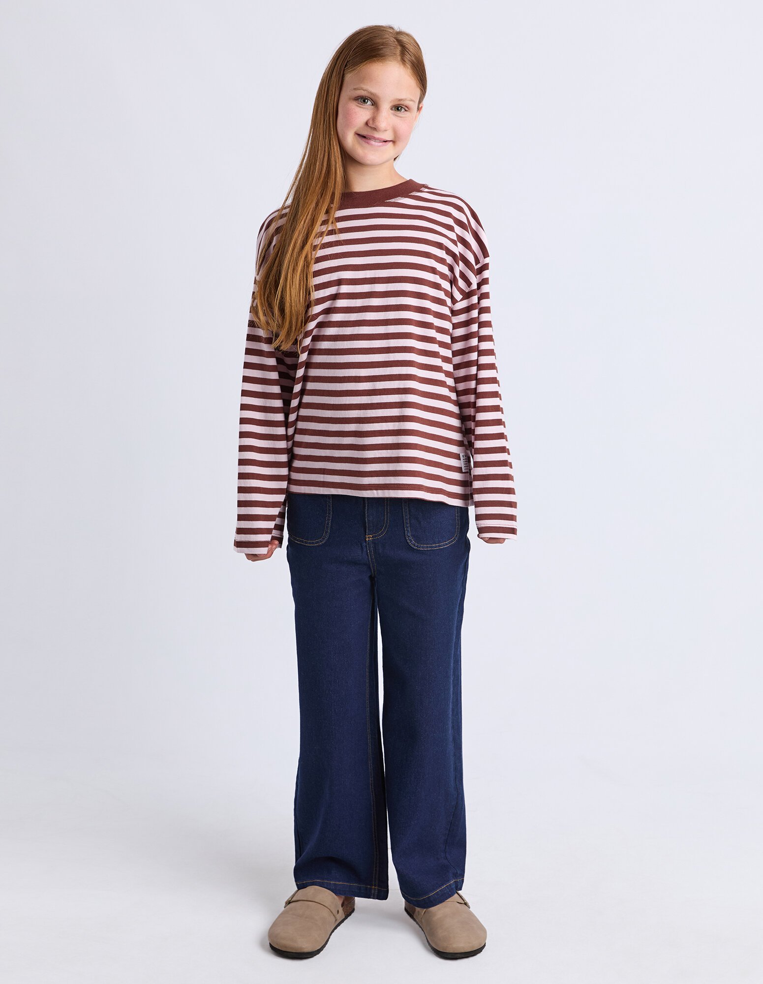Embrace trendy and cute this season with the Brookyln Stripe Long Sleeve Tee by Eve Girl. This style has a long sleeve, boxy fit, and features an all over yarn dyed stripe design. Complete with flatlock top stitching and a branded badge, this tee is perfect for everyday wear.