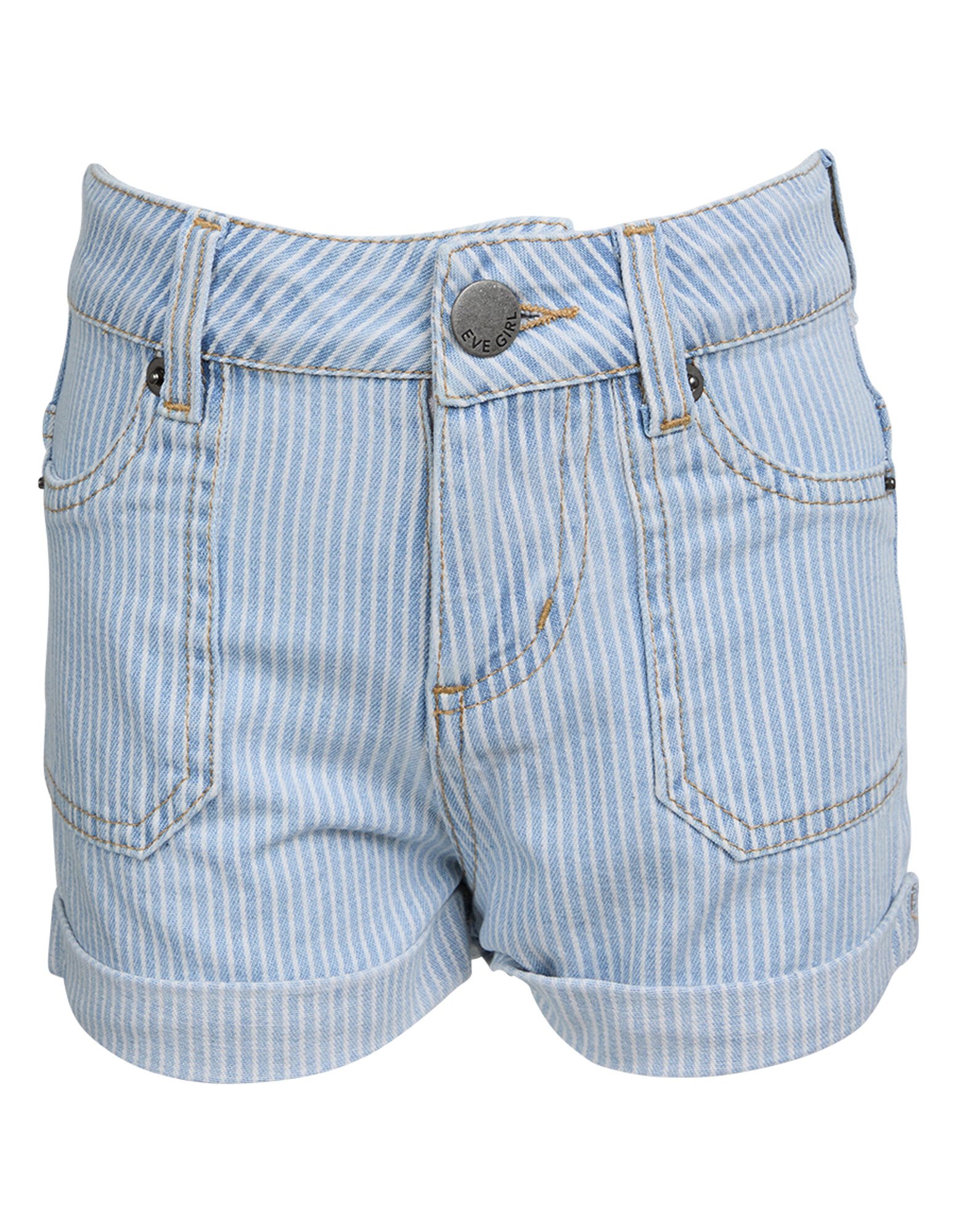 Refresh your summer denim collection with the Cleo Stripe Short by Eve Girl. These shorts feature front and back patch pockets, contrast stitching and cuffed hems on a striped denim fabrication. Perfect for pairing back with an Eve Girl graphic tee to take on the day.
