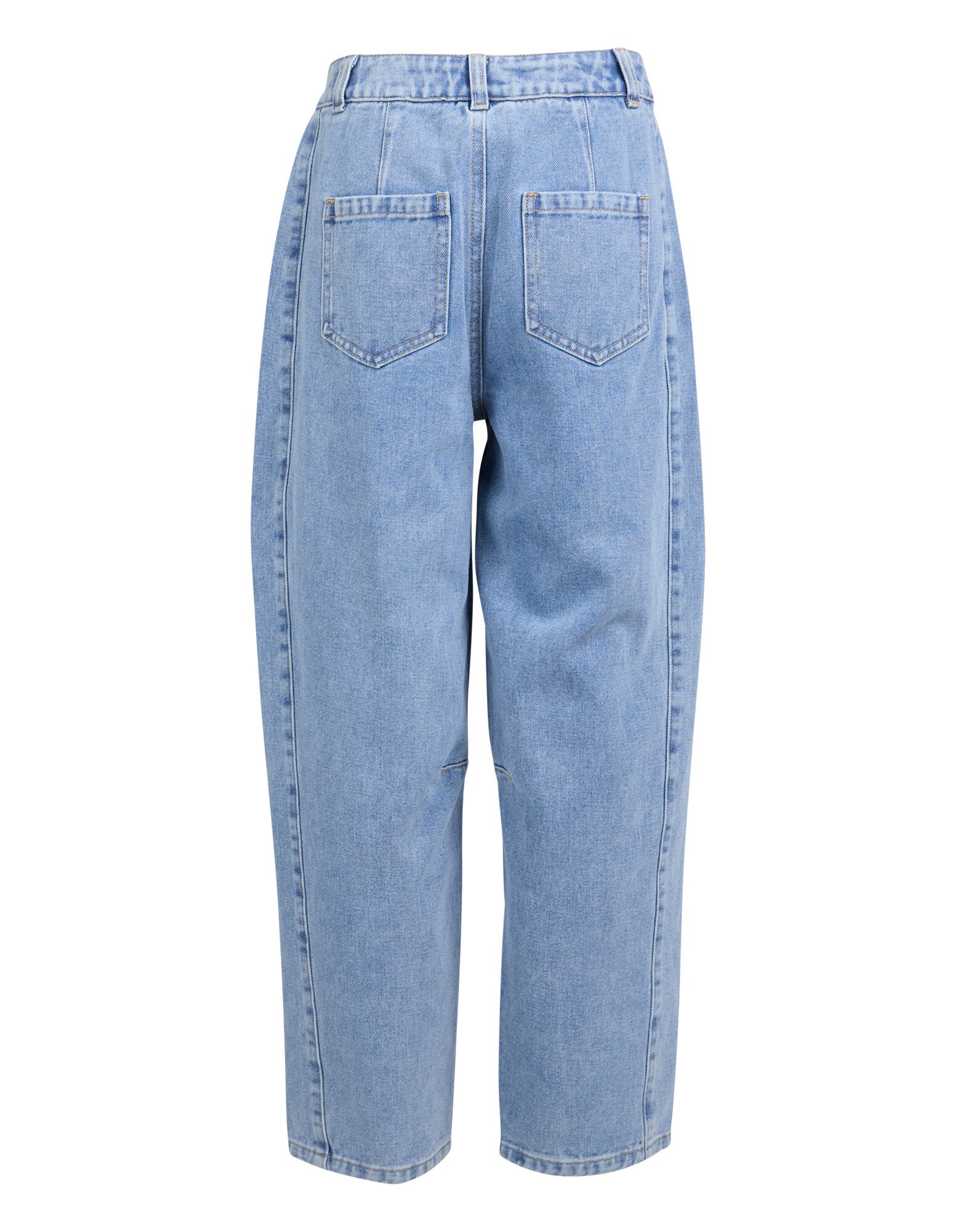 The Emily Denim Jean by Eve Girl offers a relaxed yet stylish fit with its unique barrel leg design, crafted from a rigid cotton denim fabrication. Offering a mid-rise, relaxed fit, these jeans feature a 5 pocket design, side seam panels and knee tucks for barrel shaping. The perfect trendy addition to any denim collection.