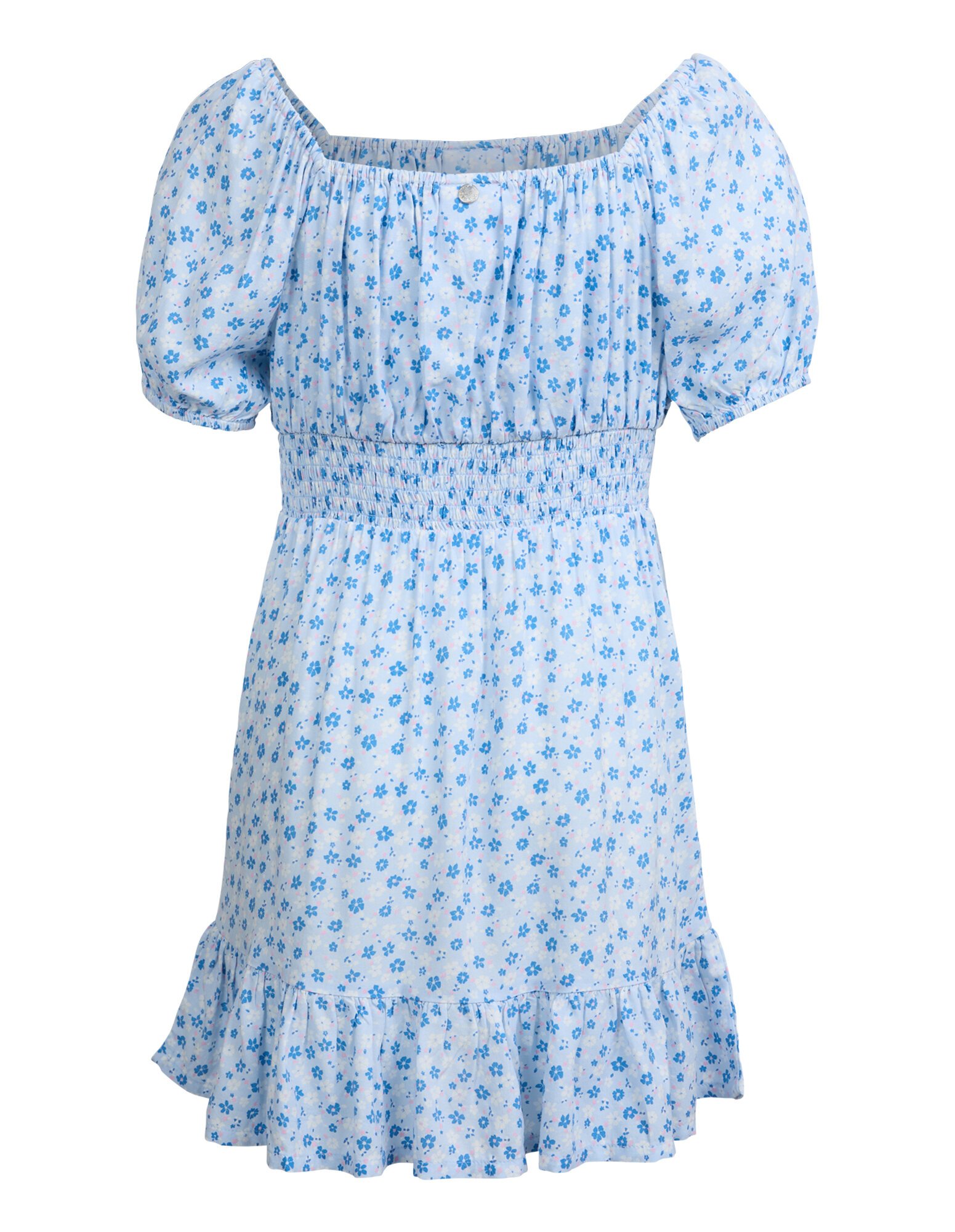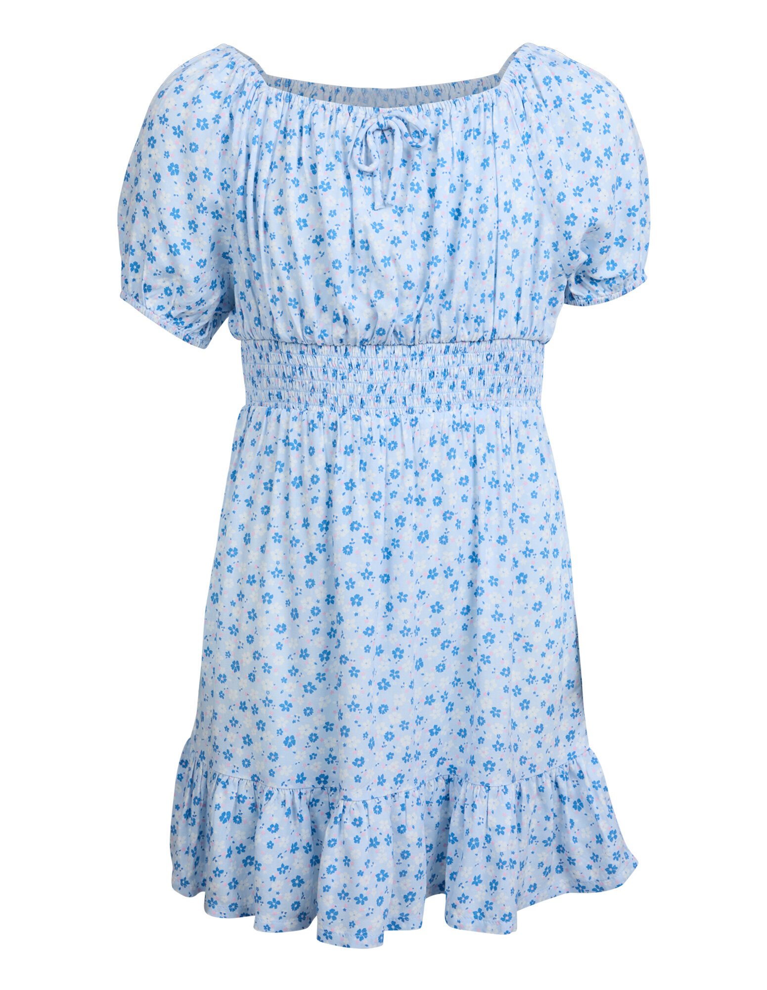 The Maude Mini Dress by Eve Girl is the perfect dress for your summer wardrobe. This style features a ditsy floral print yardage on a soft, lightweight viscose fabrication, and includes a shirring panel at the waist, self fabric tie, frill at the hem, and elasticated neckline and sleeve openings.