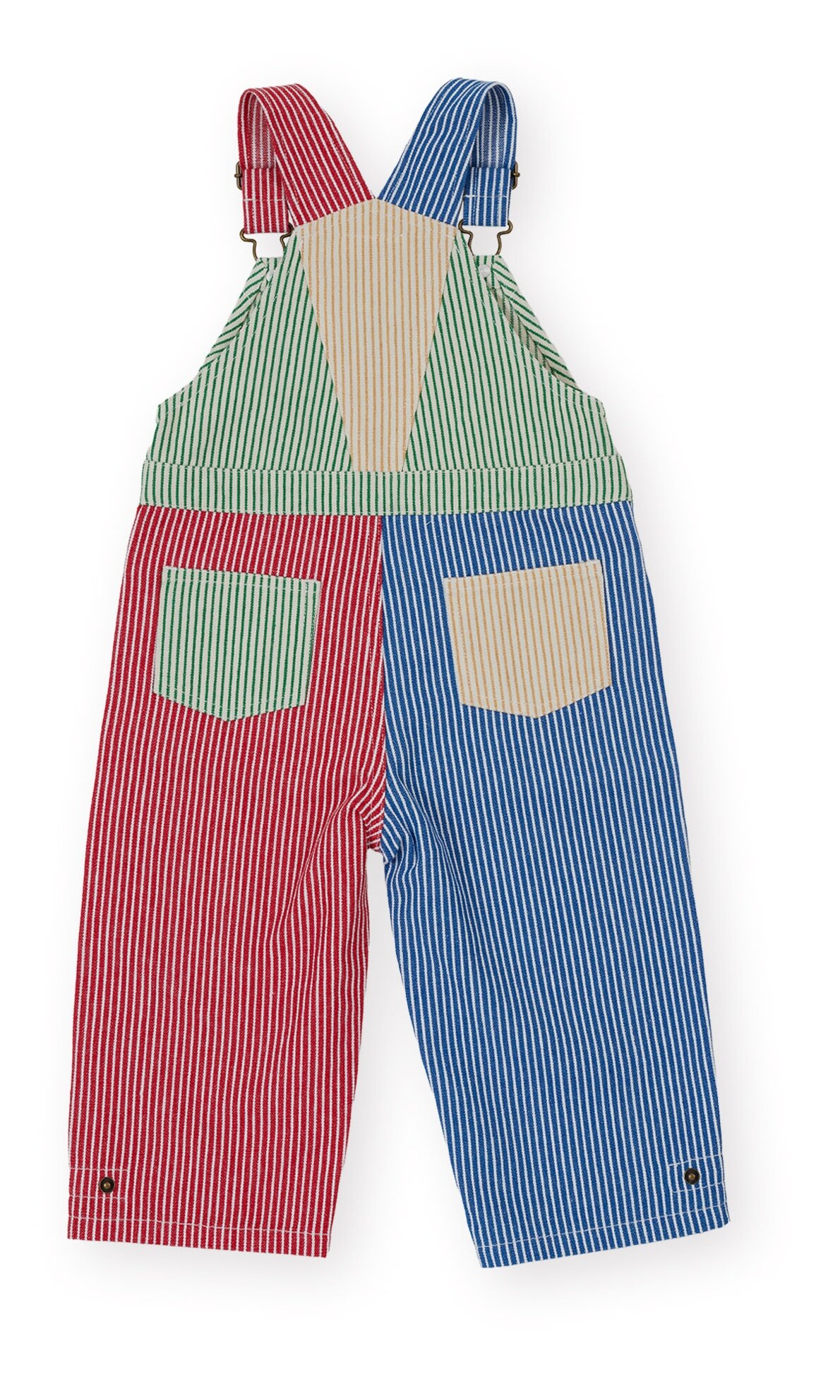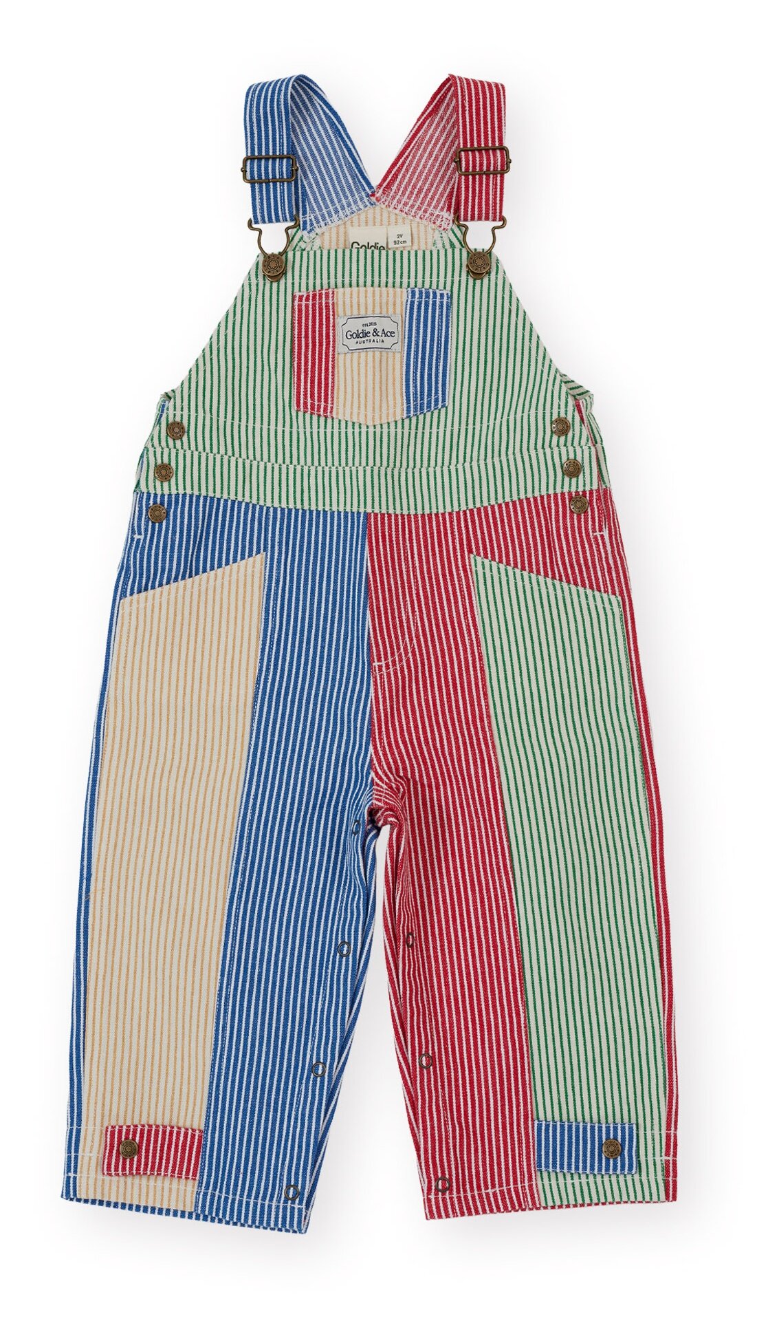 The Goldie + Ace Patchwork Stripe Black Overalls are made from mid weight stripe twill, with adjustable ankle snaps for straight leg or cuffed styling.