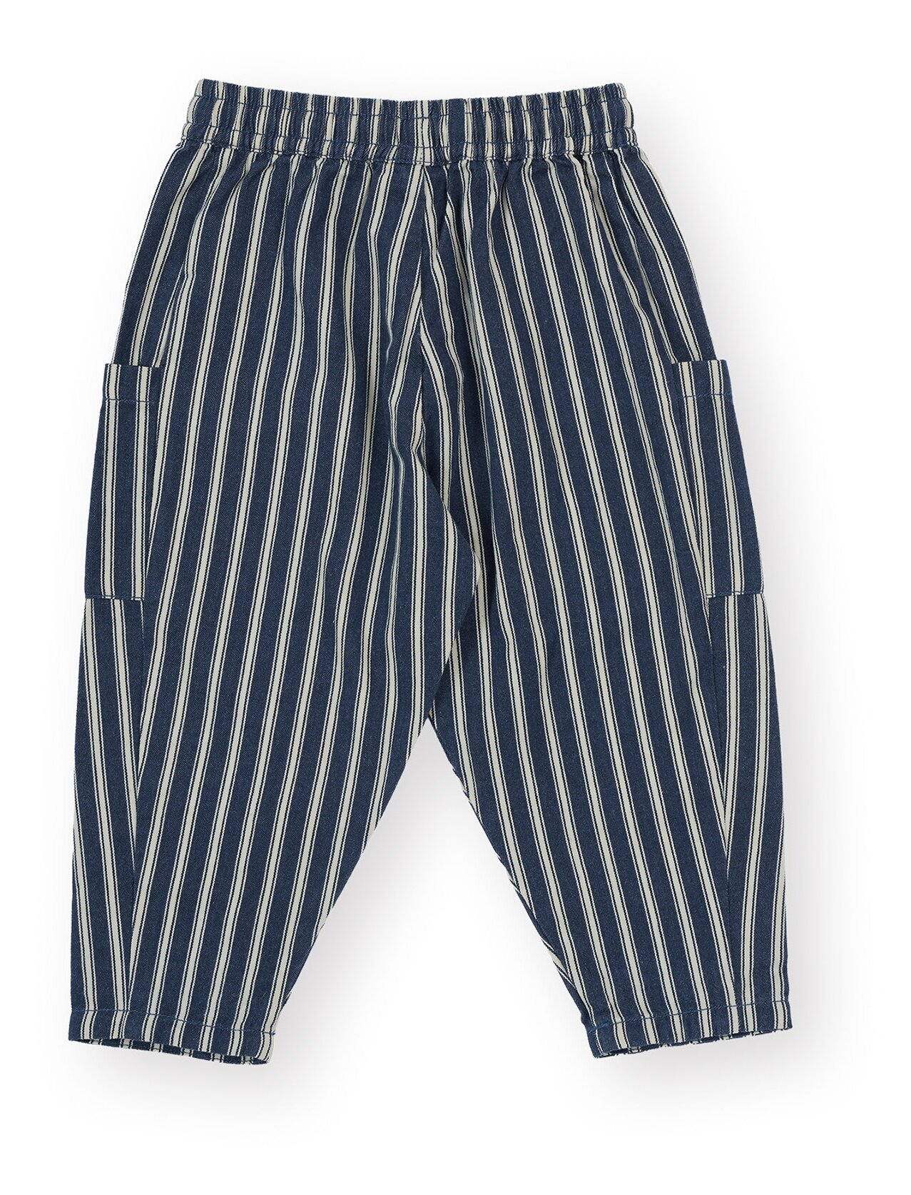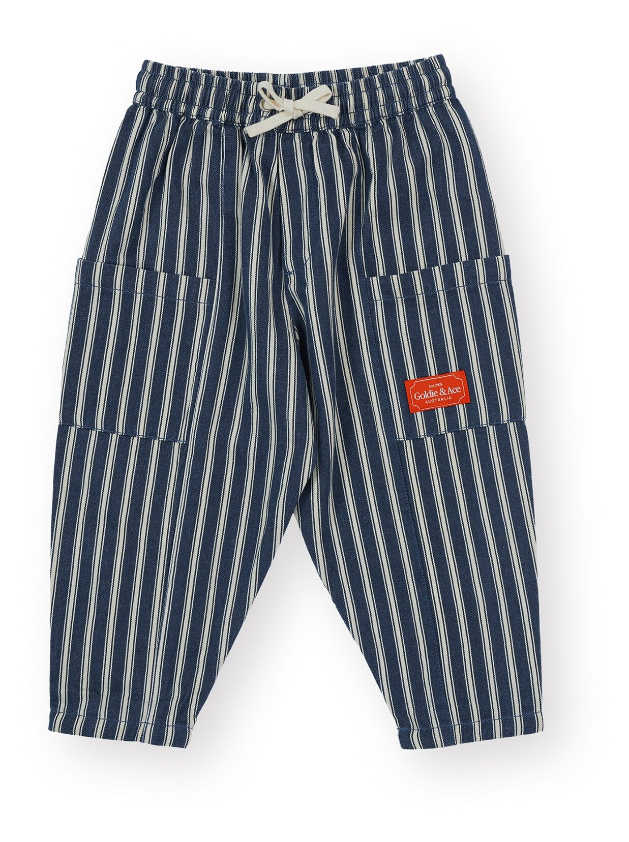 The Goldie + Ace Railroad Stripe Kit Pocket Pants are made from light weight woven indigo stripe fabric.