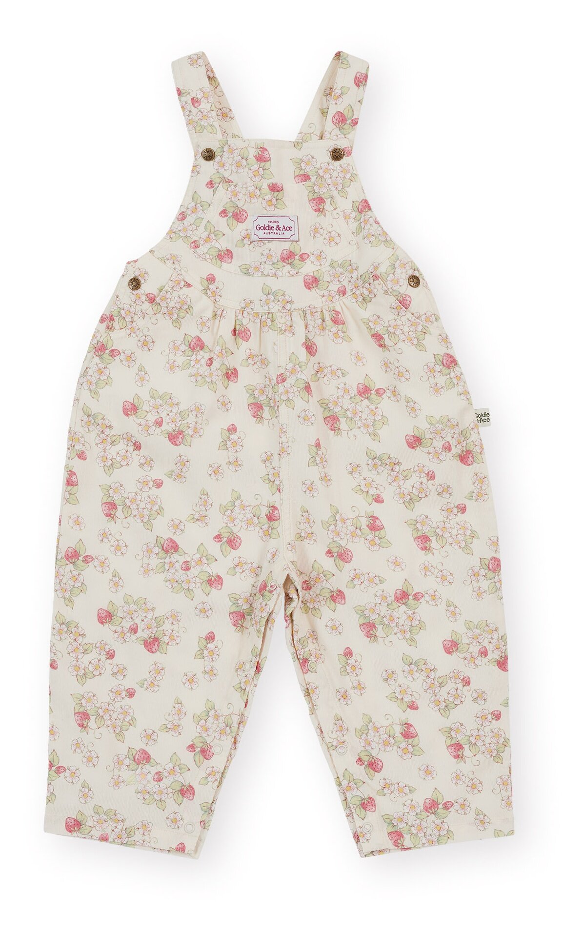 The Goldie + Ace Strawberry Fields Goldie Vintage Overalls are made from mid weight printed corduroy with a blouson fit.