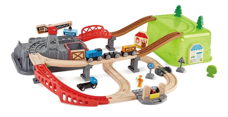 Includes 1 free-wheeling locomotive, 2 carriages, 2 S-rails, 12 curved rails, 3 straight rails, 2 irregular rails, 1 mountain-shaped rail, 4 plastic supports, 1 ascent rail, 2 pine trees, 1 leafy tree, 1 simple crane, 1 brown bridge, 1 train sign, 1 traffic sign, 4 small tools, 1 repair station, 1 storage box with cover and wooden decoration blocks