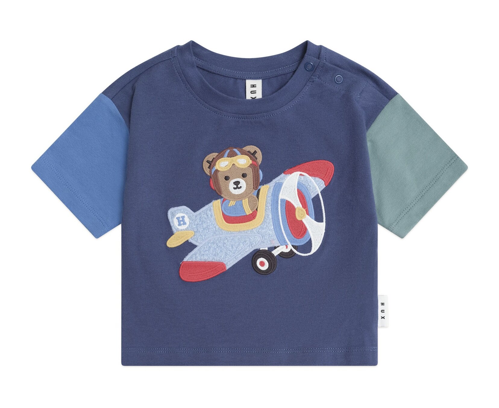 The Huxbaby Aviator Huxbear Boxy Tee is the perfect everyday tee, but with an aviator twist. This boxy t-shirt is made from buttery-soft organic cotton in navy colour block and features an aviator Huxbear embroidered on the tummy. Baby sizes feature stainless steel shoulder snaps for quick changes.