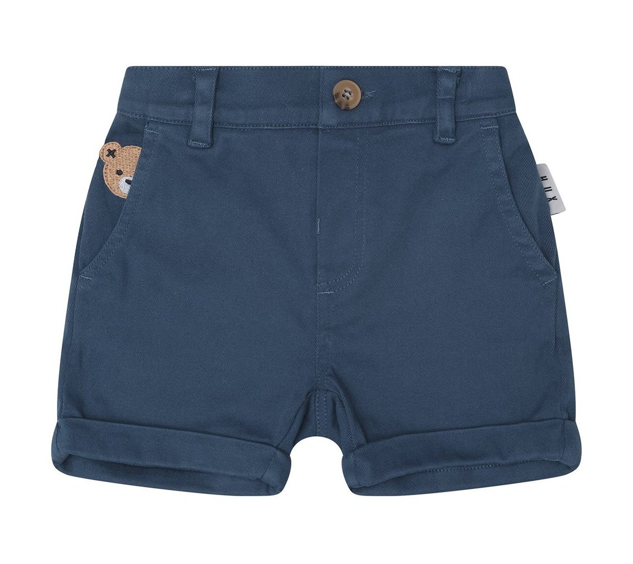 Brushed twill chino short with peeping Huxbear patch at pocket Features internal adjustable elastic button waistband and belt loops Functional zipper fly on sizes 4 and up Sustainably produced Safe AZO free dyes