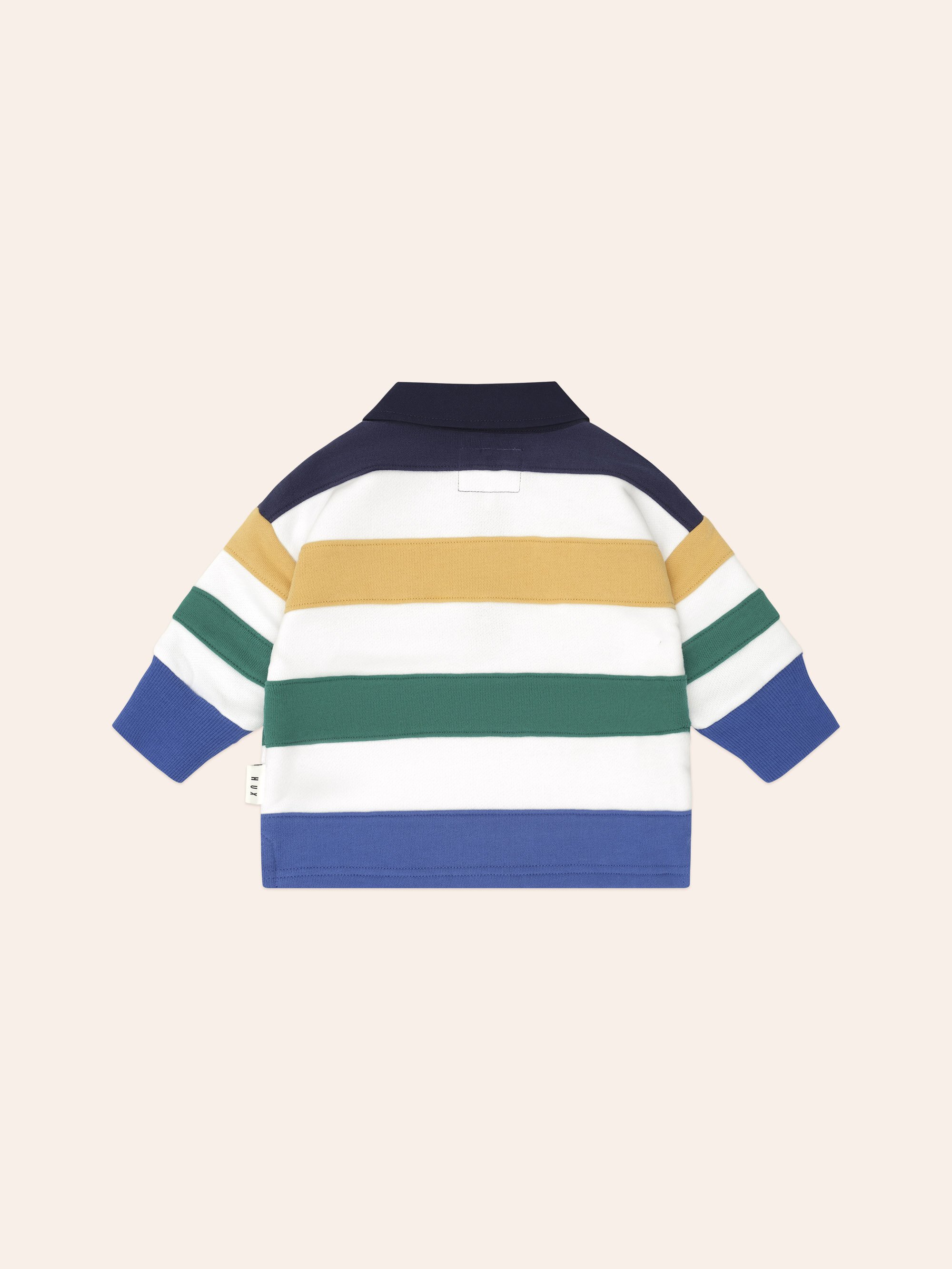 This classic Huxbaby Colour Block Panelled Rugby fleece jersey features a sporty collar and three buttons at the neck. Made from cloud-like organic cotton, it features colour blocked panels and a peekaboo varsity Huxbear detail.