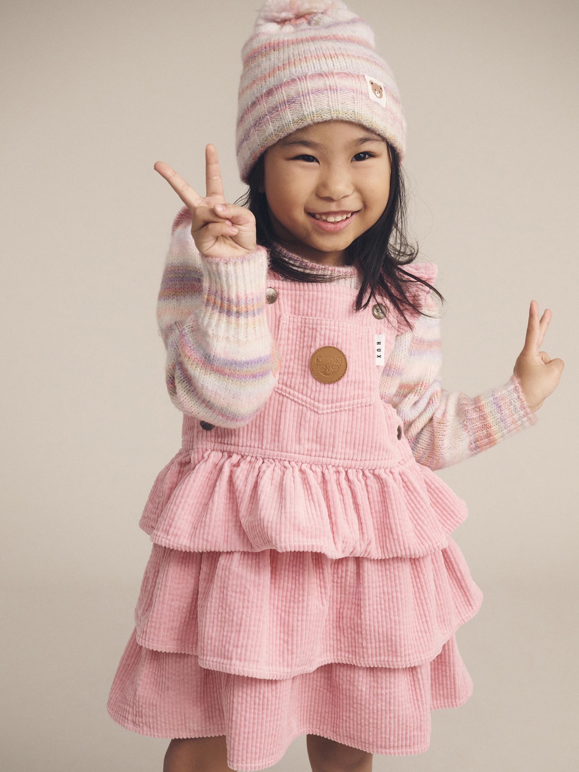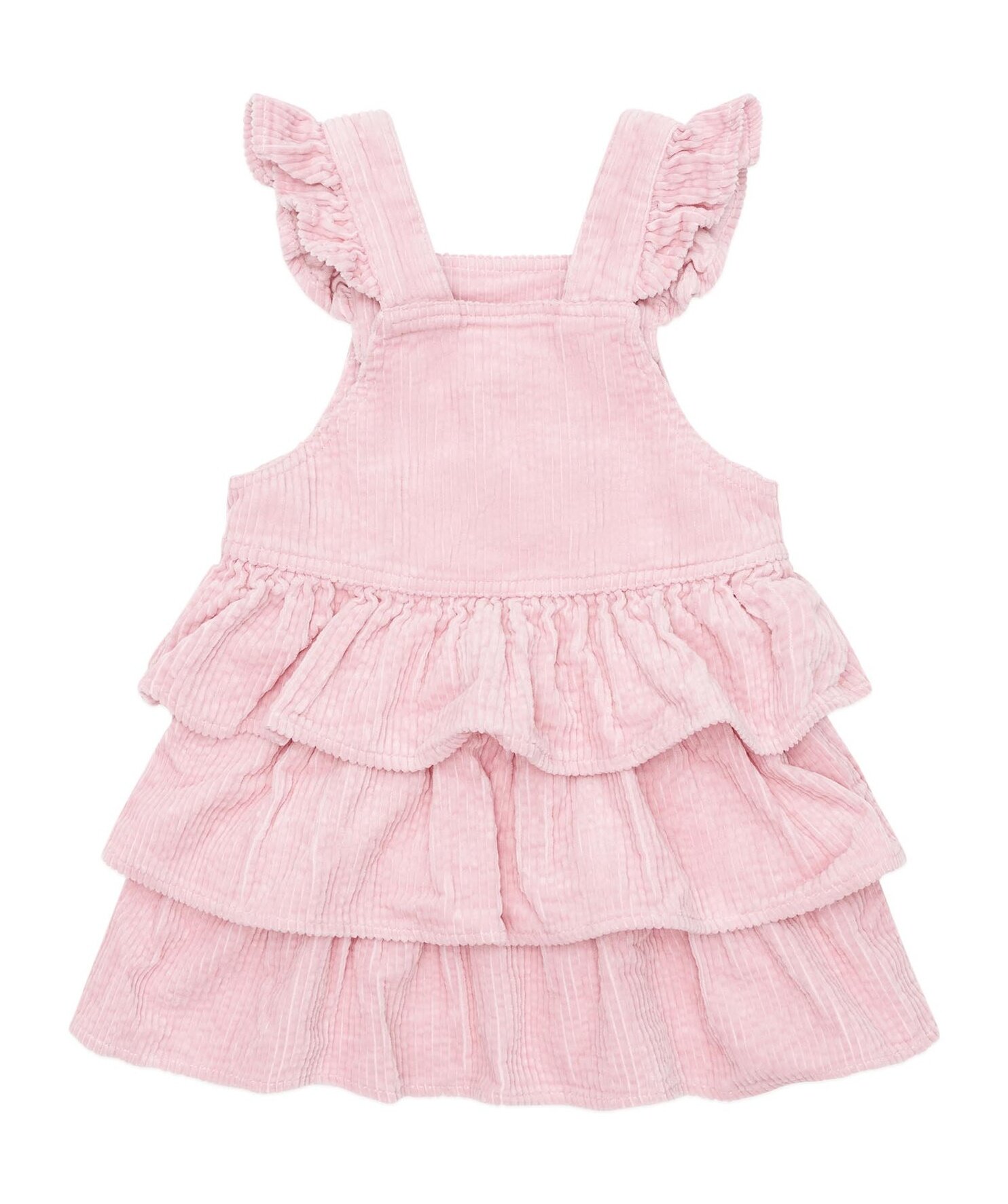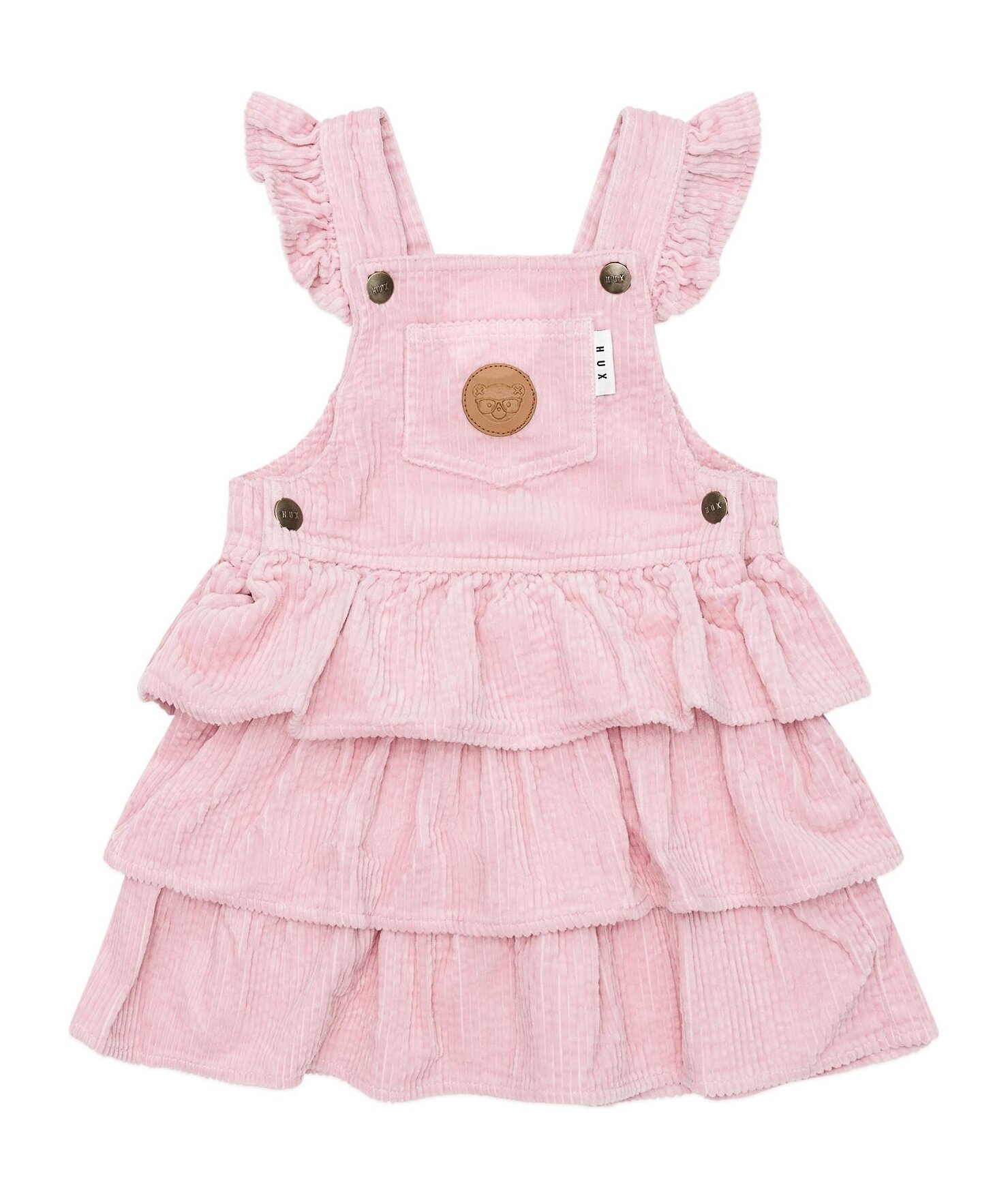 A transseasonal Huxbaby Cord Tiered Overall Dress made from soft cotton cord. It features playful shoulder frills and a pretty tiered skirt for comfy wear. Style it over a tee for summer or with a long sleeve top and cardi for cooler months. Designed with adjustable straps, chest pocket and a relaxed, casual fit.