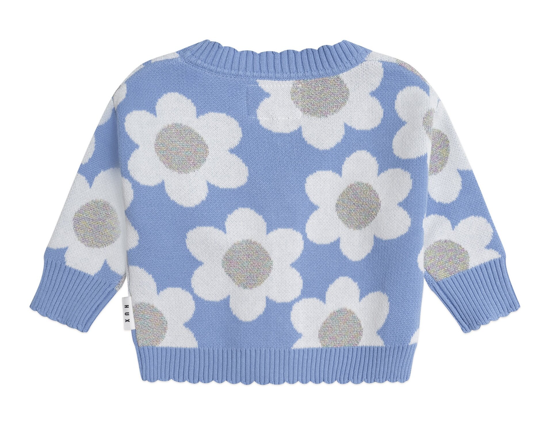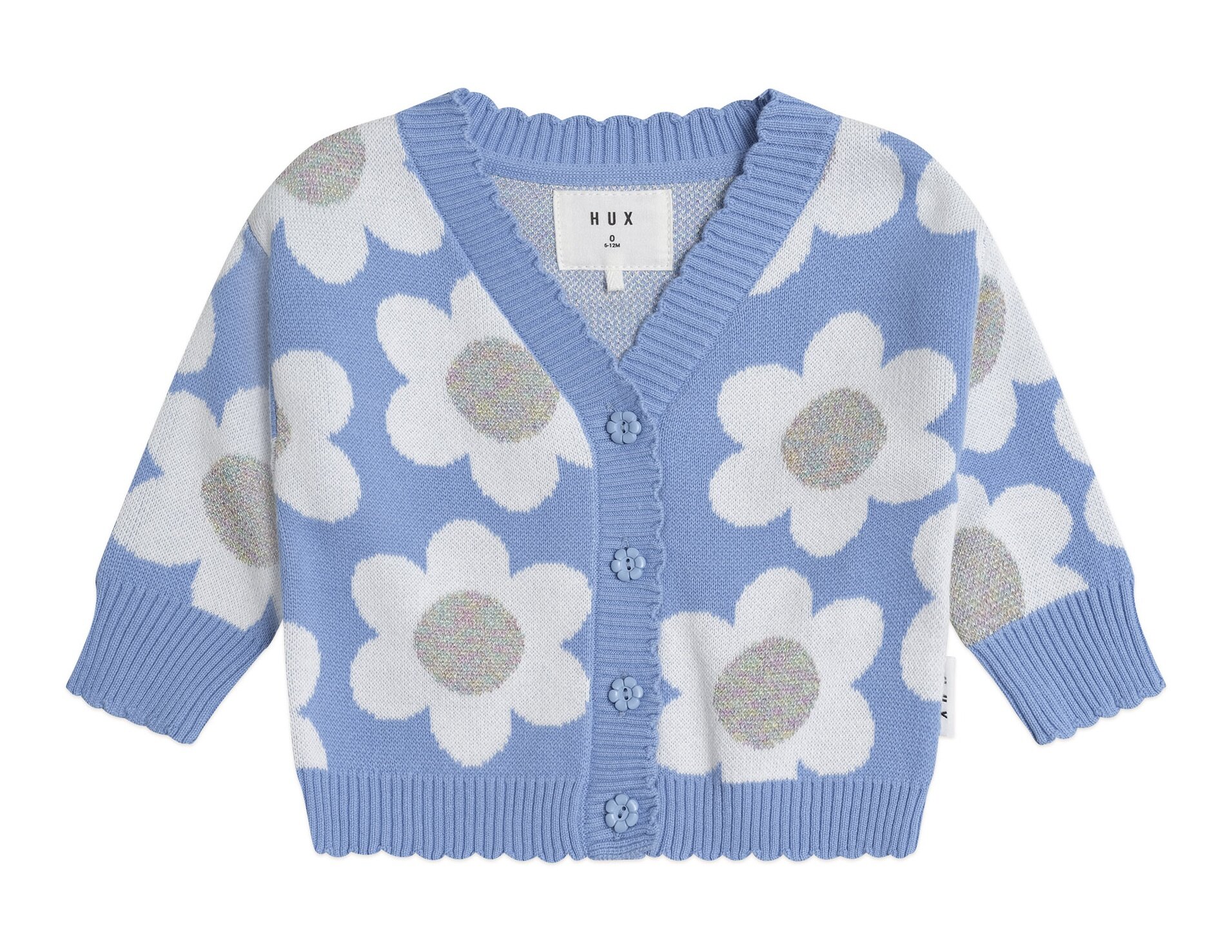 The Huxbaby Daisy Scalloped Knit Cardi is an extra special sparkly cardi. Made from luxuriously thick jacquard knit organic cotton, it has an all over daisy pattern in sparkly lurex, pretty scalloped edging and flower buttons for easy layering.