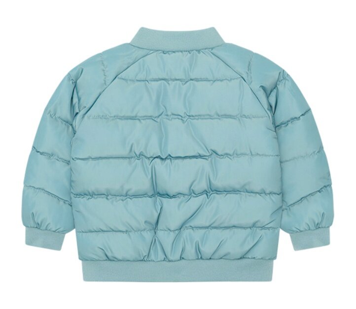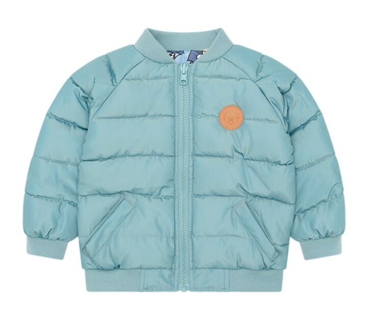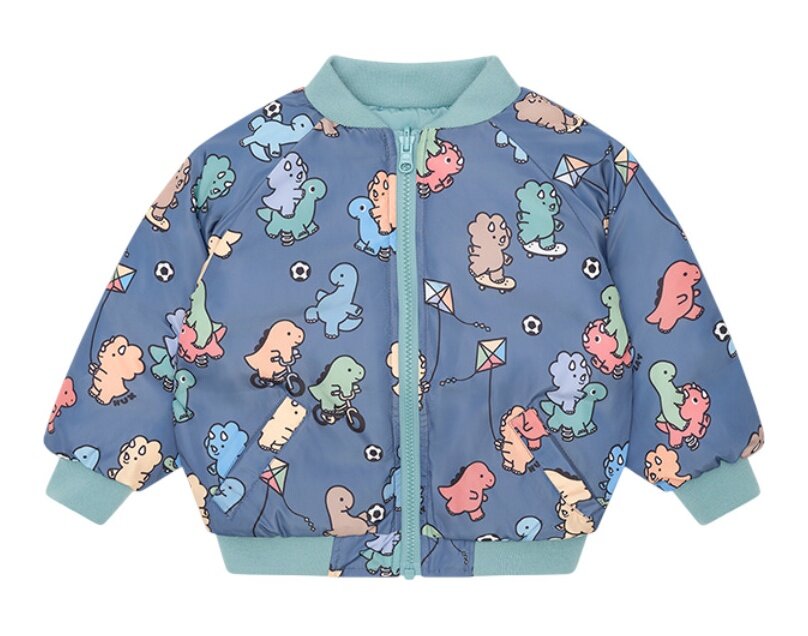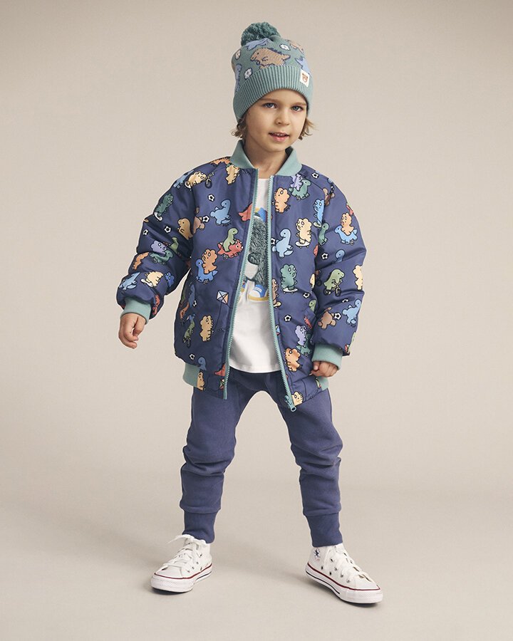 Huxbaby's Dino Play reversible bomber is two jackets in one. On one side, have fun with Huxbaby’s Dino the dinosaur print. On the other, stay cool in stylish sprout green blue. Featuring front pockets and an easy front zip, this versatile piece is consciously crafted from recycled polyester and is water repellent on both sides.