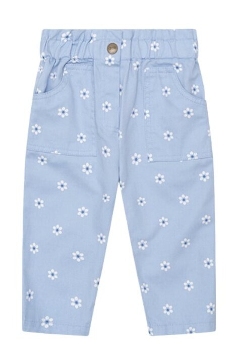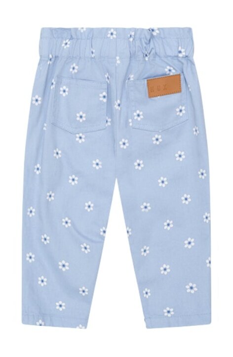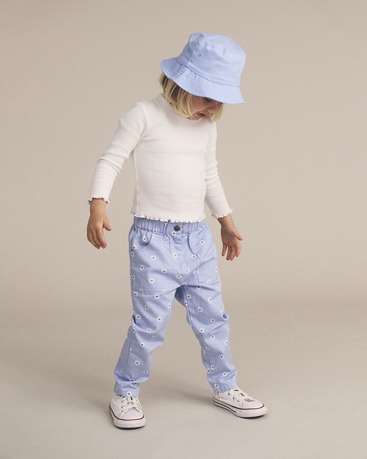 90s style paper bag pants in chambray blue and daisy print. Featuring an internal button and elasticated waistband for an adjustable fit, plus front and back pockets perfect for stashing snacks in, these everyday Huxbaby pants are comfy, cute and made for good.