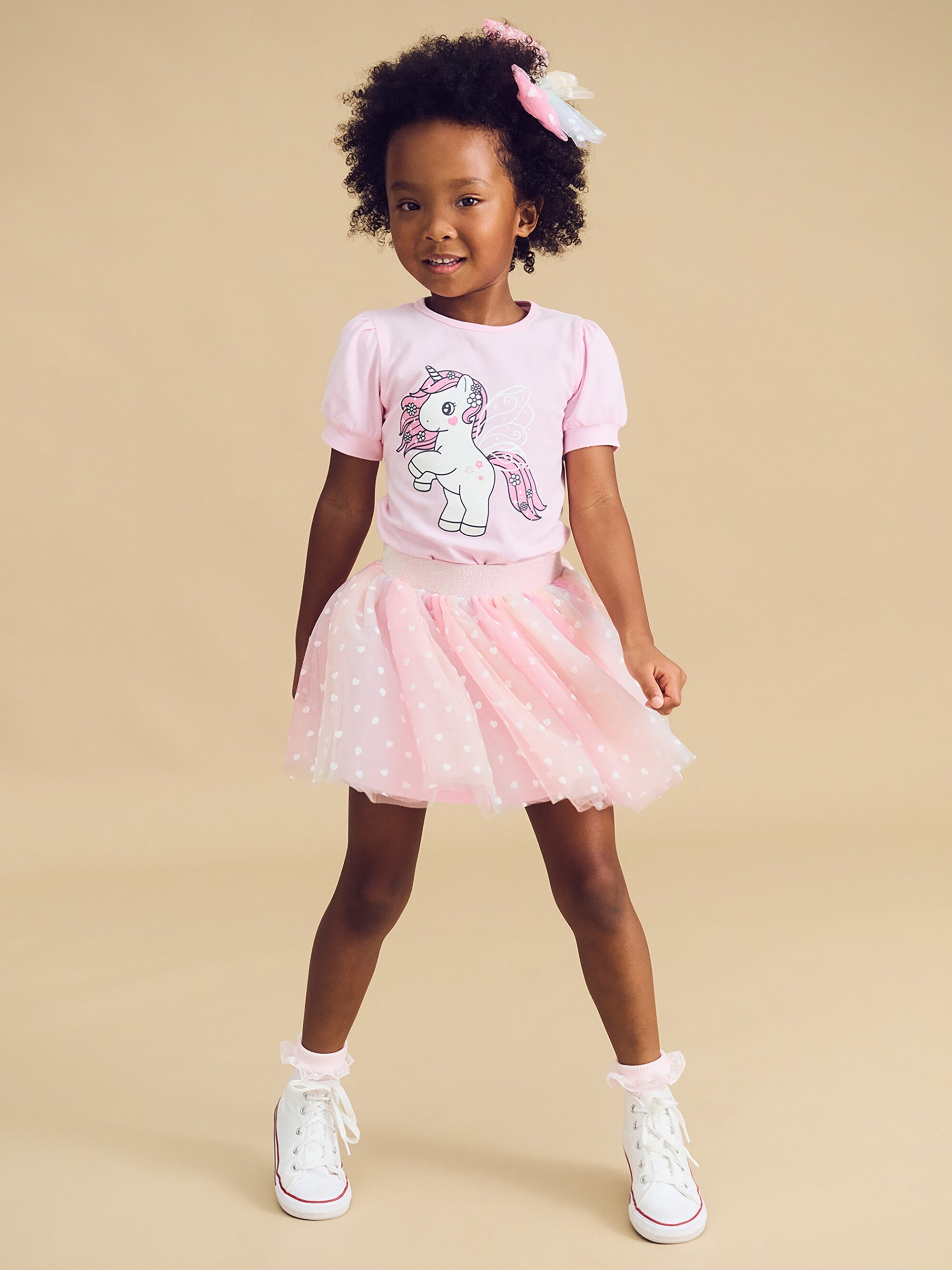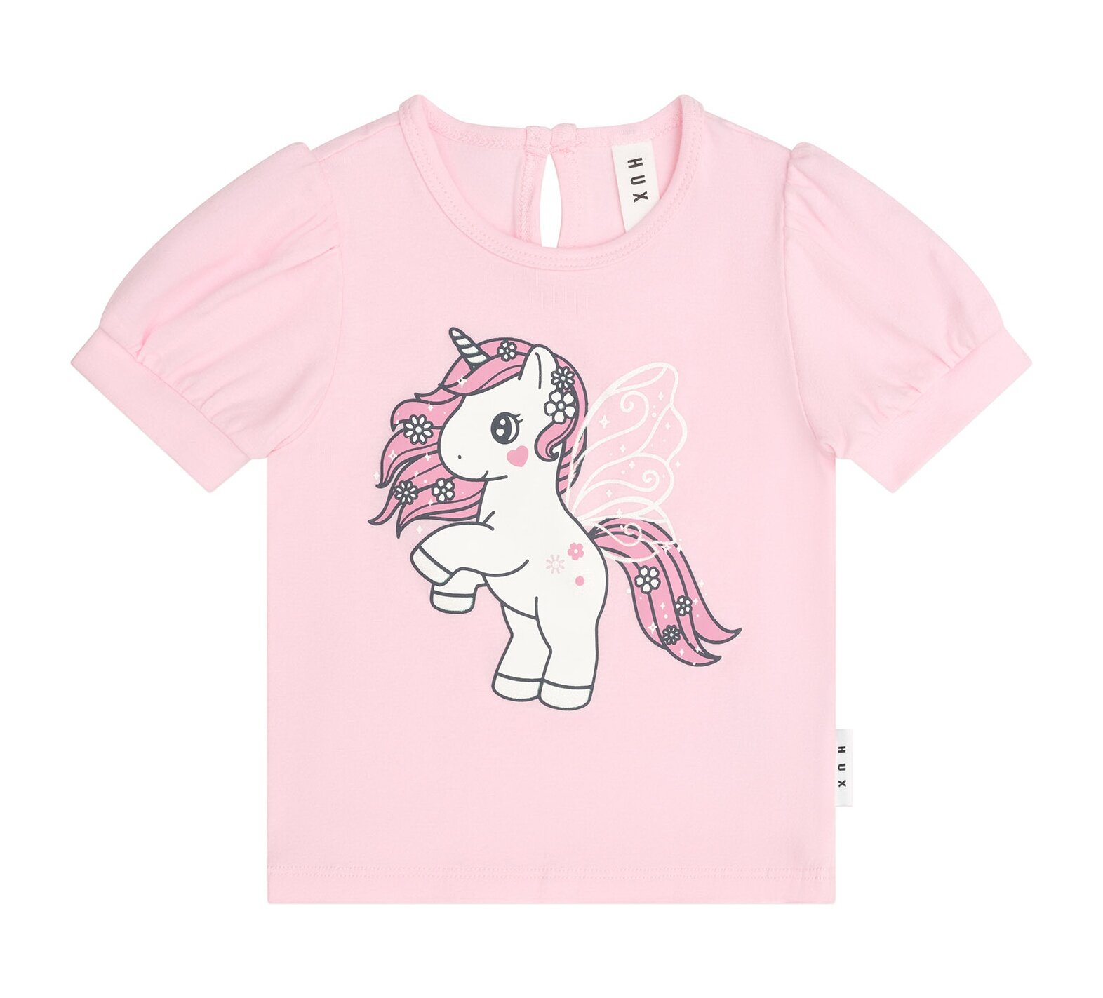 Super soft, premium organic cotton jersey puff sleeve t-shirt with flutter unicorn print