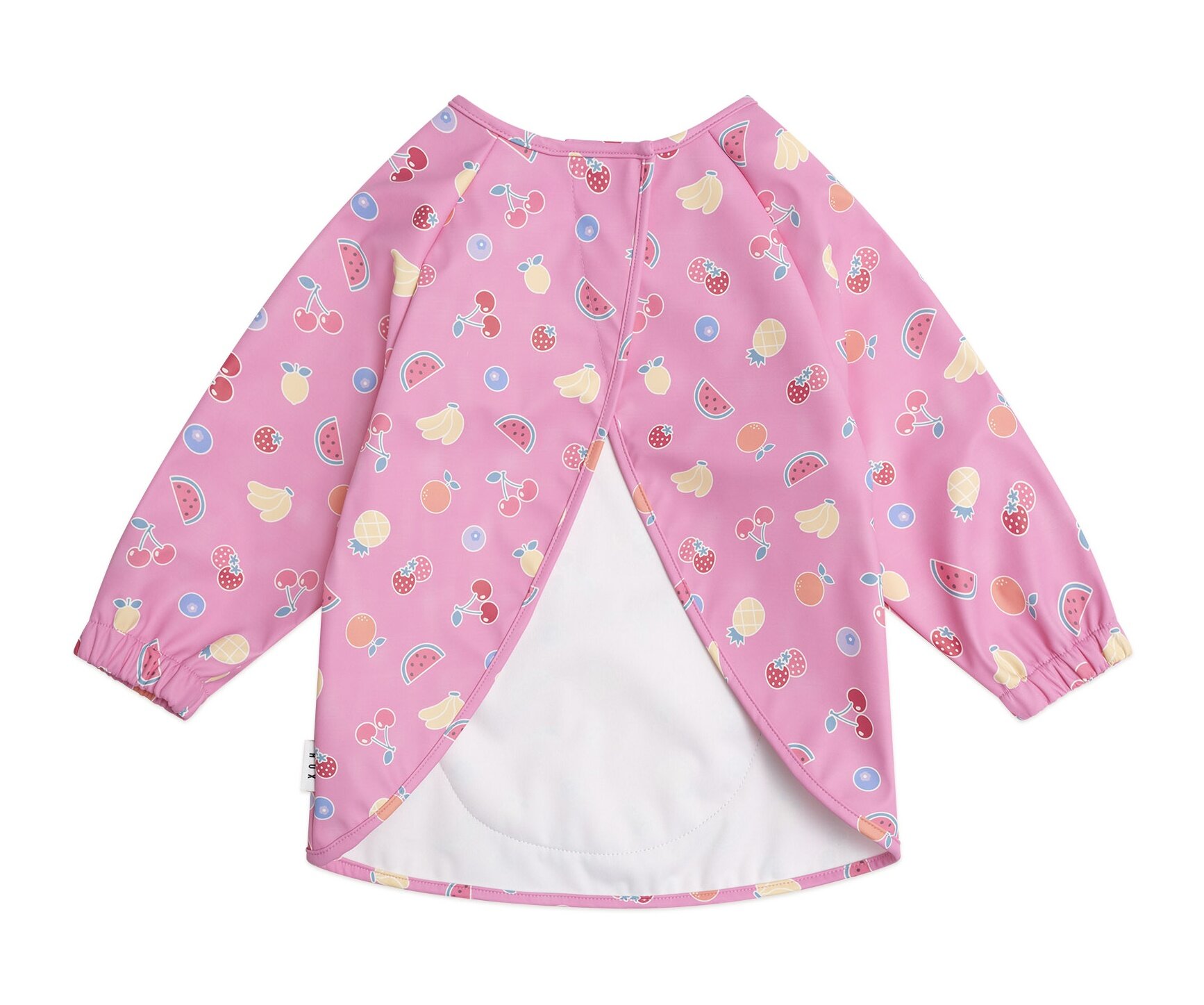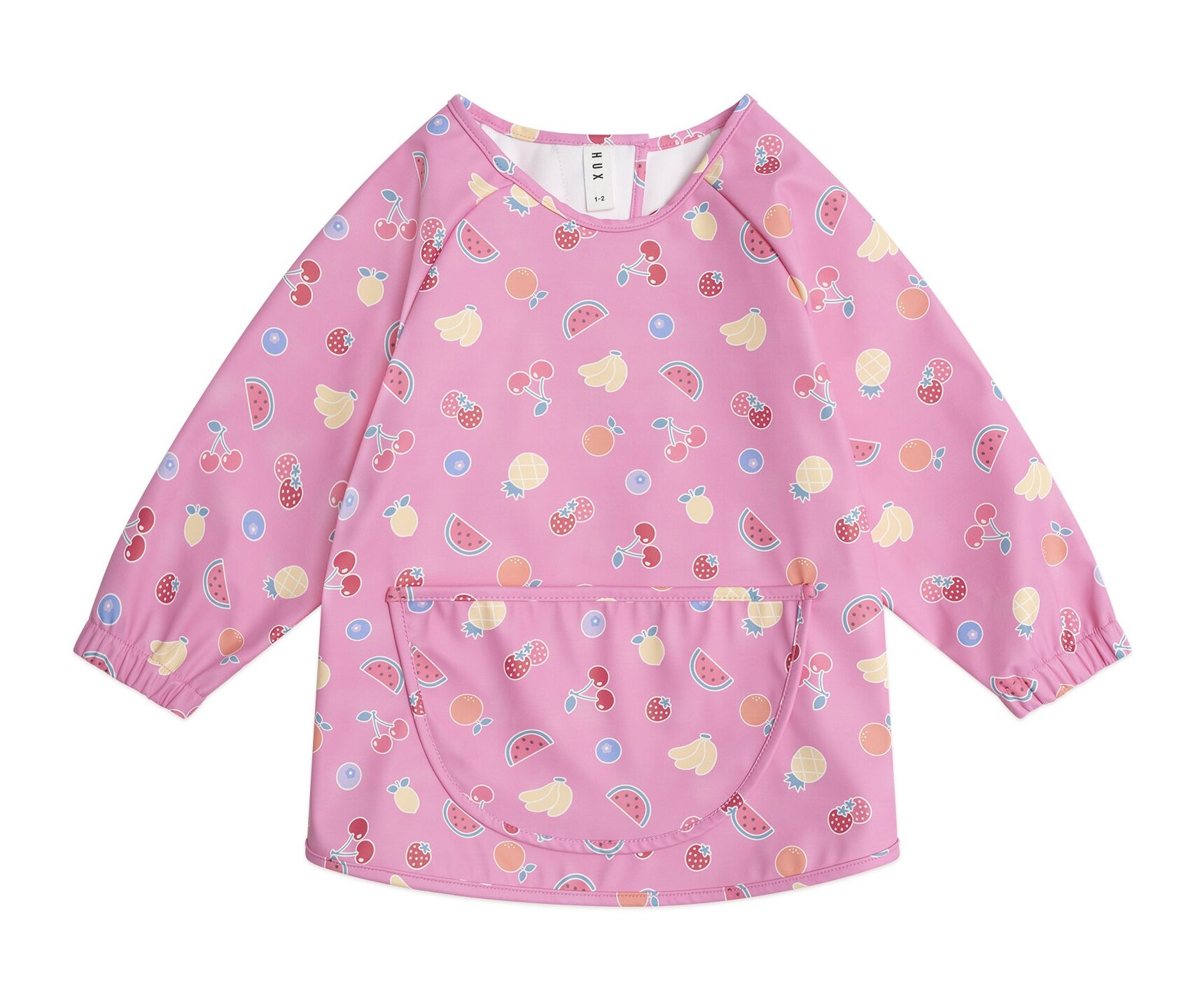 Get ready for your next messy adventure. The Huxbaby pink fruit emoji smock keeps little ones clean, dry and stain-free even when food, play, art, or outdoor activities get going. It features an oversized front pouch for stashing sticks and other stuff, elasticated cuffs and a velcro fastening at the back. Made from wipeable, washable and waterproof PU fabric.