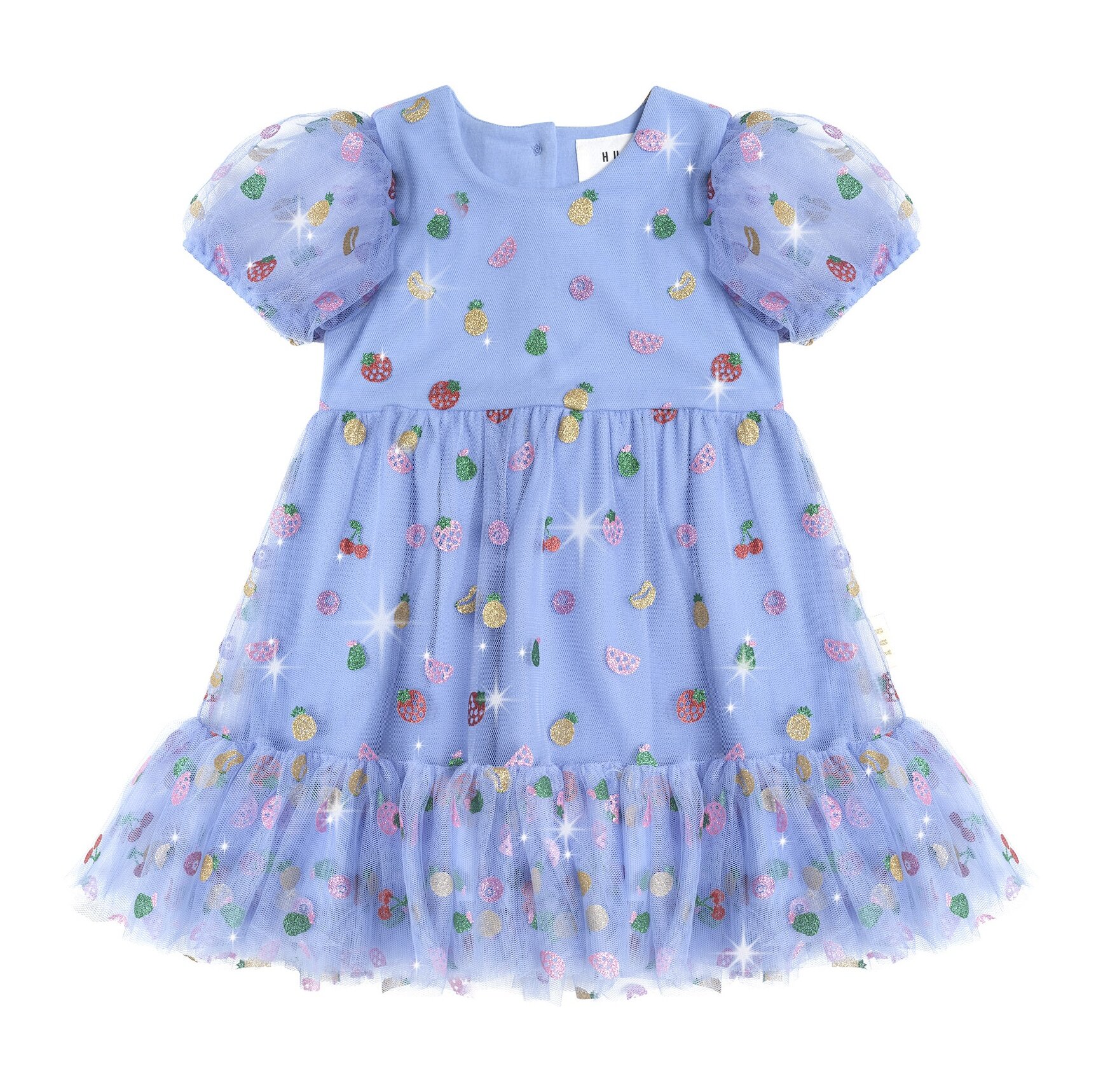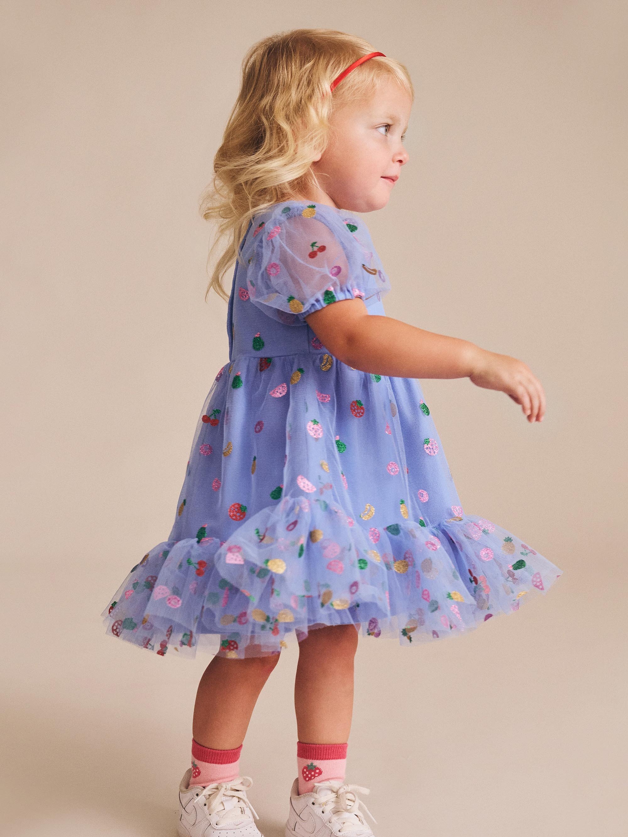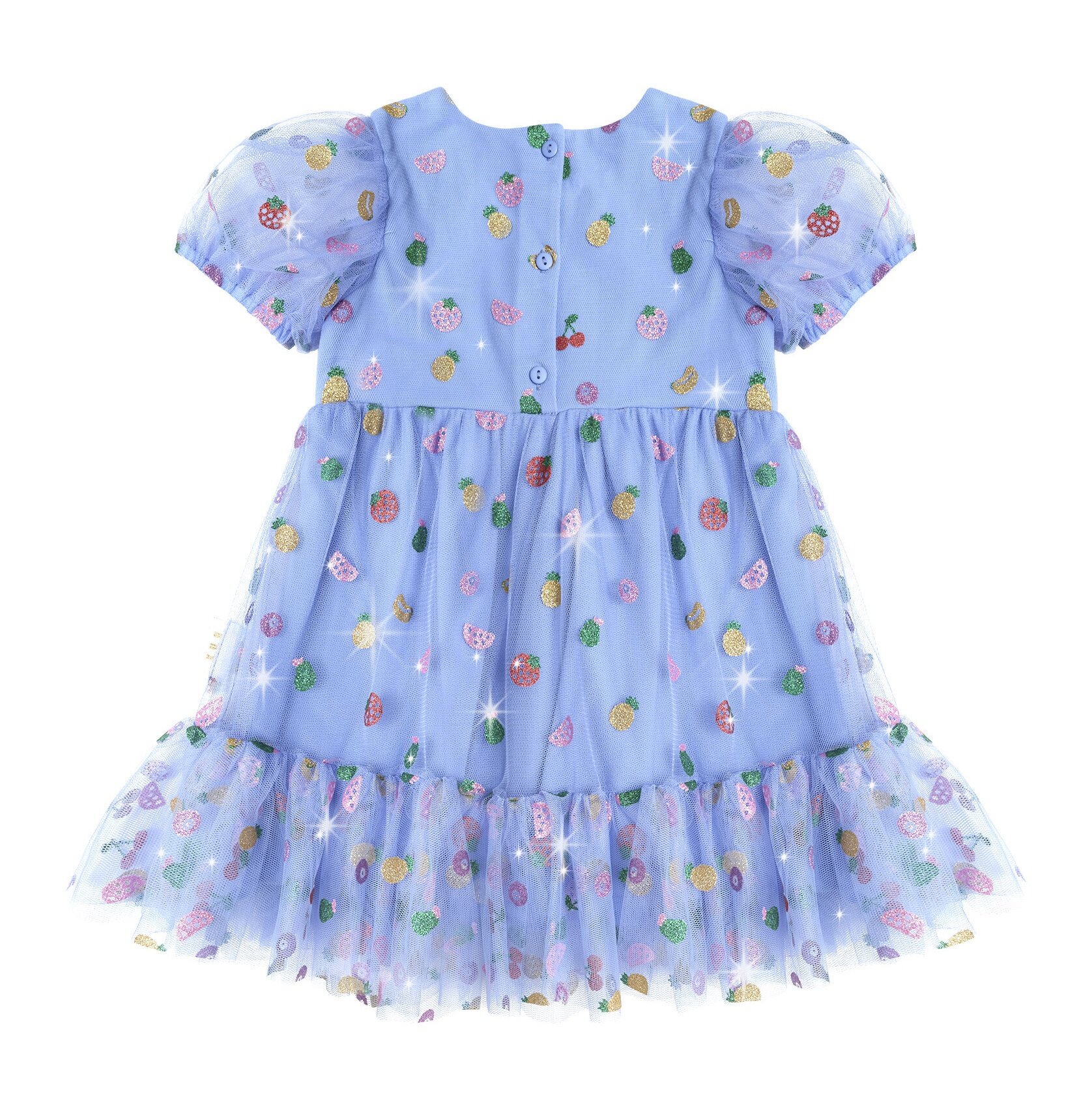 The Huxbaby Fruit Salad Puff Sleeve Tulle Dress is a glittery party dress and sweeter than any chocolate. It’s made from strictly non-scratchy glittery tulle with comfortable cotton lining. It features a keyhole button closure at the back, pretty puffy sleeves and tiered tulle layers with a delicate fruit salad glitter print. Perfect for princesses.