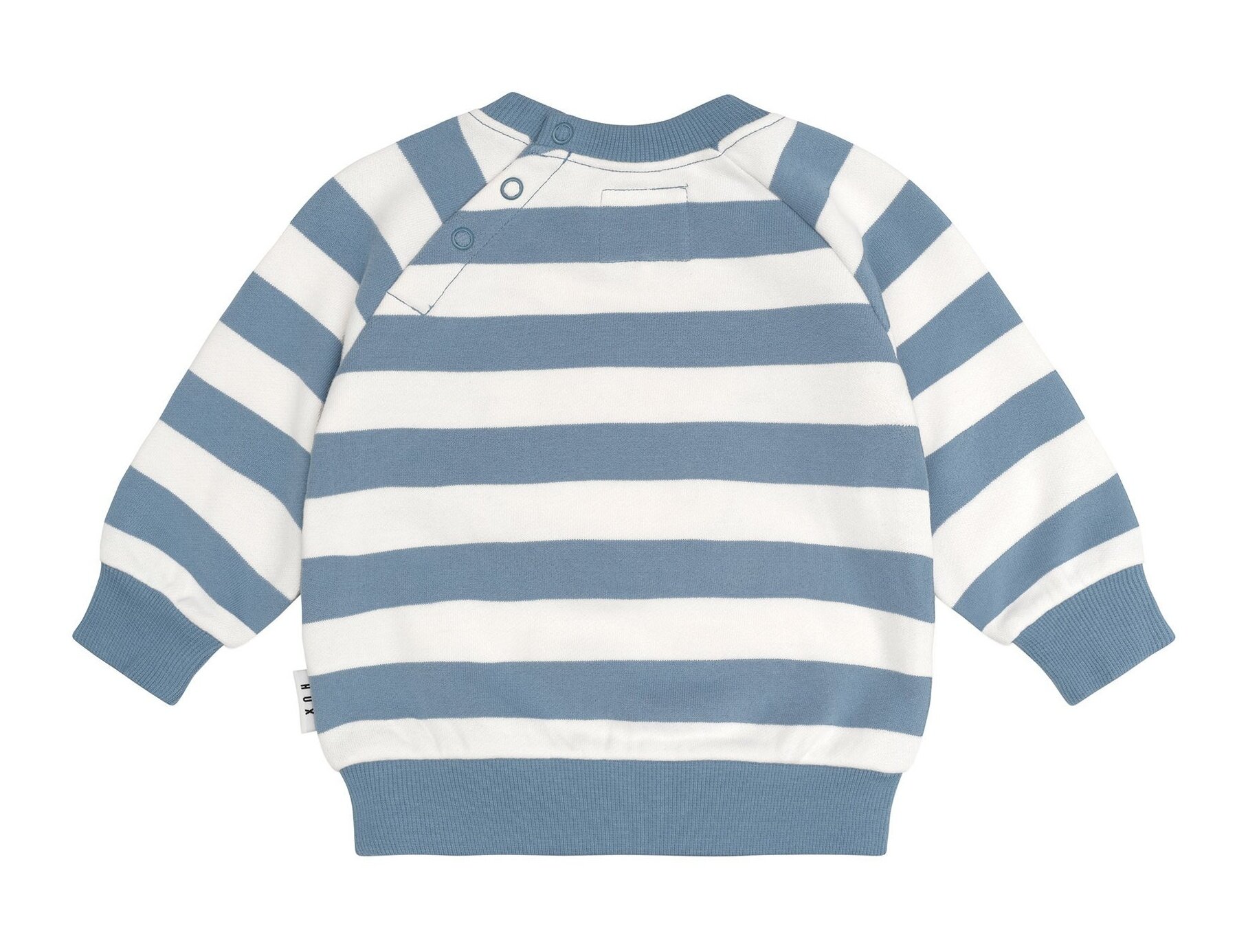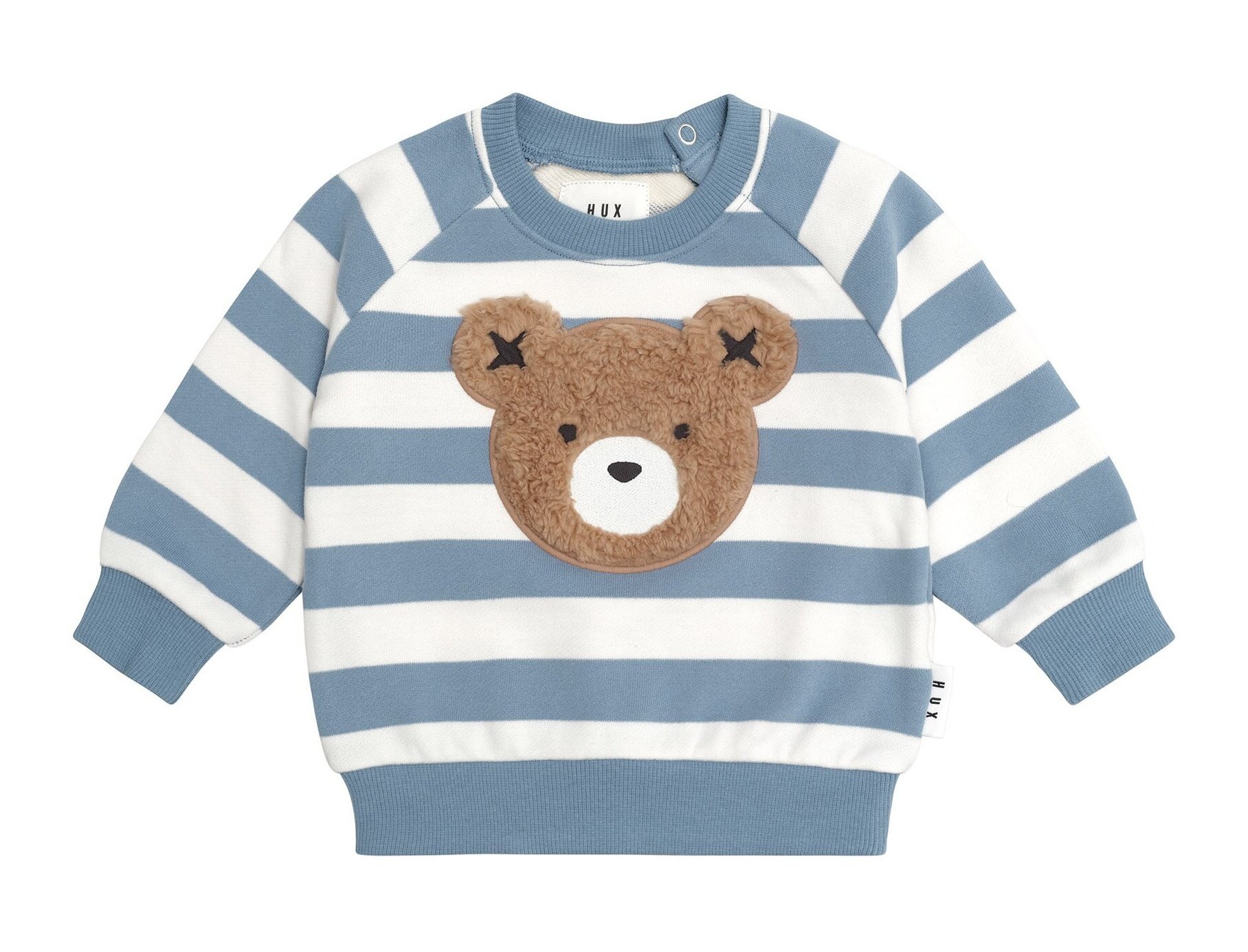 Super soft, premium organic yarn dye cotton terry sweatshirt with signature Huxbaby fur bear applique. Baby sizes have stainless steel snaps at back opening. Made from GOTS certified organic cotton. Sustainably produced using safe AZO free dyes.
