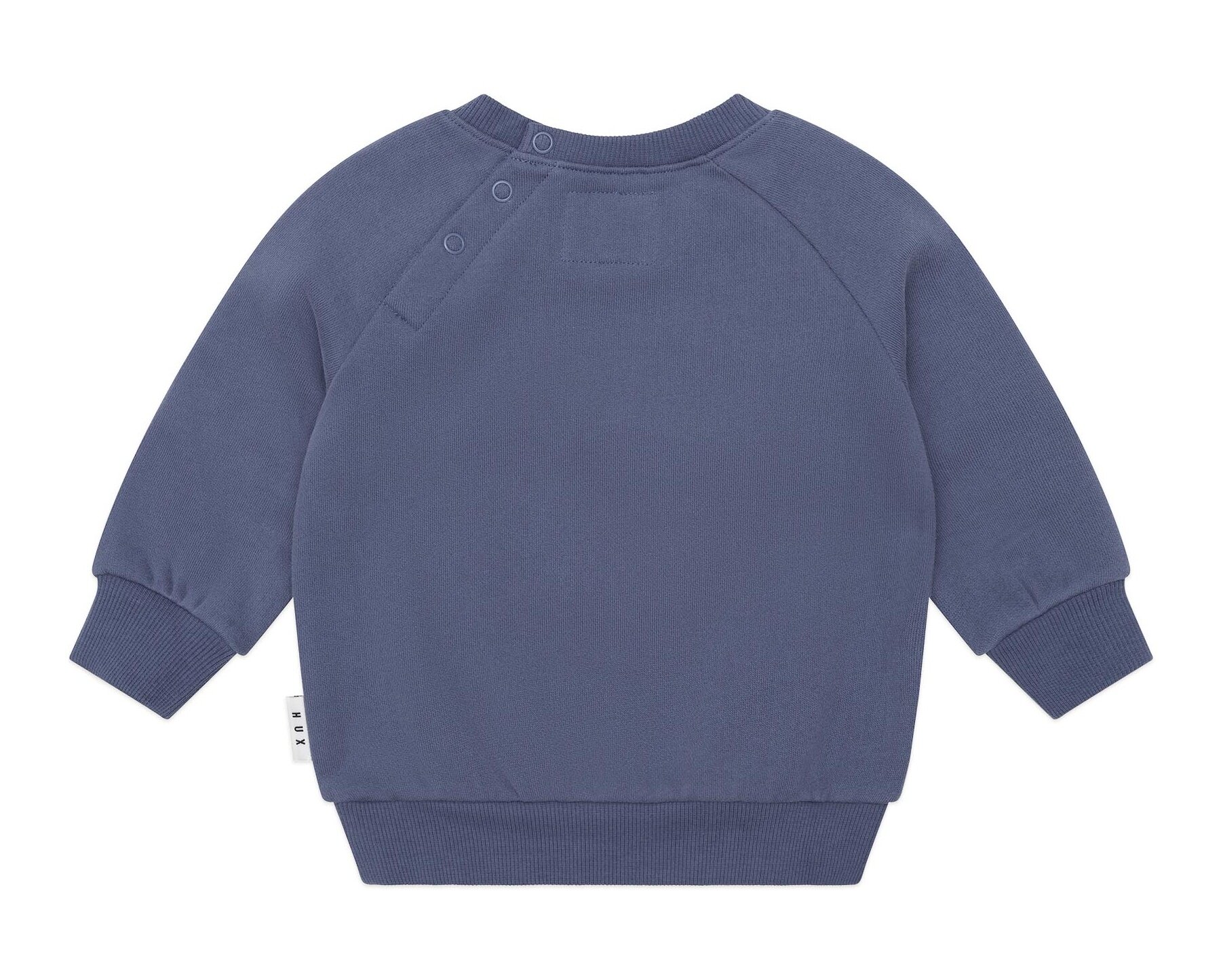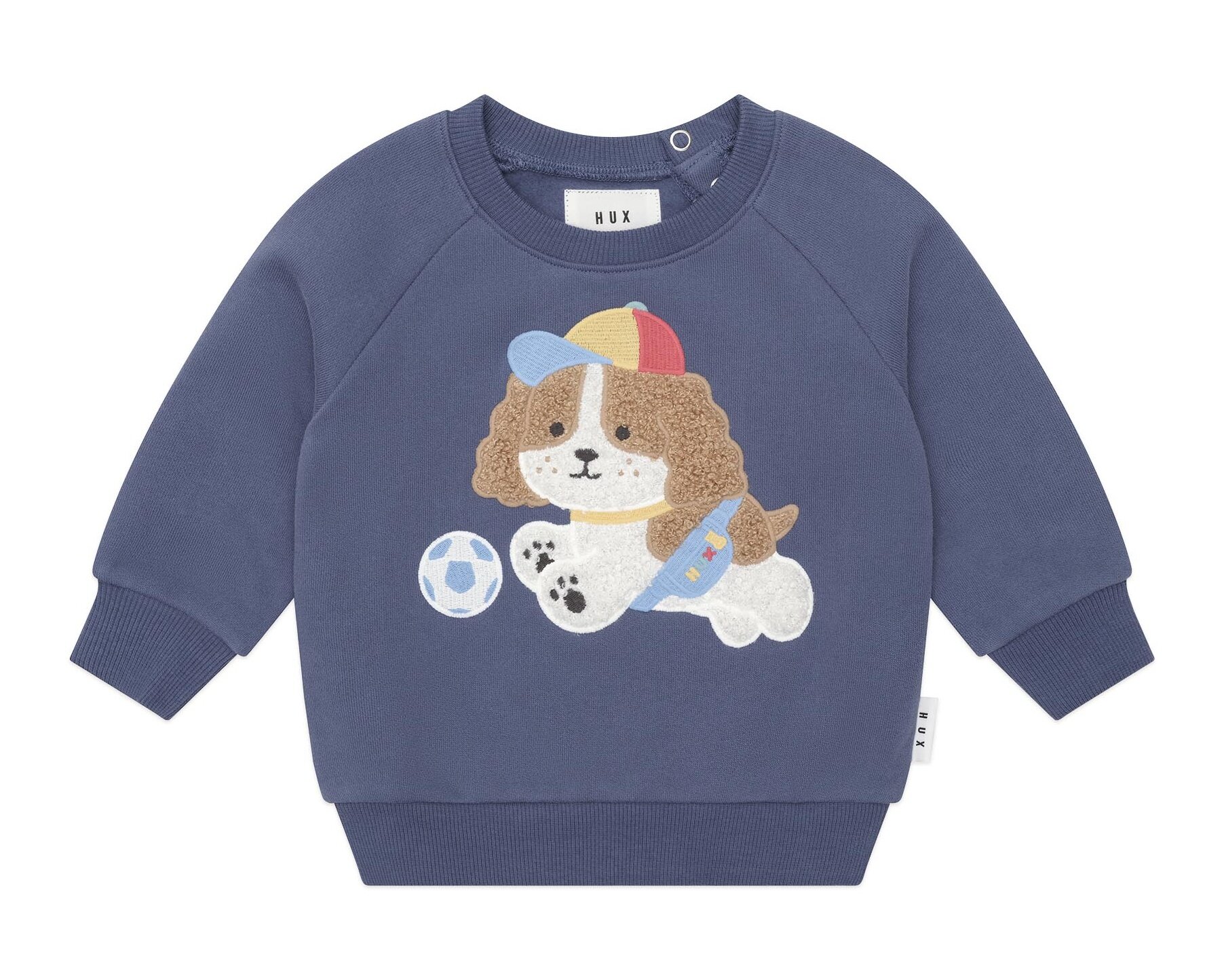 Batter up. This vintage baseball-style Huxbaby Happy Pup Sweatshirt in midnight blue is made from fluffy organic cotton and features a retro Huxbear embroidery on the front. Baby sizes include stainless steel back snaps for easy dressing. Match it with our Midnight Drop Crotch Pant to complete the classic look.