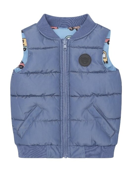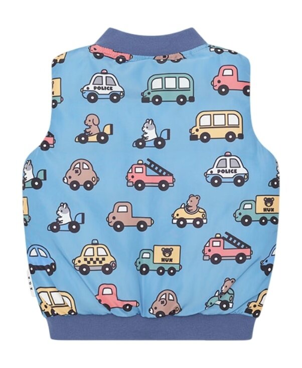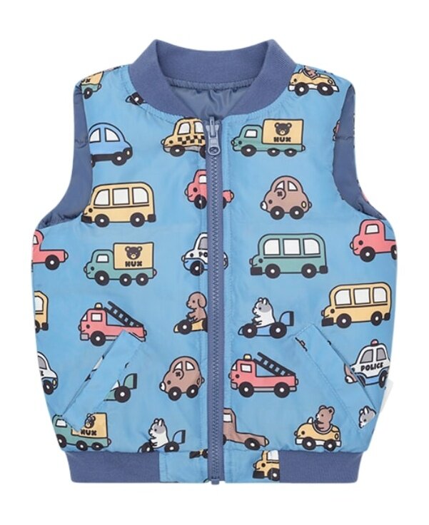 This reversible Huxbaby puffer vest is two looks in one. On one side, have fun with our custom Huxmobile print. On the other, stay cool in classic midnight blue. Featuring front pockets and an easy front zip, this versatile piece is consciously crafted from Global Recycled Standard (GRS) recycled polyester and is water repellant on both sides.