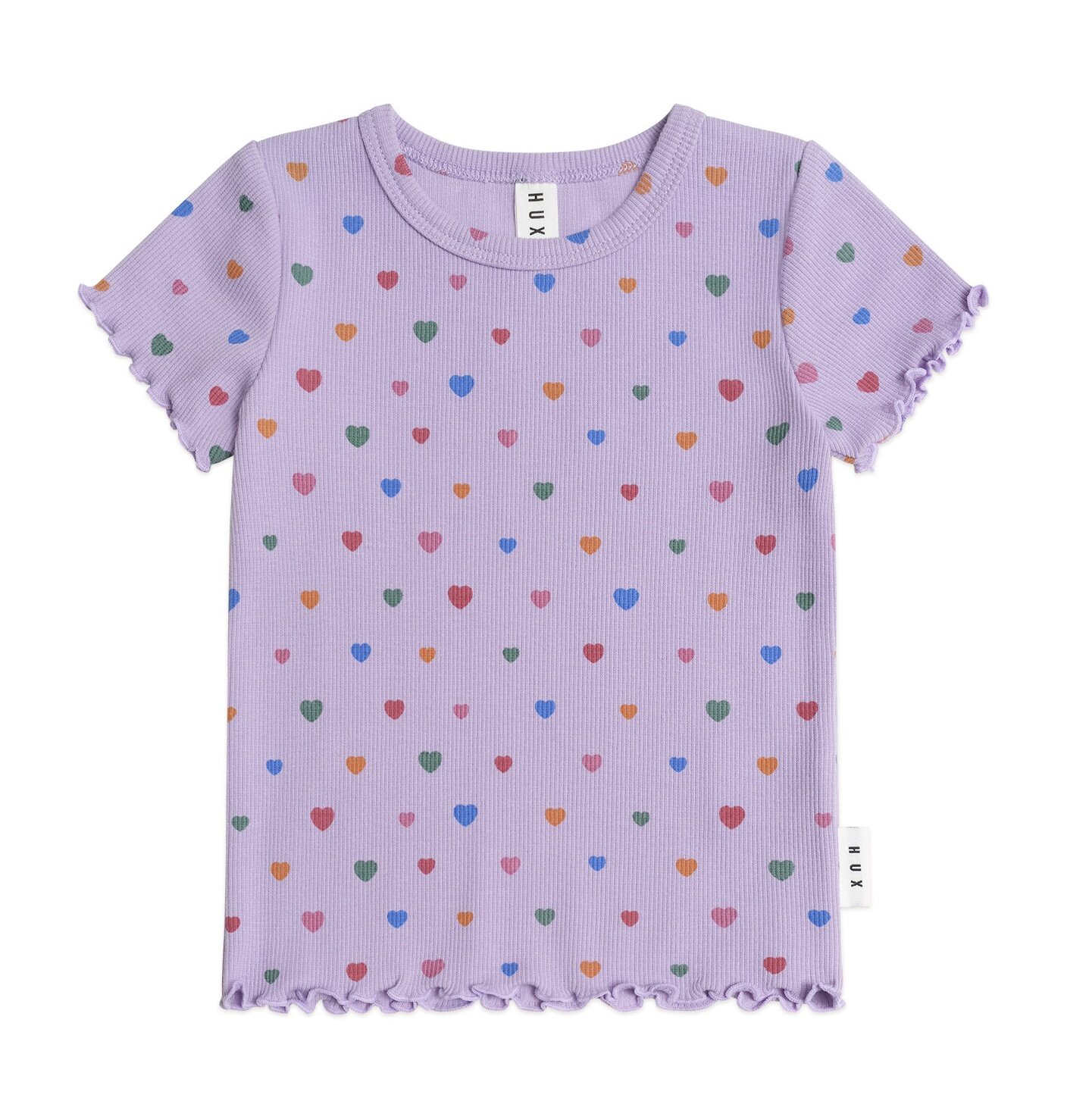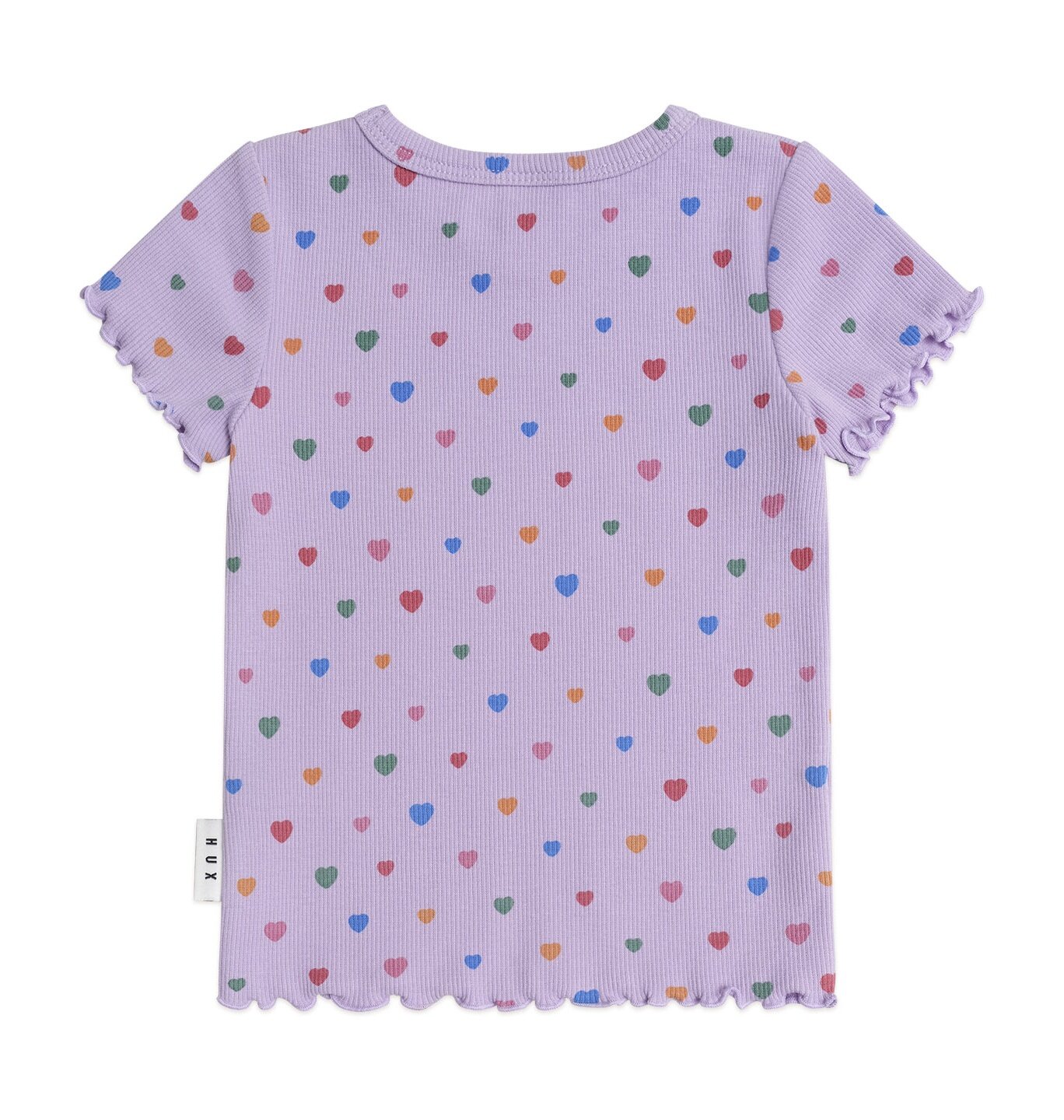 The Huxbaby I Heart Cake Rib Tee is a versatile tee covered in colourful heart sprinkles. This short-sleeved top is made from a deliciously textured ribbed cotton and features a sweet lettuce edge detail. The perfect layering piece, super comfy, and such fun to wear!