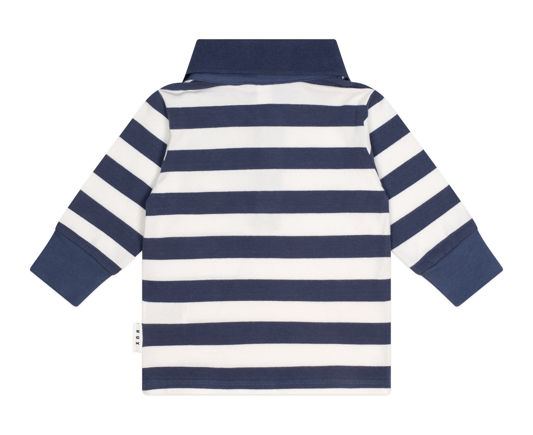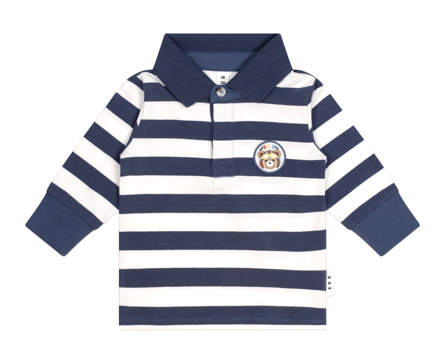 The Huxbaby Stripe Longsleeve Polo tee in classic navy stripe features a rugby-style collar and three buttons at the neck. Made from butter-soft organic cotton, with pilot Huxbear badge detail, this easywear polo shirt can be dressed up or down to suit any occasion.