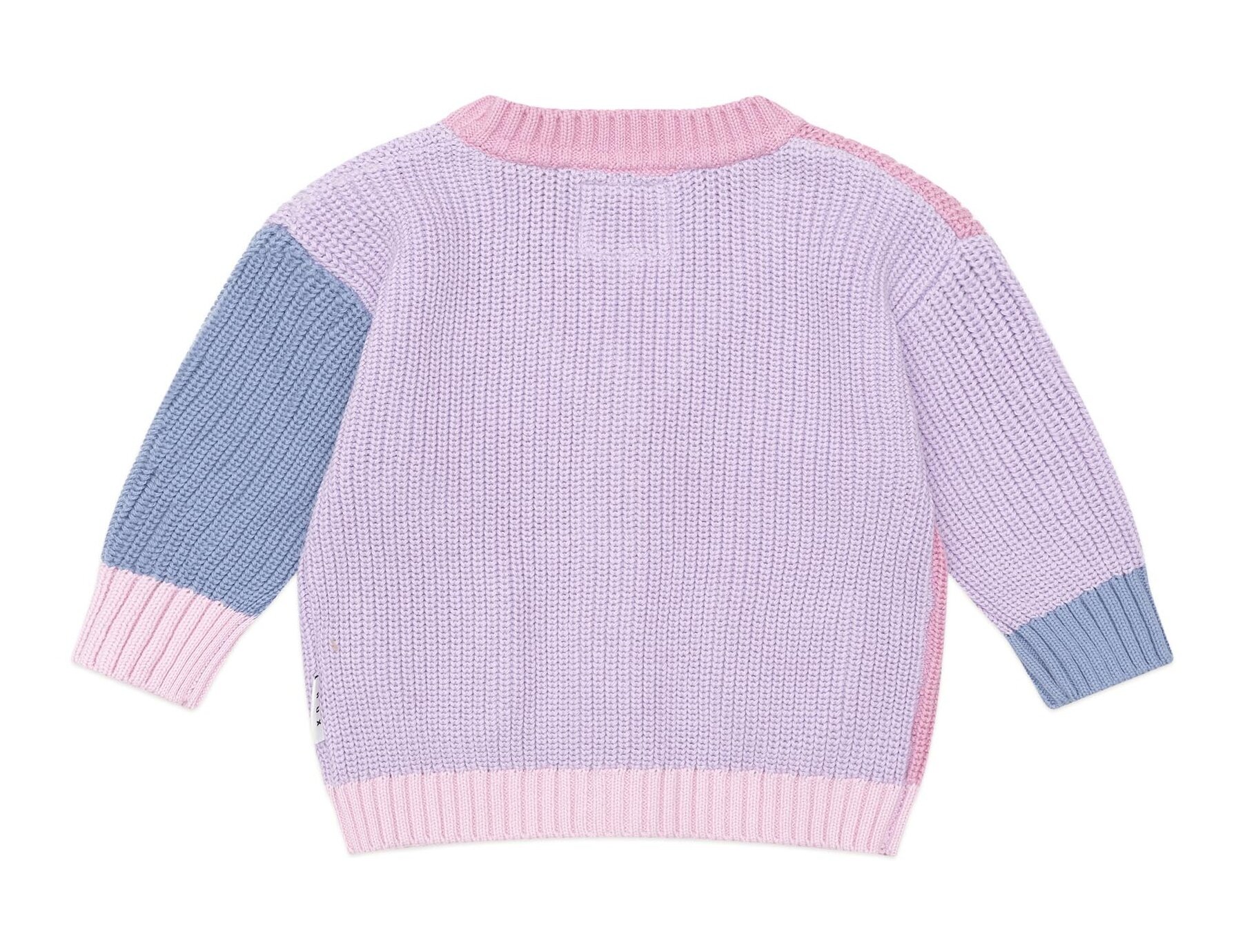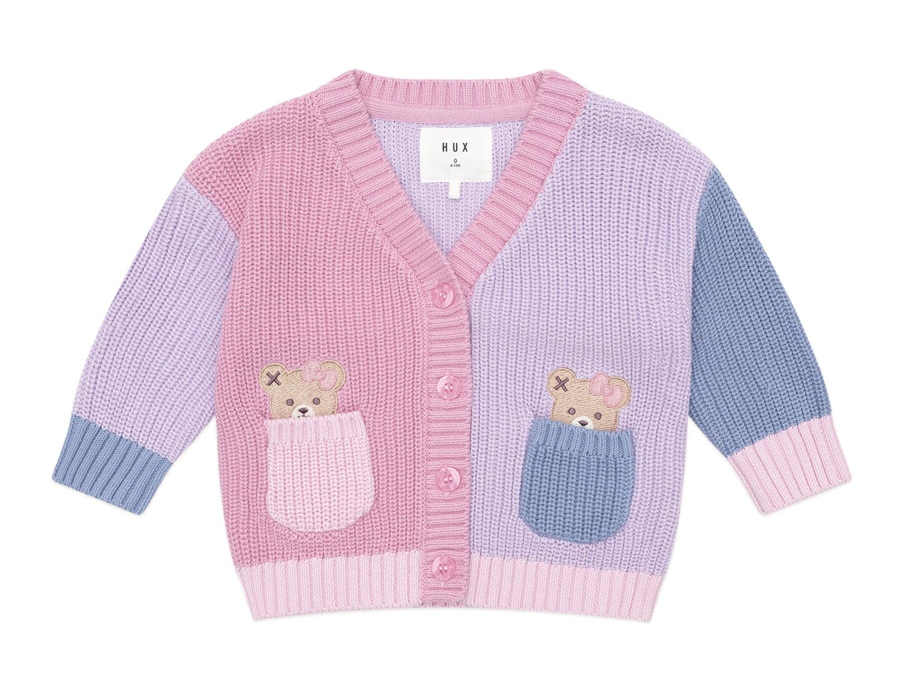 Take me back to the 90s with teh Huxbaby Peeping Pocket Girl Cardi. This nostalgic pink cardi is a colour block dream, made from organic cotton in a chunky weave for comfort and warmth. Featuring easy buttons and peeping Huxette pockets.