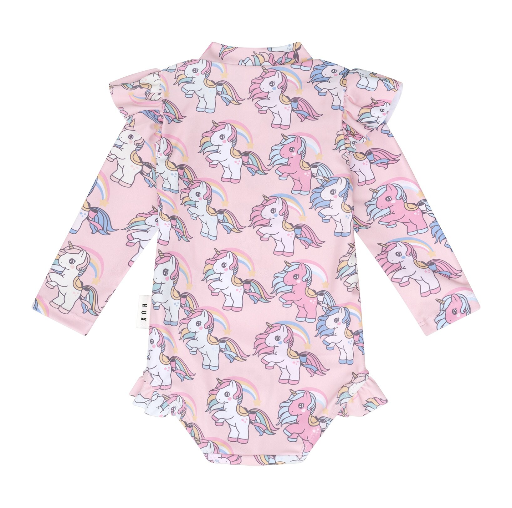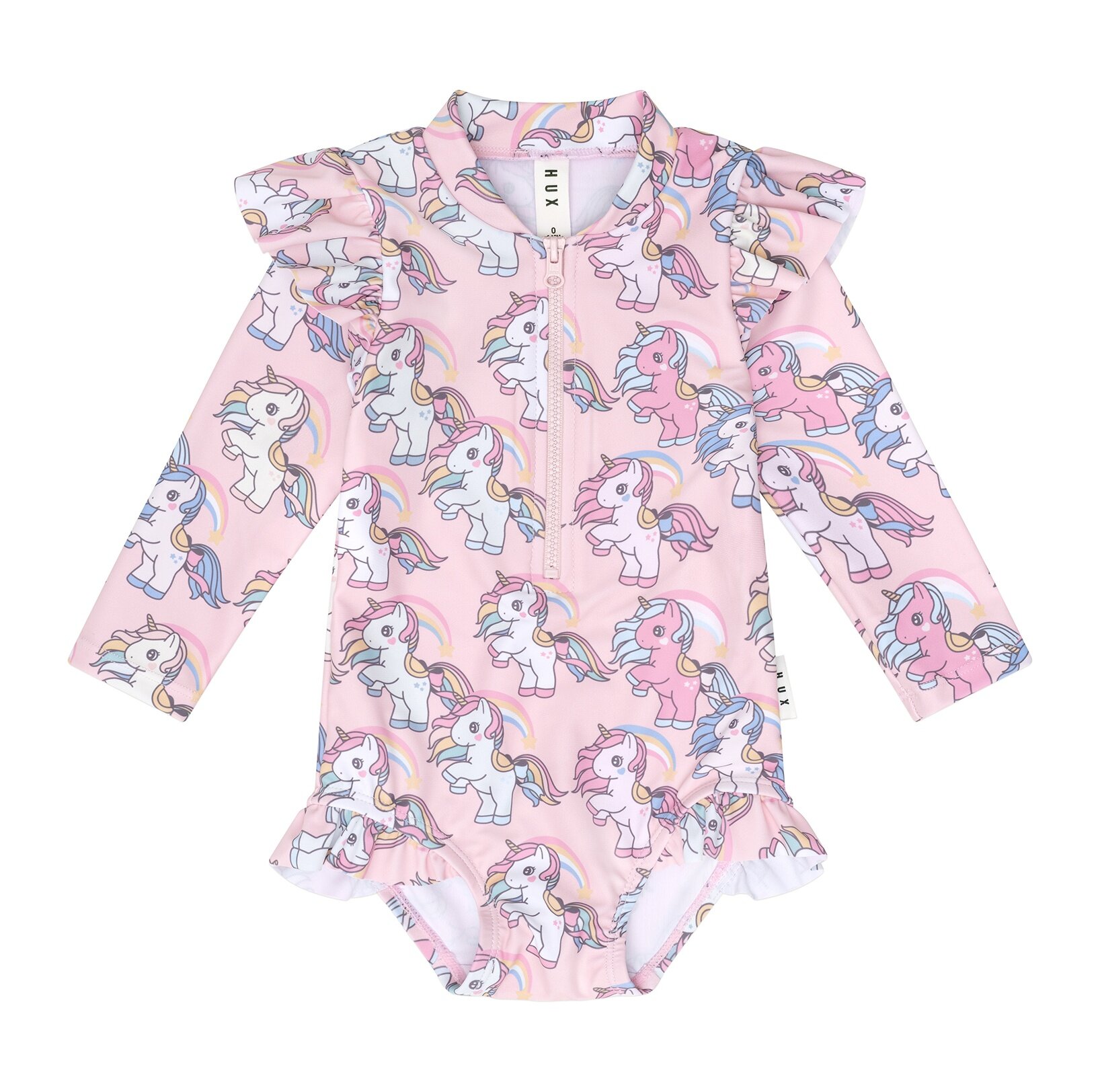 One piece long sleeve zip rashsuit with all over rainbow unicorn print and frill at shoulder and leg