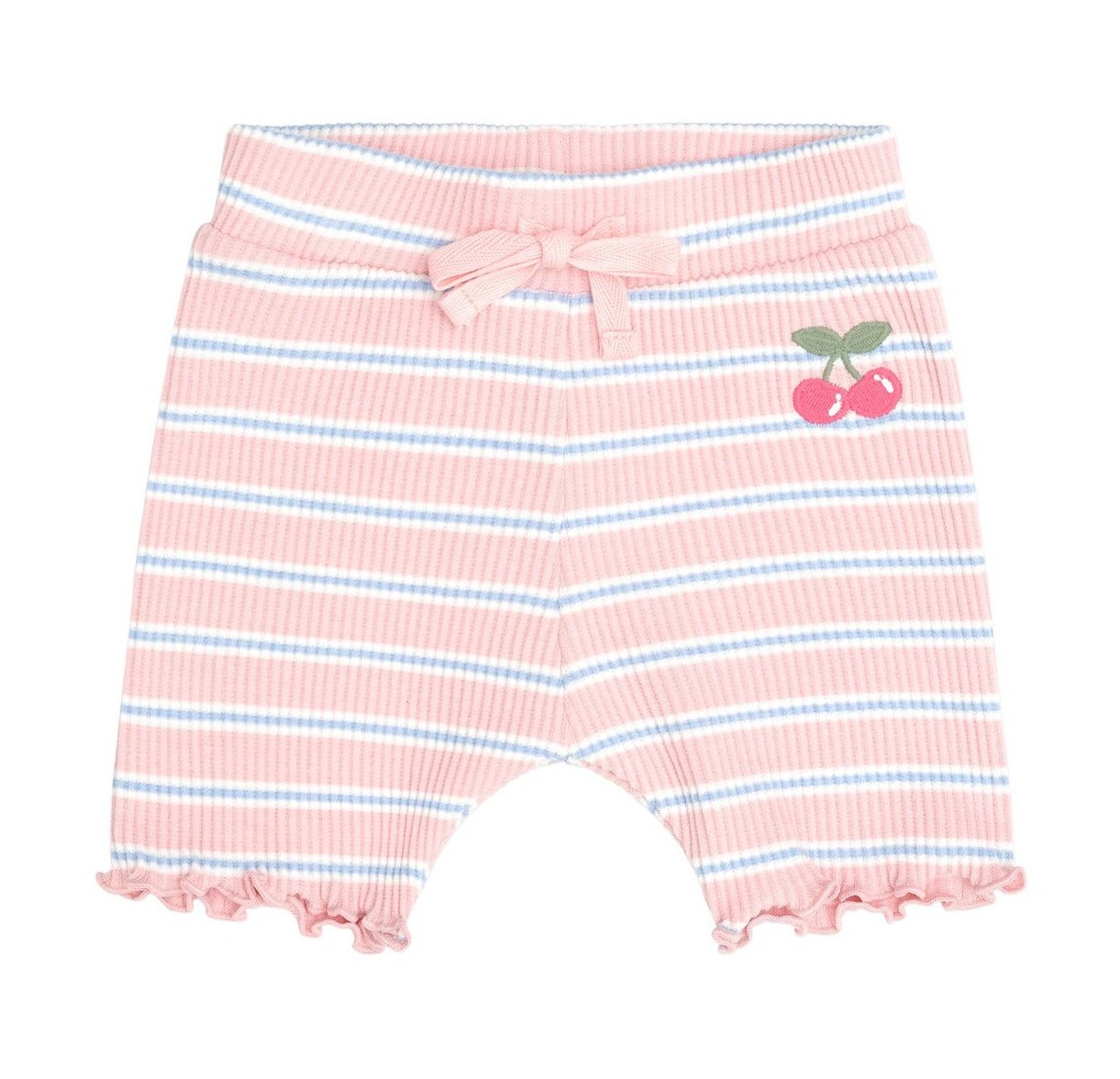 Yarn dye rib short with lettuce edge hem and cherry embroidery Features non-functional (decorative) drawstring and soft elasticised waistband Safe AZO free dyes