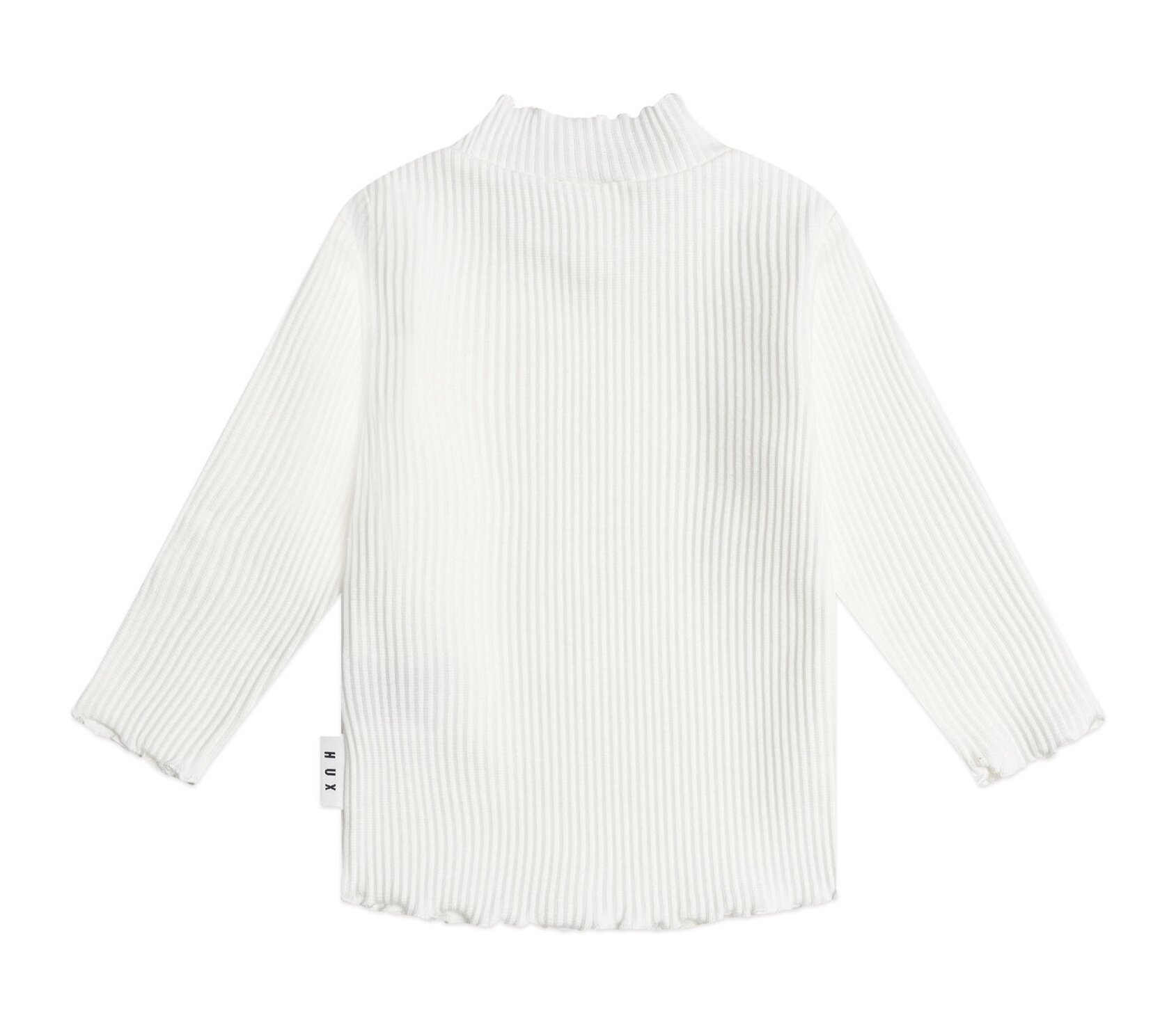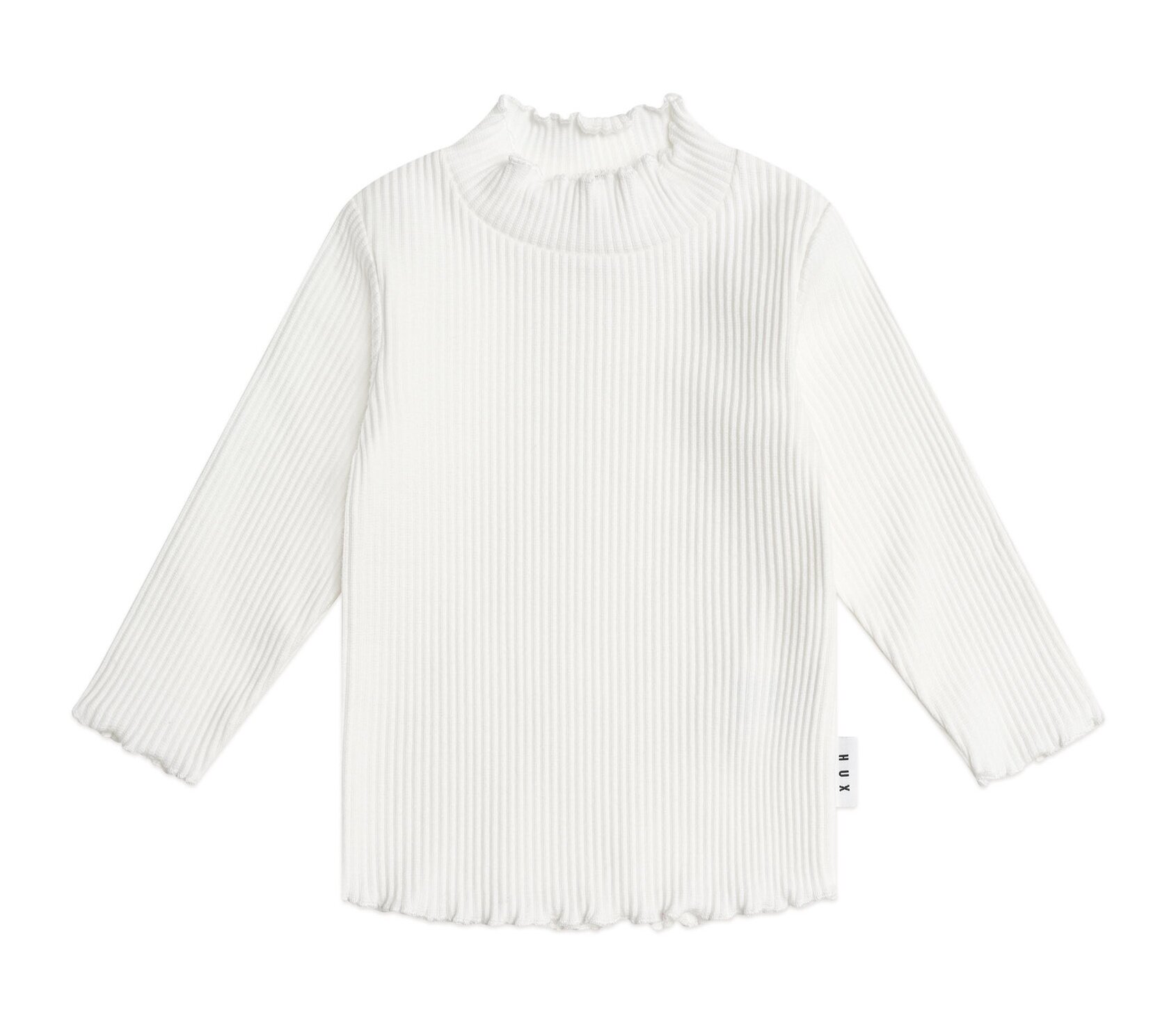 The Huxbaby Rib Skivvy is a versatile layering piece in milky white. This long-sleeved top is made from deliciously textured ribbed cotton to keep little bodies warm when it's needed, with a sweet lettuce edge detail to complete the look. A true wardrobe essential.