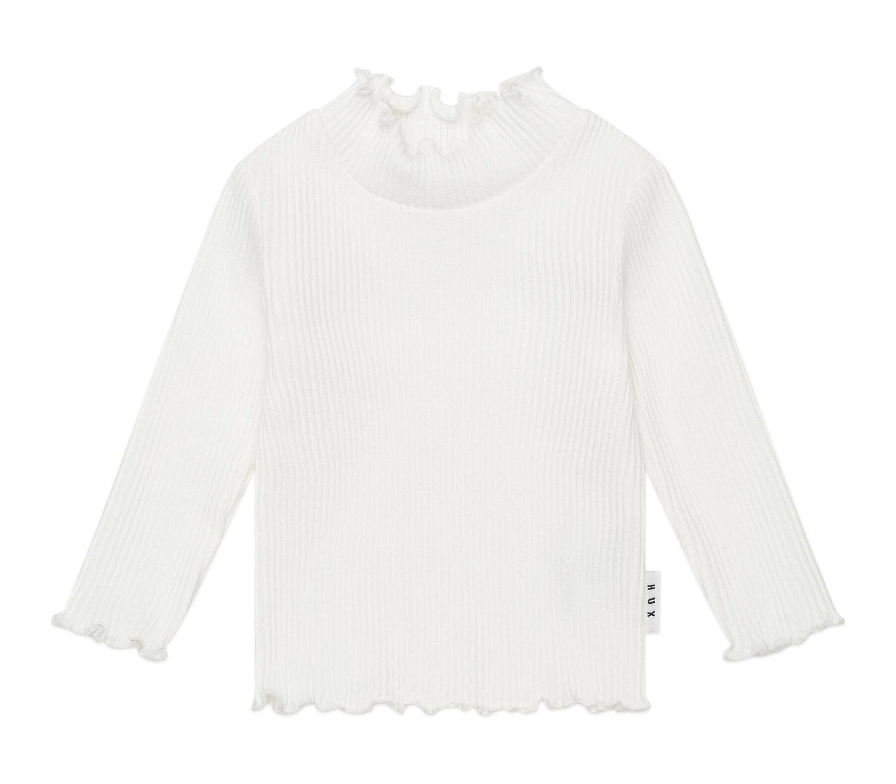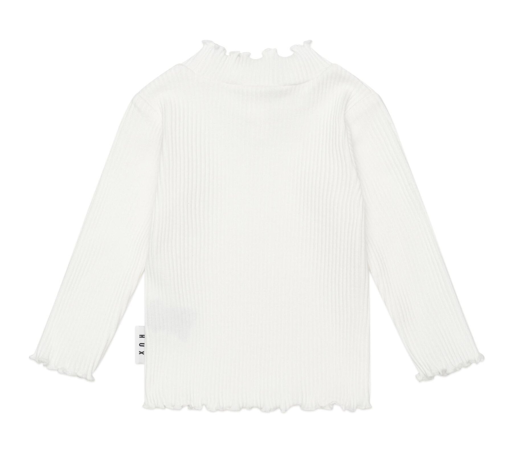 The Huxbaby Rib Skivvy is a versatile layering piece in milky white. This long-sleeved top is made from extra thick ribbed cotton to keep little bodies warm and features a sweet lettuce edge detail to complete the look. A true wardrobe essential.