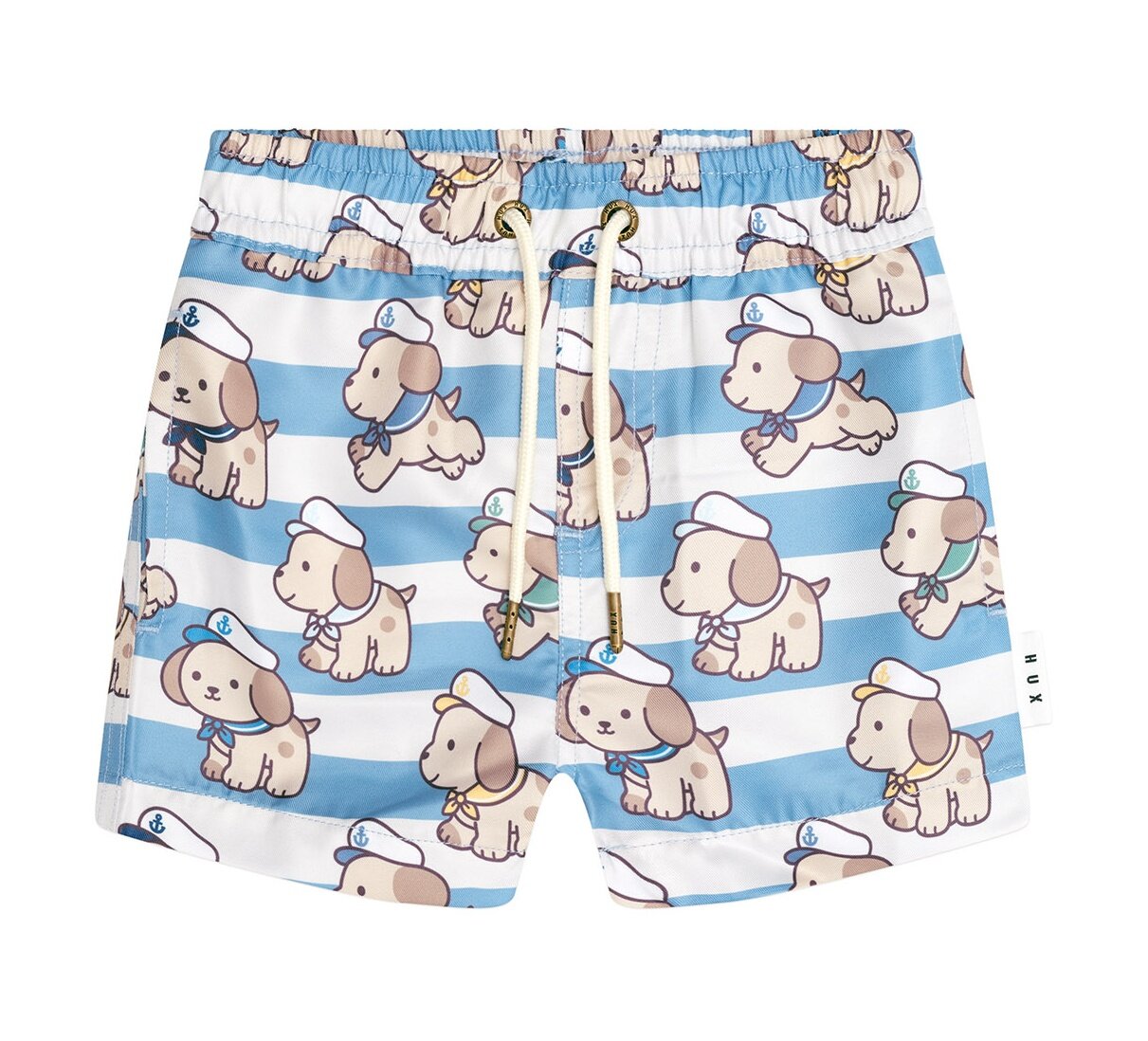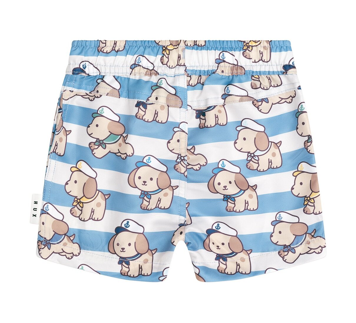 Swim shorts with all over sailor pup print, side pockets and adjustable drawstring
