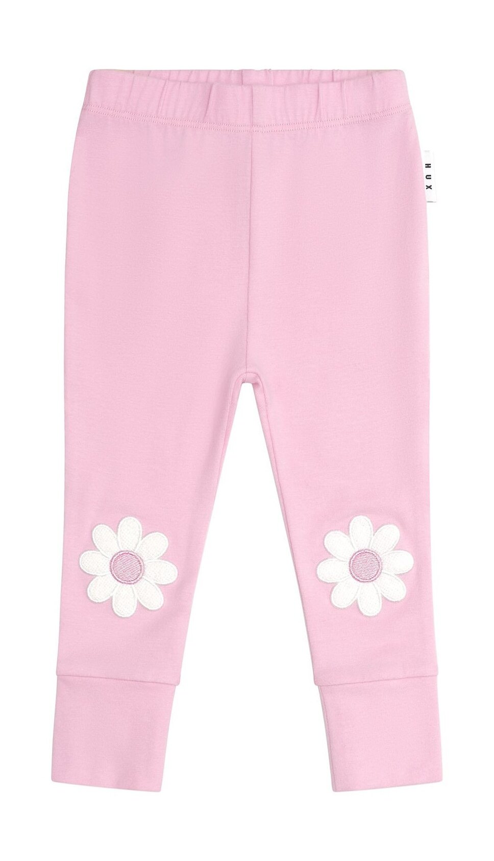 Super soft, premium organic cotton jersey leggings by Huxbaby, with daisy applique to knees. Features gorgeous lilac lurex thread detailing and soft, elasticised waistband that is gentle on little tummies. Made from GOTS certified organic cotton and sustainably produced using safe AZO free dyes.