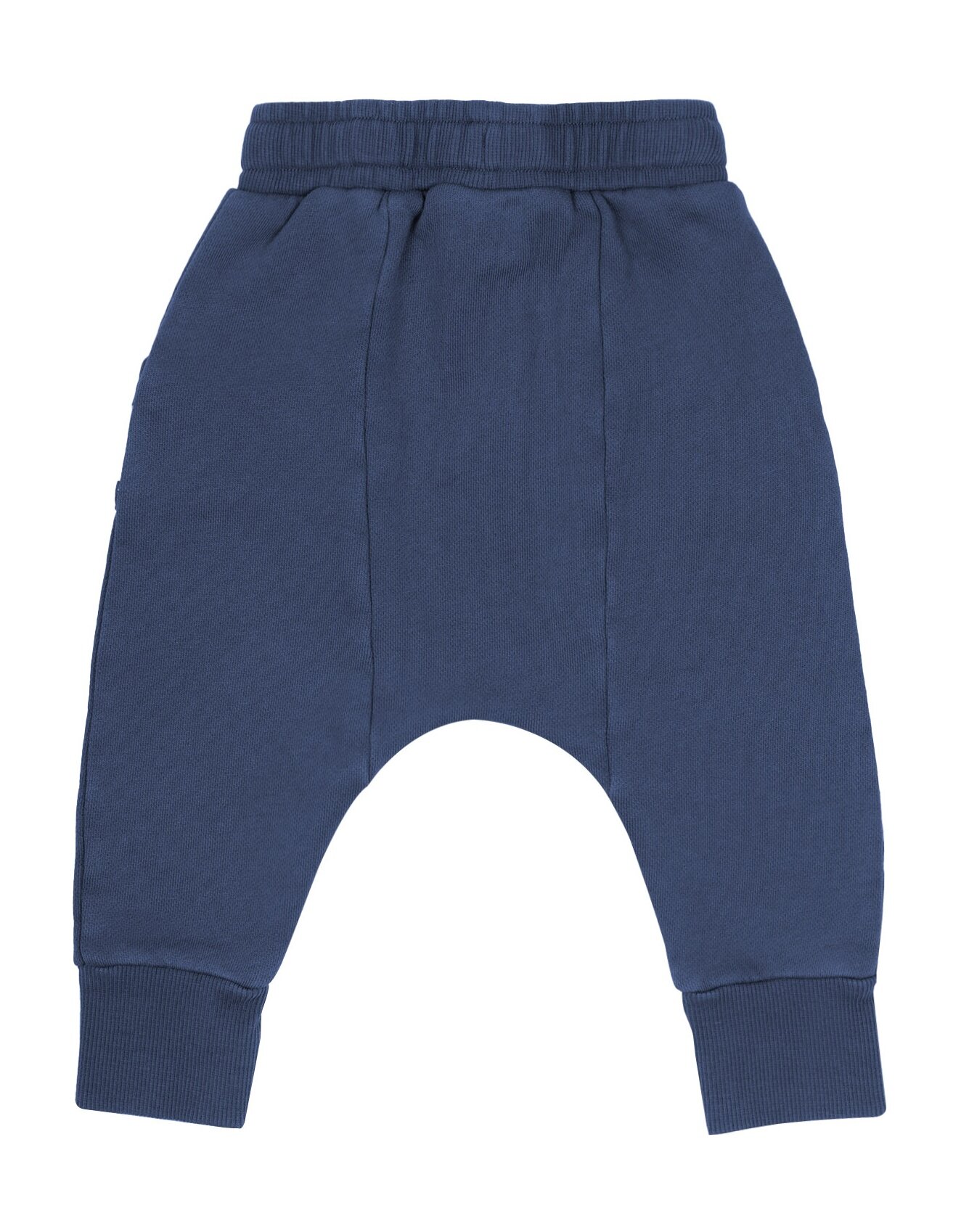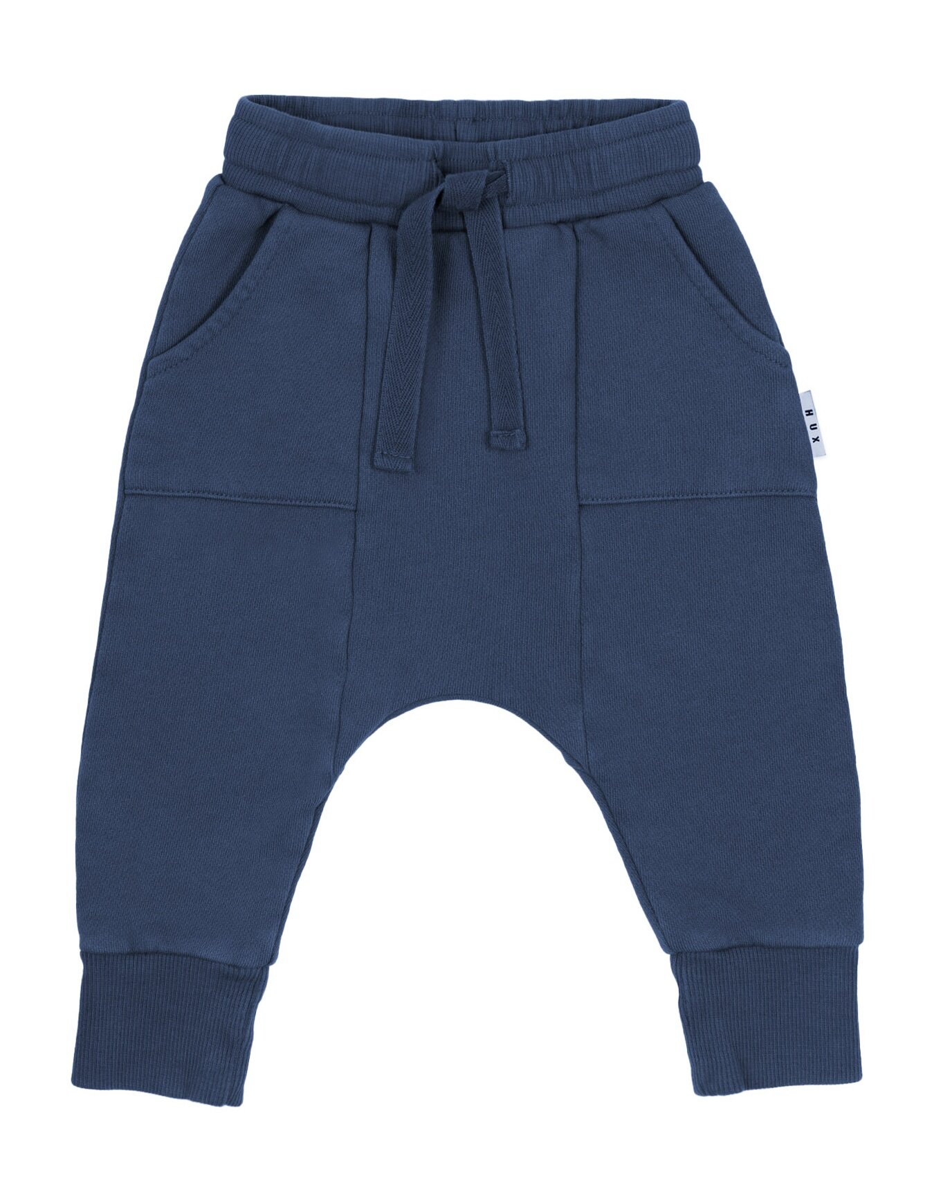 The Huxbaby Slouchy Trackpants with Pockets are a cushiony-soft pair of organic cotton pants, in a vintage-look, drop-crotch style. Made from terry towelling, these garment dyed navy pants truly go with everything. We designed them with an adjustable drawstring, a soft waistband and extra roomy patch pockets (the perfect place for stashing treasures).