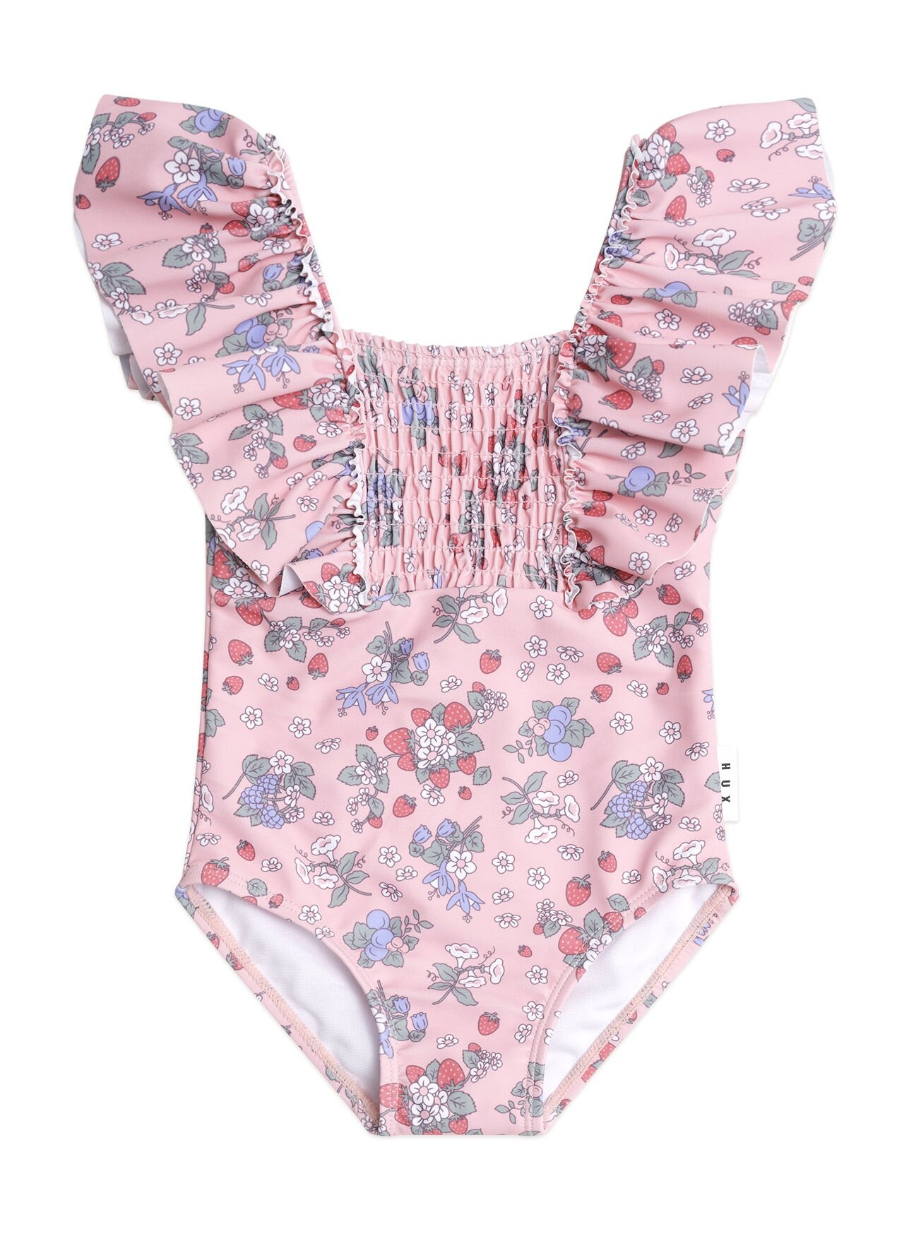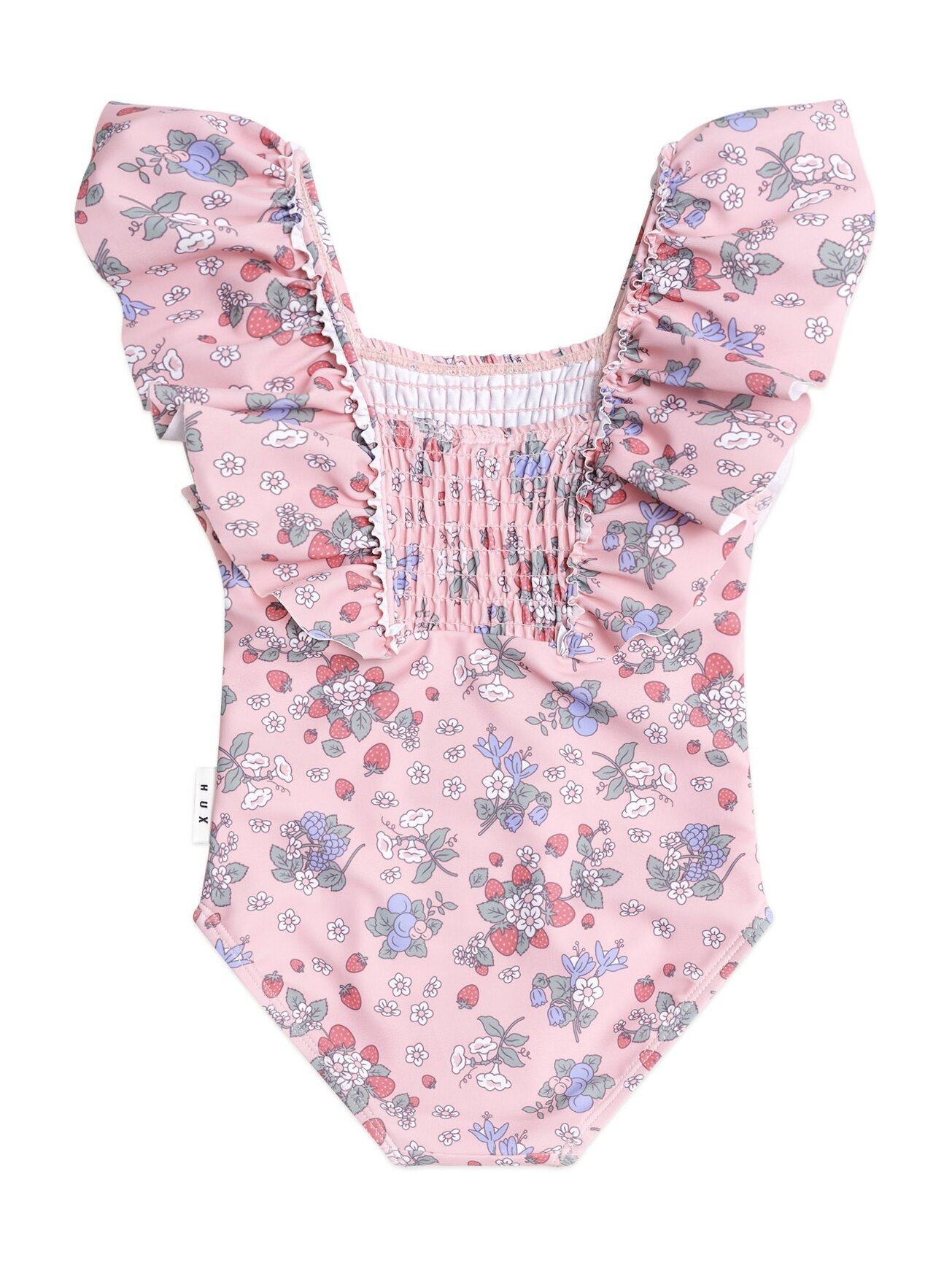 The Huxbaby Strawberry Garden Shirred Swimsuit is a one piece frill sleeve swimsuit is rated UPF 50+, which is the highest achievable sun protective rating for fabrics. Consciously crafted with recycled polyester, it features a shirred bodice and oversized frill sleeves to cover the shoulders - an adorable pair of togs thay'll wear on repeat.