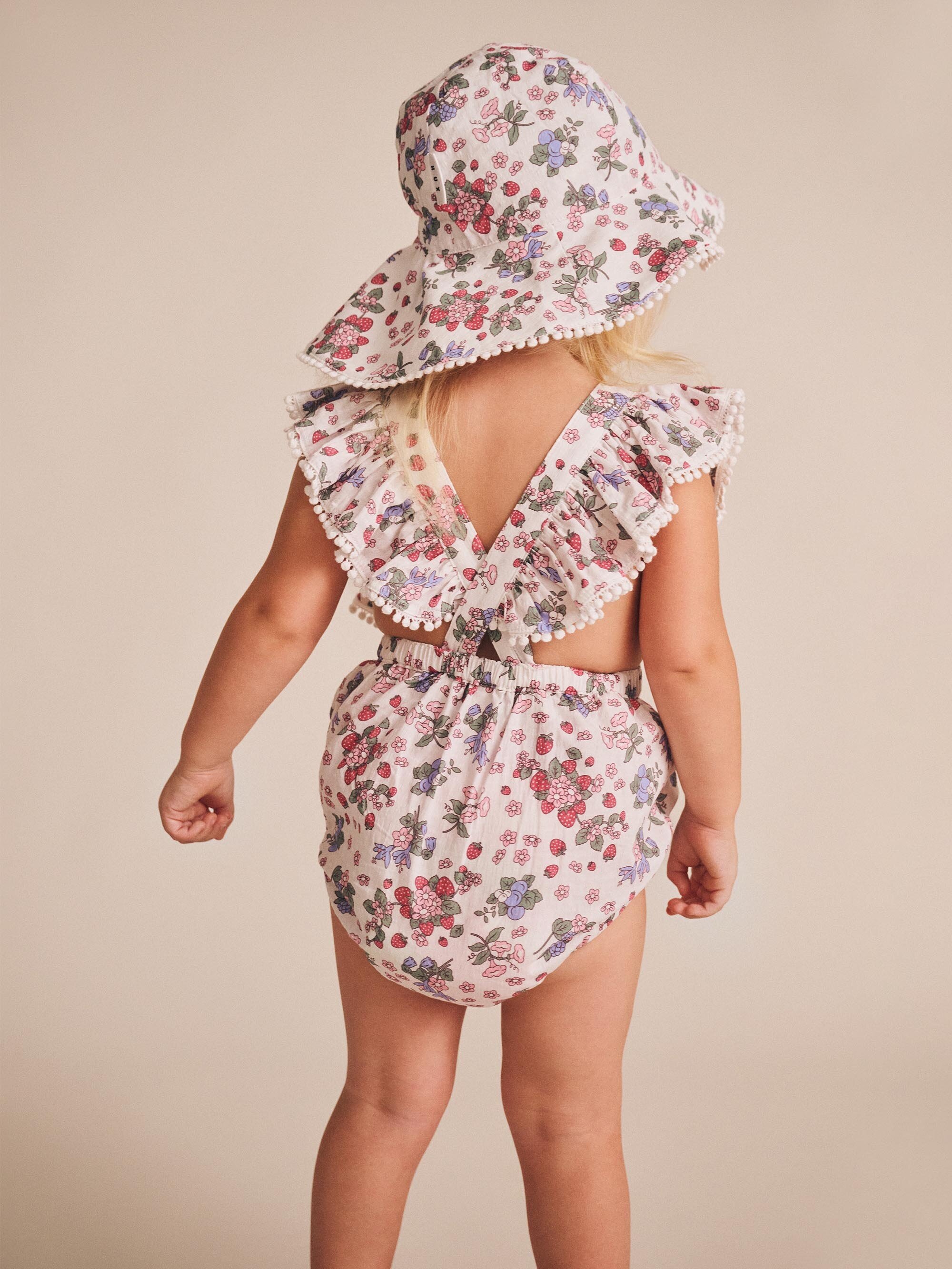 The Huxbaby Strawberry Garden Sunhat is a hat they’ll actually want to wear. This wide brim sun hat is practical and pretty. Made from breathable organic cotton, it features a sweet strawberry garden print and wider brim for extra sun protection. Adjustable chin strap to prevent from flying away. Perfect to pair with the Strawberry Garden Tiered Smock Dress.