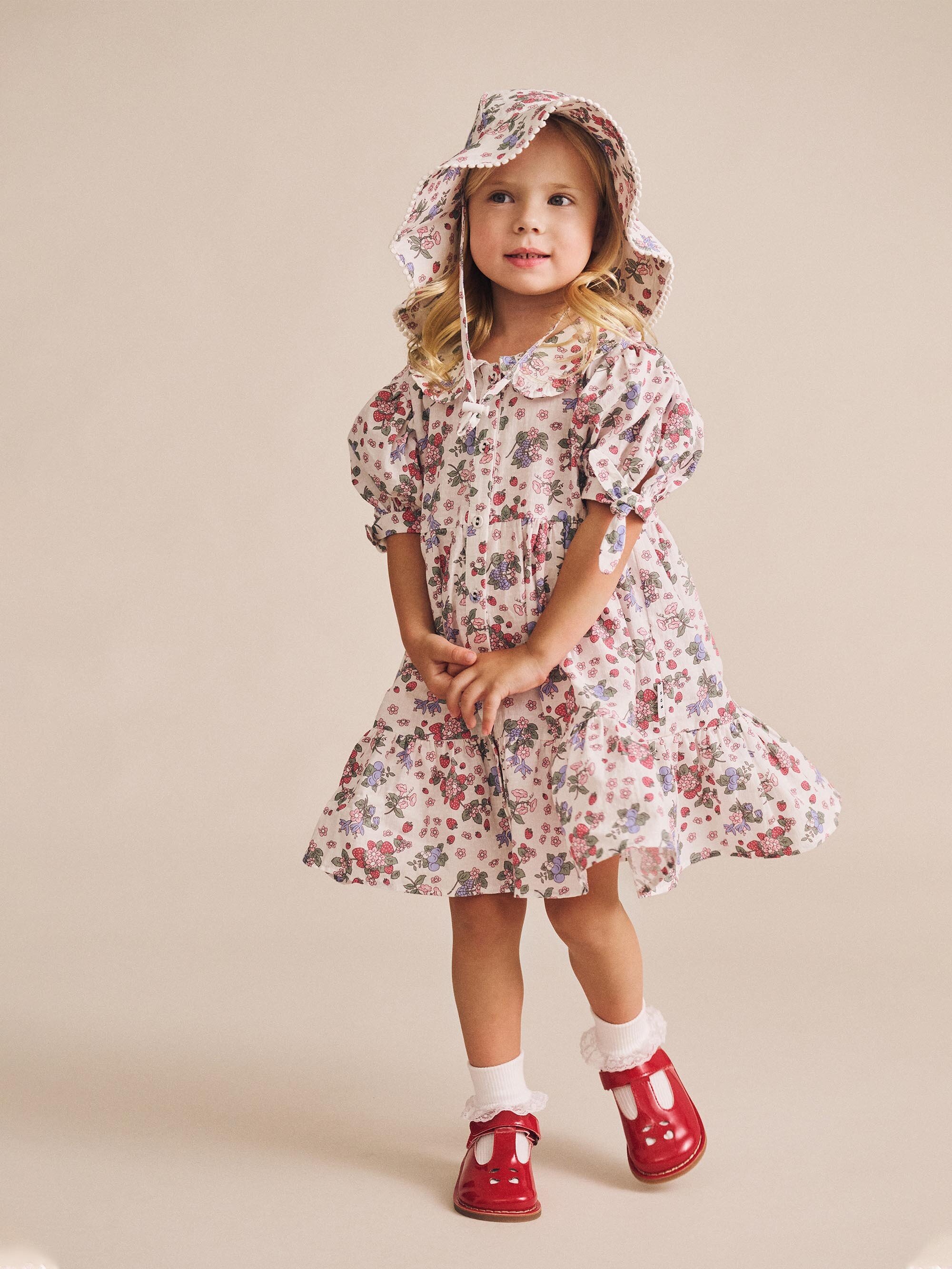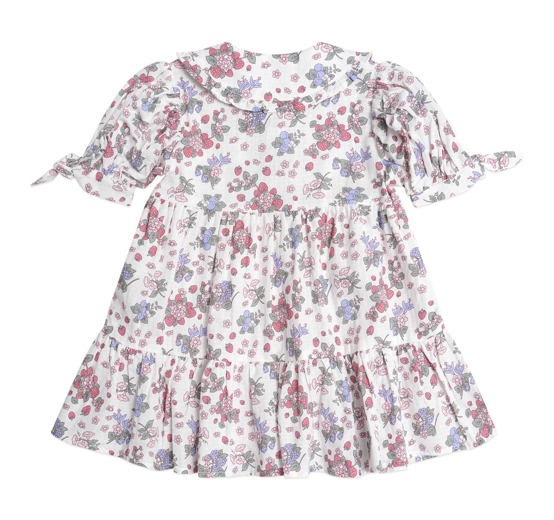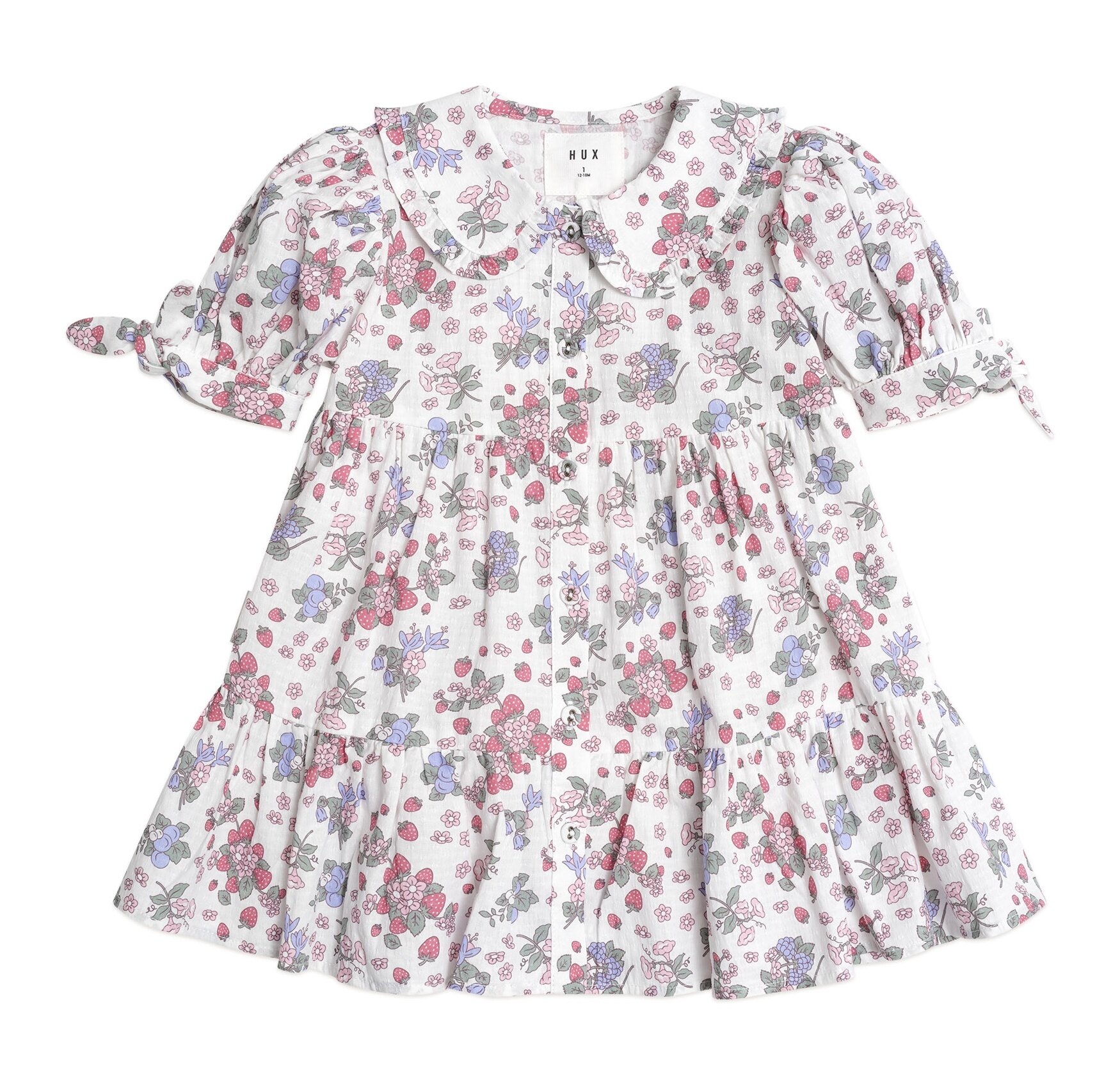 Party dress perfection! The Huxbaby Strawberry Garden Tiered Smock Dress is the strawberry floral dress of the season. Made from 100% organic cotton, it features a peter pan style frilly collar, fabric buttons, a full, tiered skirt and exaggerated puff sleeves. A dress so pretty and so comfy, they'll want to wear it everywhere!