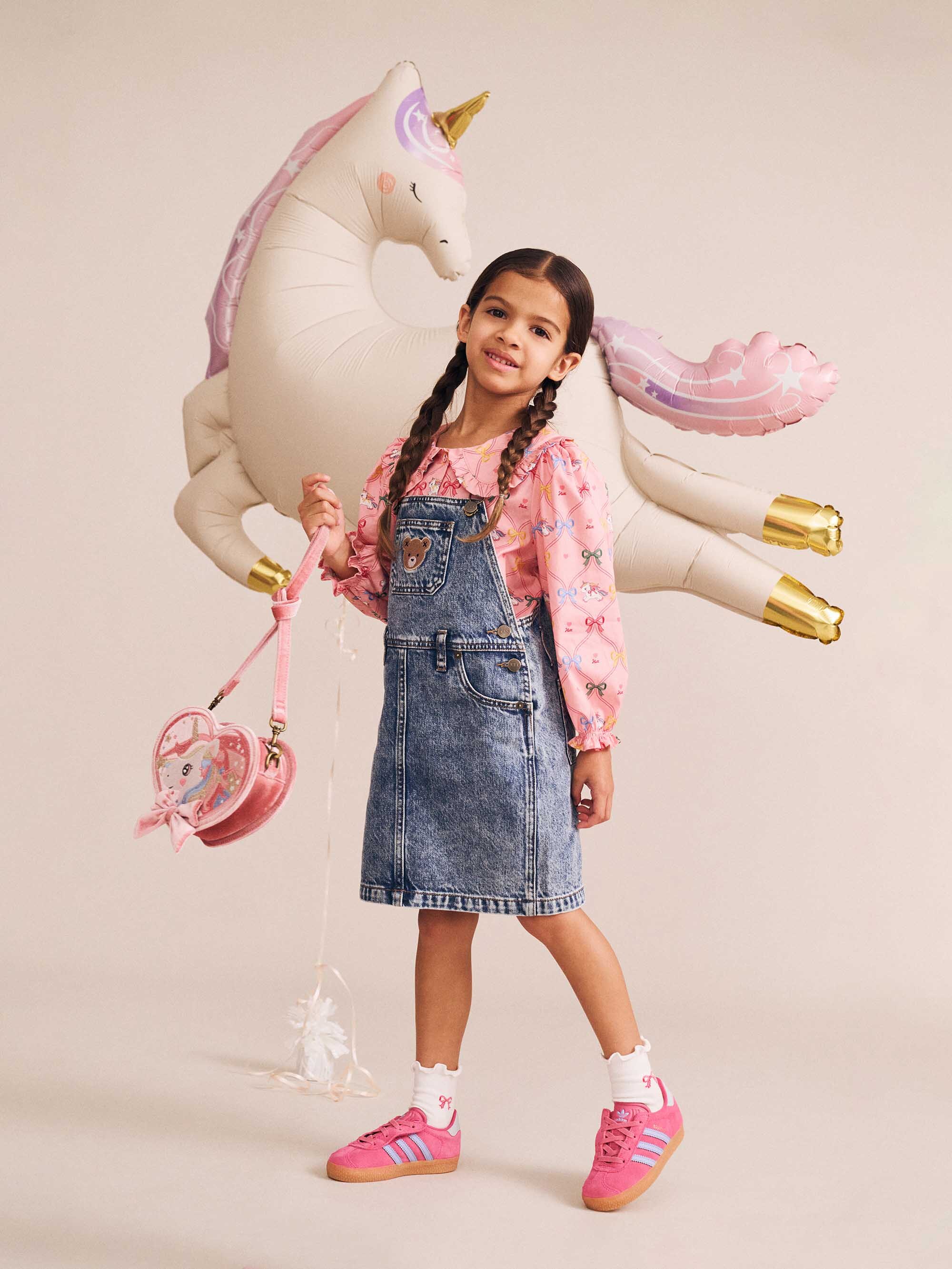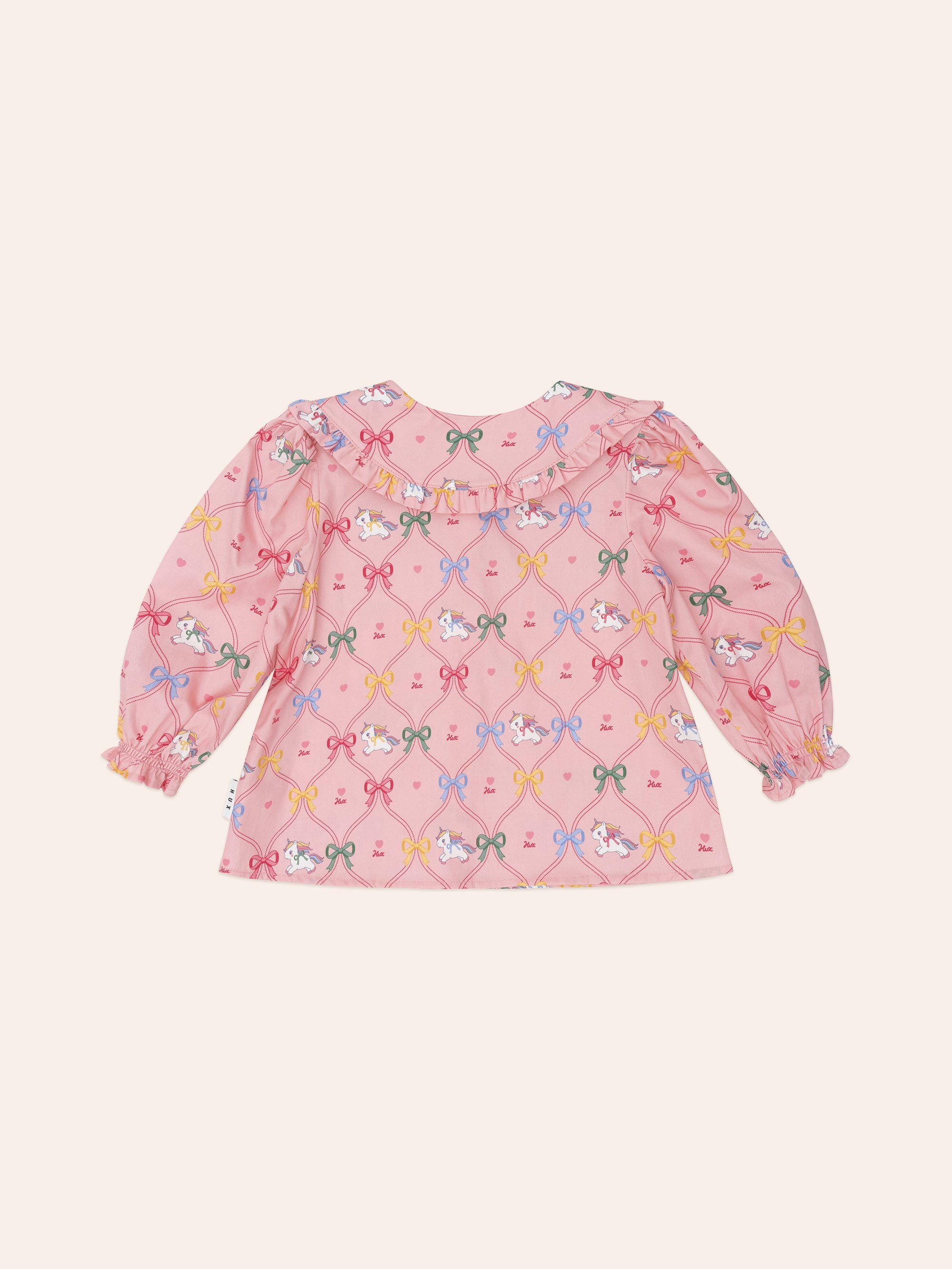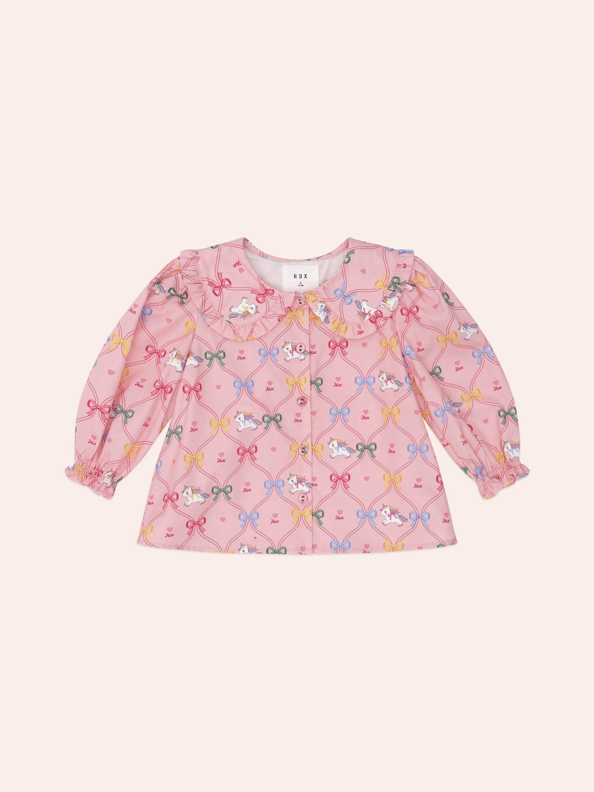 The Huxbaby Unicorn Bow Blouse is the perfect blouse. Made from super soft, lightweight organic cotton, it features puff sleeves, buttoned front, frilly collar, and magical unicorn print. Wear it alone or layer it with a pinafore.