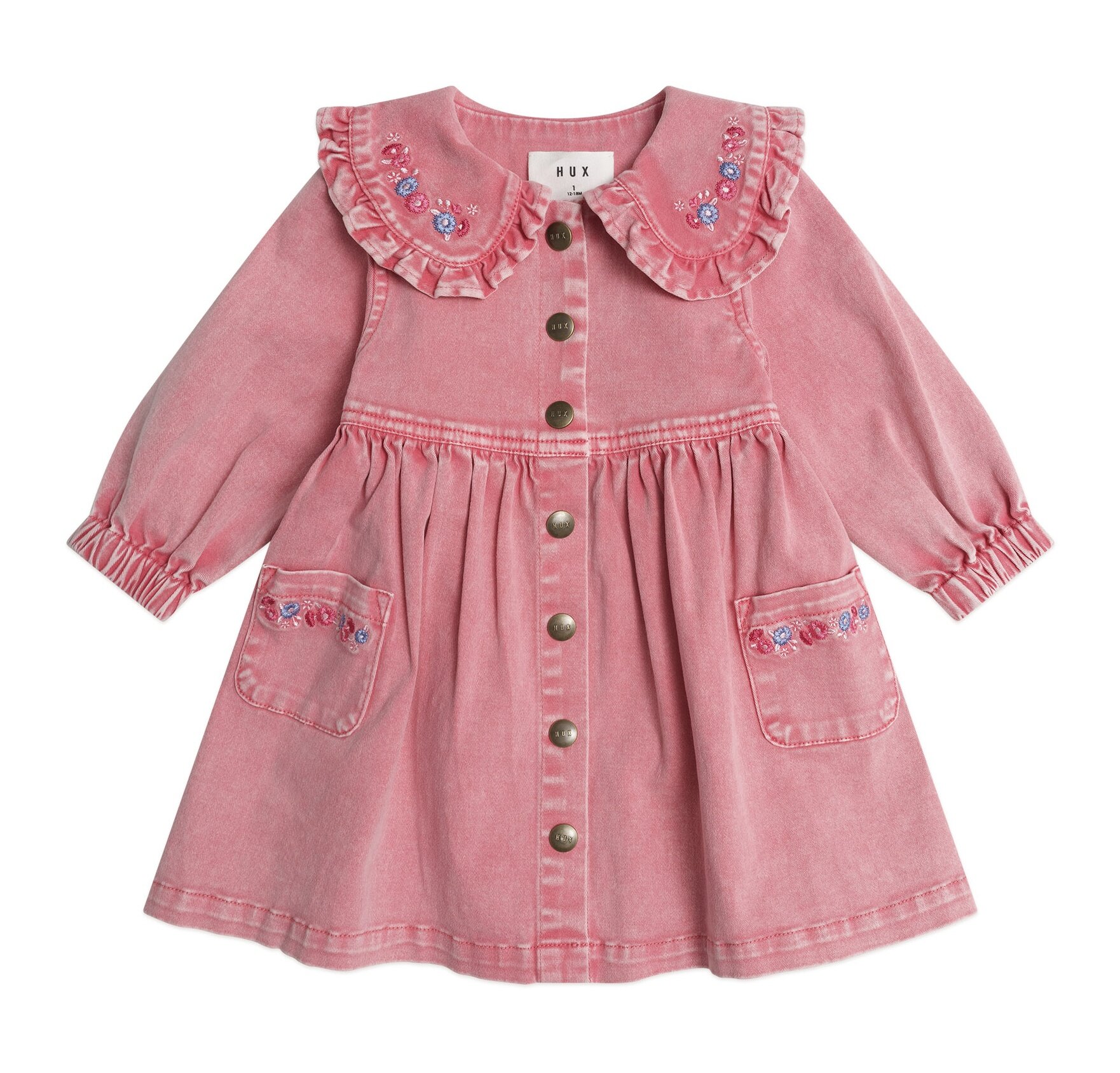 The Huxbaby Vintage Floral Collar Dress is the sweetest classic vintage style frill dress. Made from soft cotton twill, it features a peter pan style frilly collar with floral embroidery detail, button down snaps, a full, tiered skirt and exaggerated puff sleeves. Just right for every occasion.