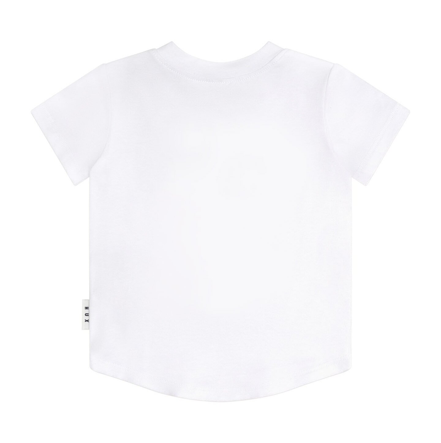 Super soft, premium organic cotton jersey t-shirt with vintage Hux applique Baby sizes have stainless steel snaps at shoulder opening Made from GOTS certified organic cotton Sustainably produced Safe AZO free dyes