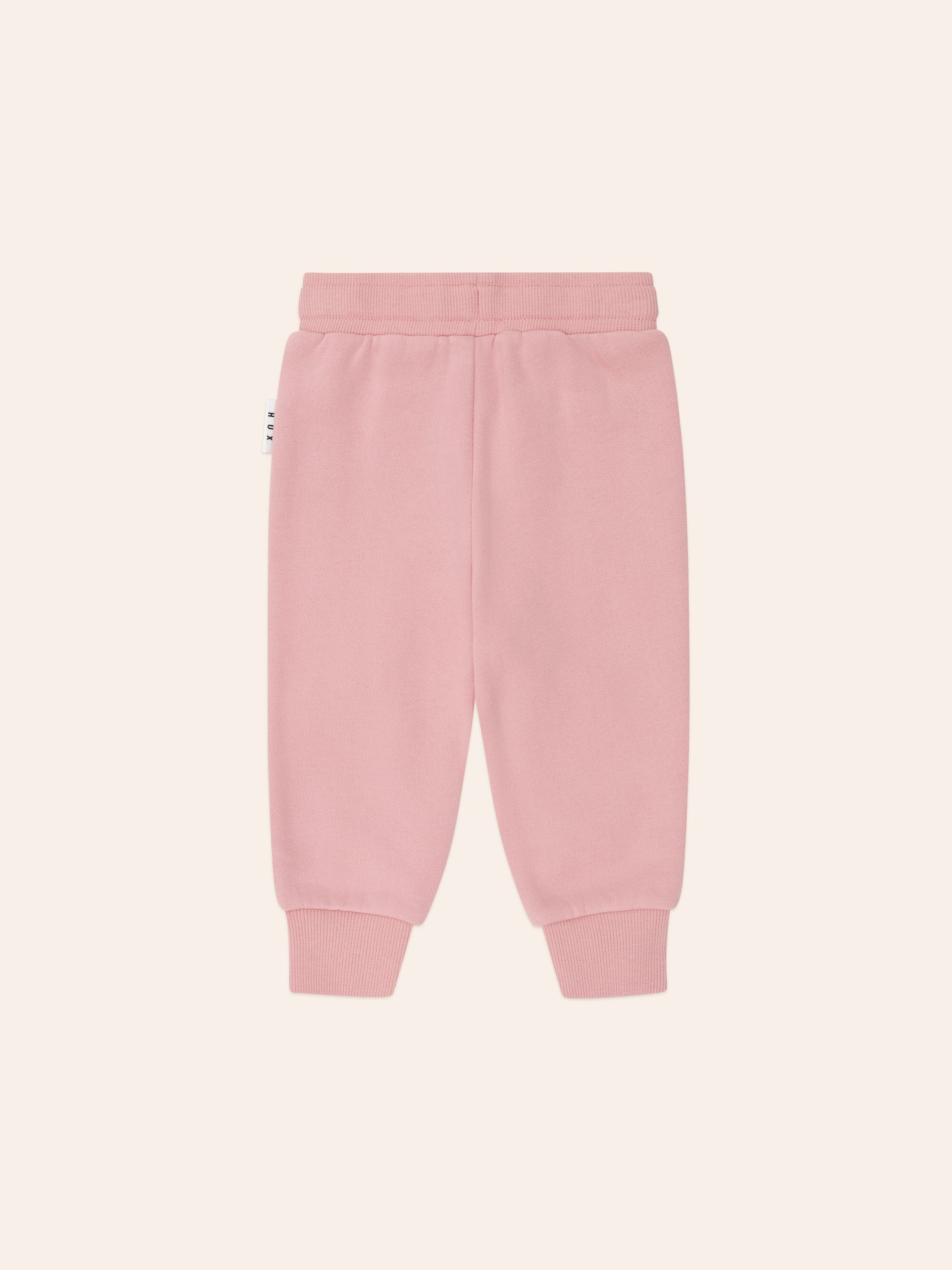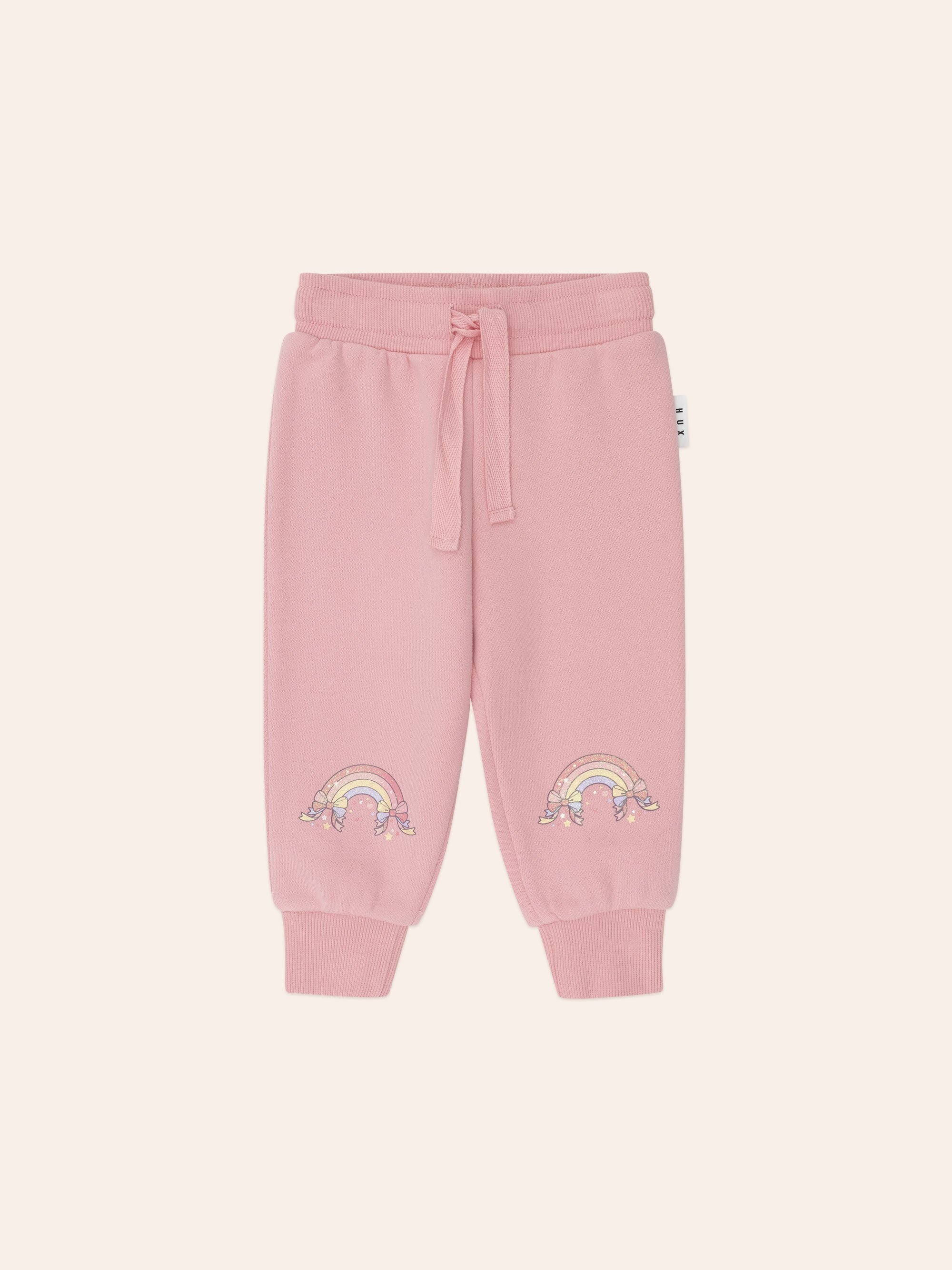 The Huxbaby Whimsical Rainbow track pants feature a functional drawstring for an adjustable fit, rainbow embroidery on the knees and a soft, stretchy waistband to keep little tummies snug. Made for all day play.