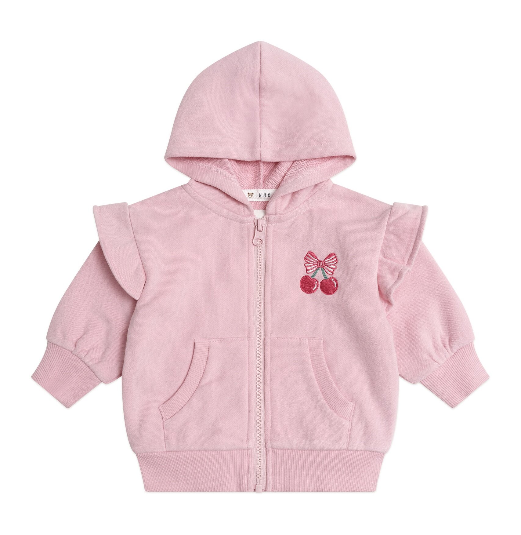 The Huxbaby Zip Up Frill Hoodie is an everyday essential. Made from incredibly cosy cotton terry in a dreamy apricot pink hue, it has an oversized slouchy fit, a cherry embroidery and handy pockets perfect for stashing snacks in.