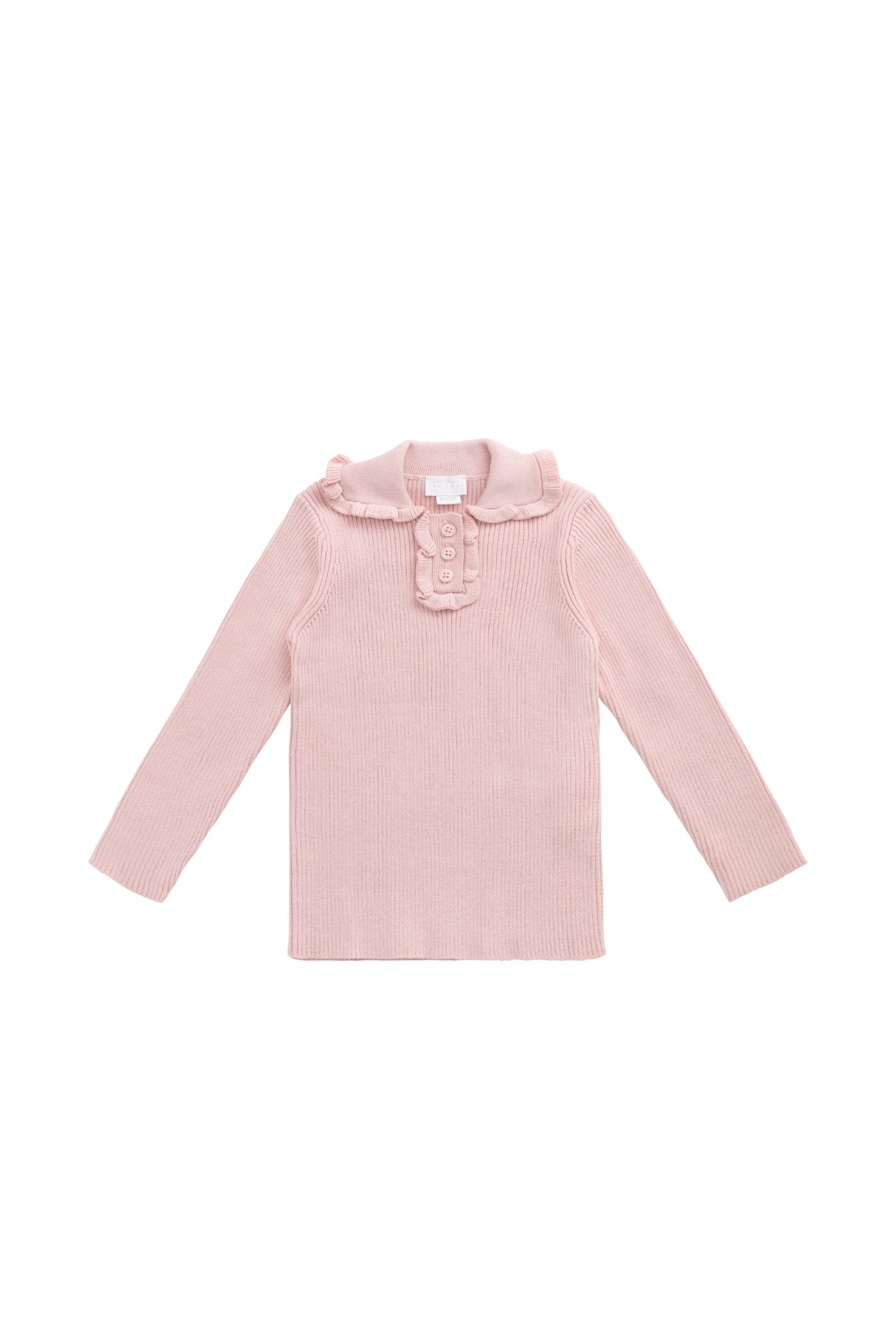 The Jamie Kay Cleo Top is a beautifully knitted piece in a soft blush pink hue, featuring a delicate ribbed texture and a dainty ruffled collar. With its classic button placket and timeless silhouette, this top adds a touch of elegance to your little one’s wardrobe—perfect for layering or wearing on its own.