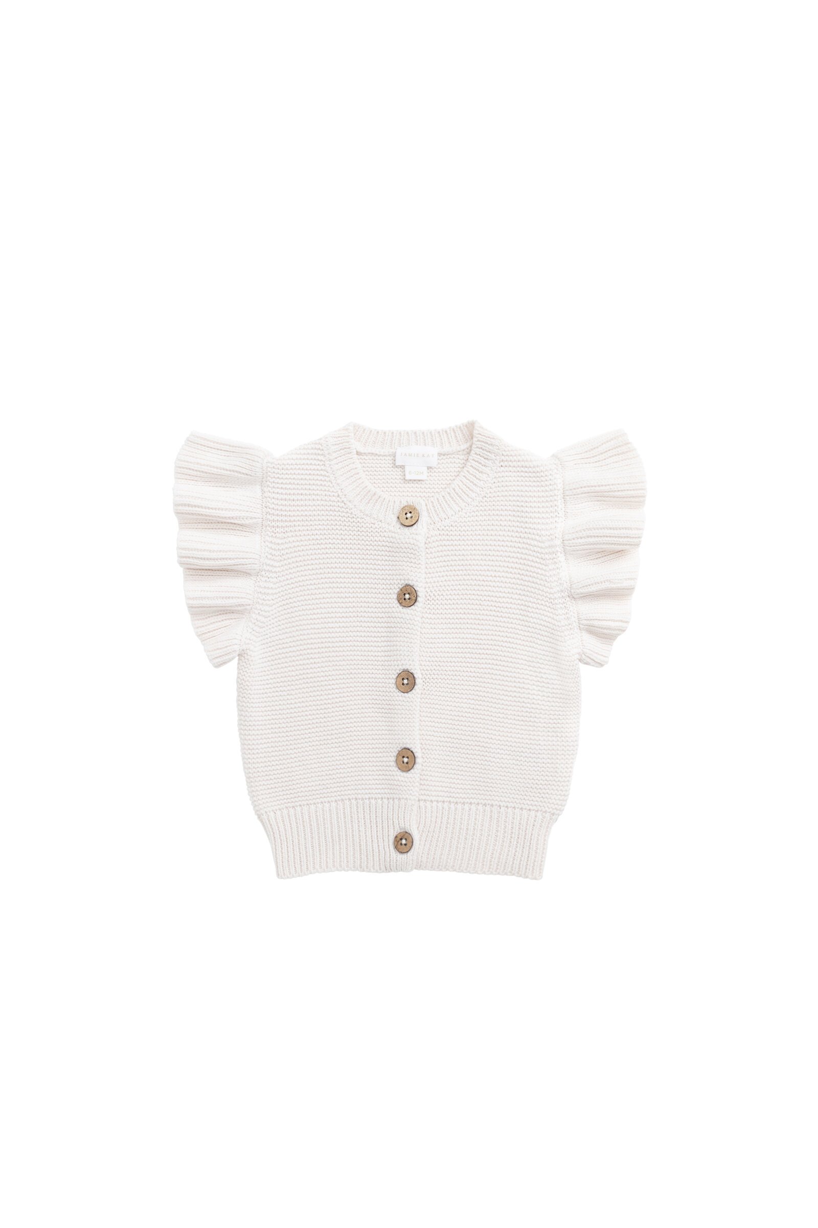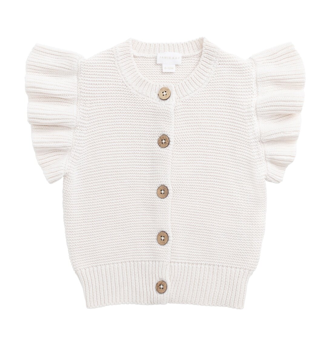 The Jamie Kay Elise Vest is a beautifully knitted cardigan-style vest in a soft pink hue. Featuring short ruffled sleeves, a round neckline, and five coconut buttons down the front, this piece adds a touch of charm and warmth to any outfit. Perfect for layering over dresses or tops, it’s a versatile addition to your little one’s wardrobe.